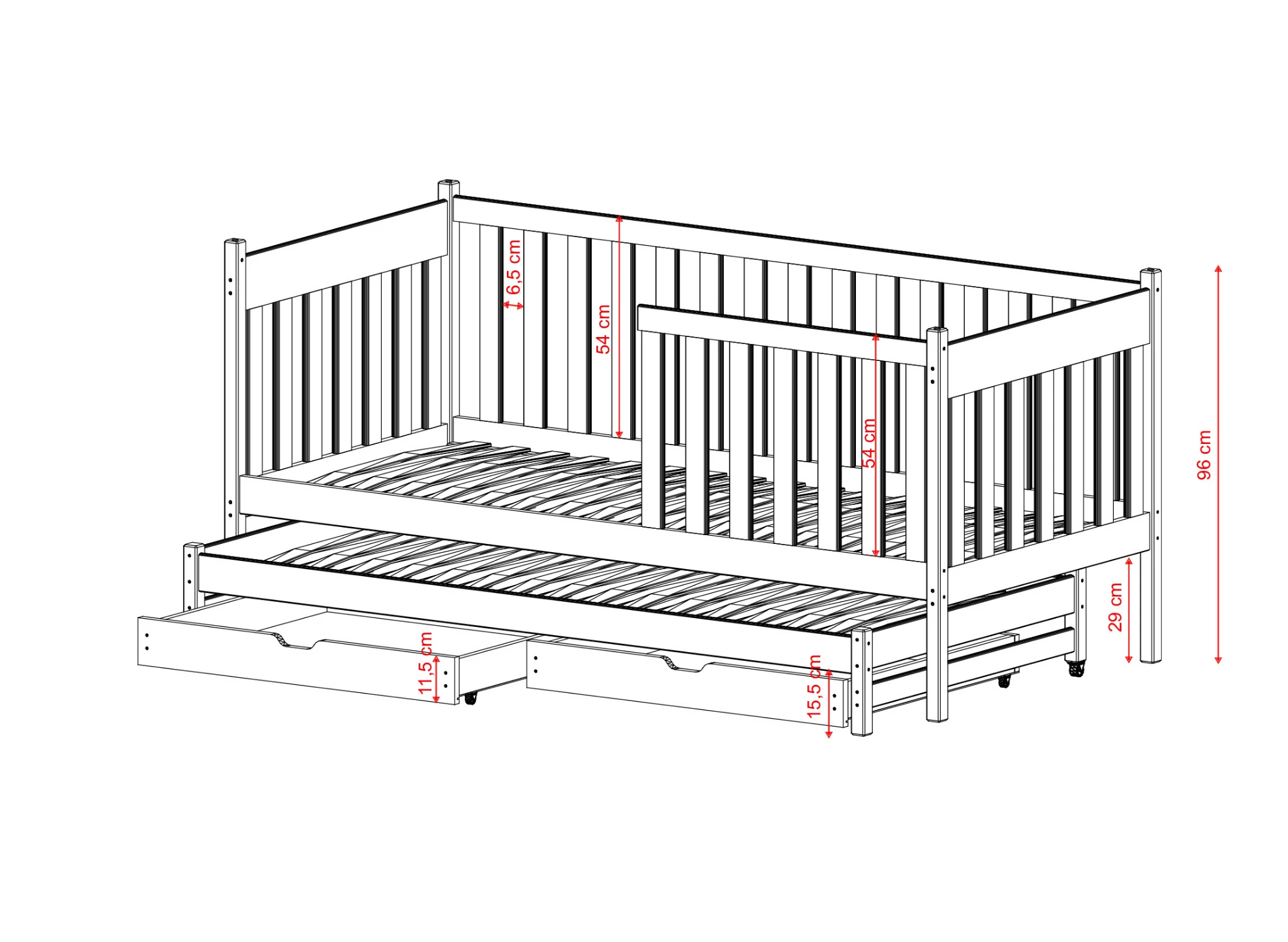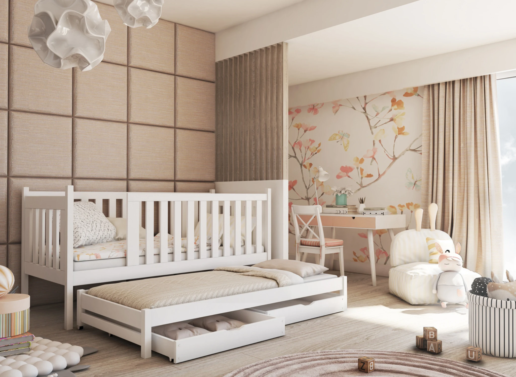 Pour rendre le lit superposé bas KAJA encore plus fonctionnel, optez pour des tiroirs coulissants. Ils offrent un espace de rangement supplémentaire pour les vêtements, les jouets et la literie. Les tiroirs sont spacieux et fonctionnent indépendamment, permettant à chaque enfant d'avoir le sien. Le lit superposé bas KAJA est fabriqué en bois de lit non naturel, un matériau extrêmement solide et résistant. La construction du lit extensible KAJA est durable et supporte bien les petites et grandes charges, garantissant une utilisation prolongée par vos enfants pendant de nombreuses années.