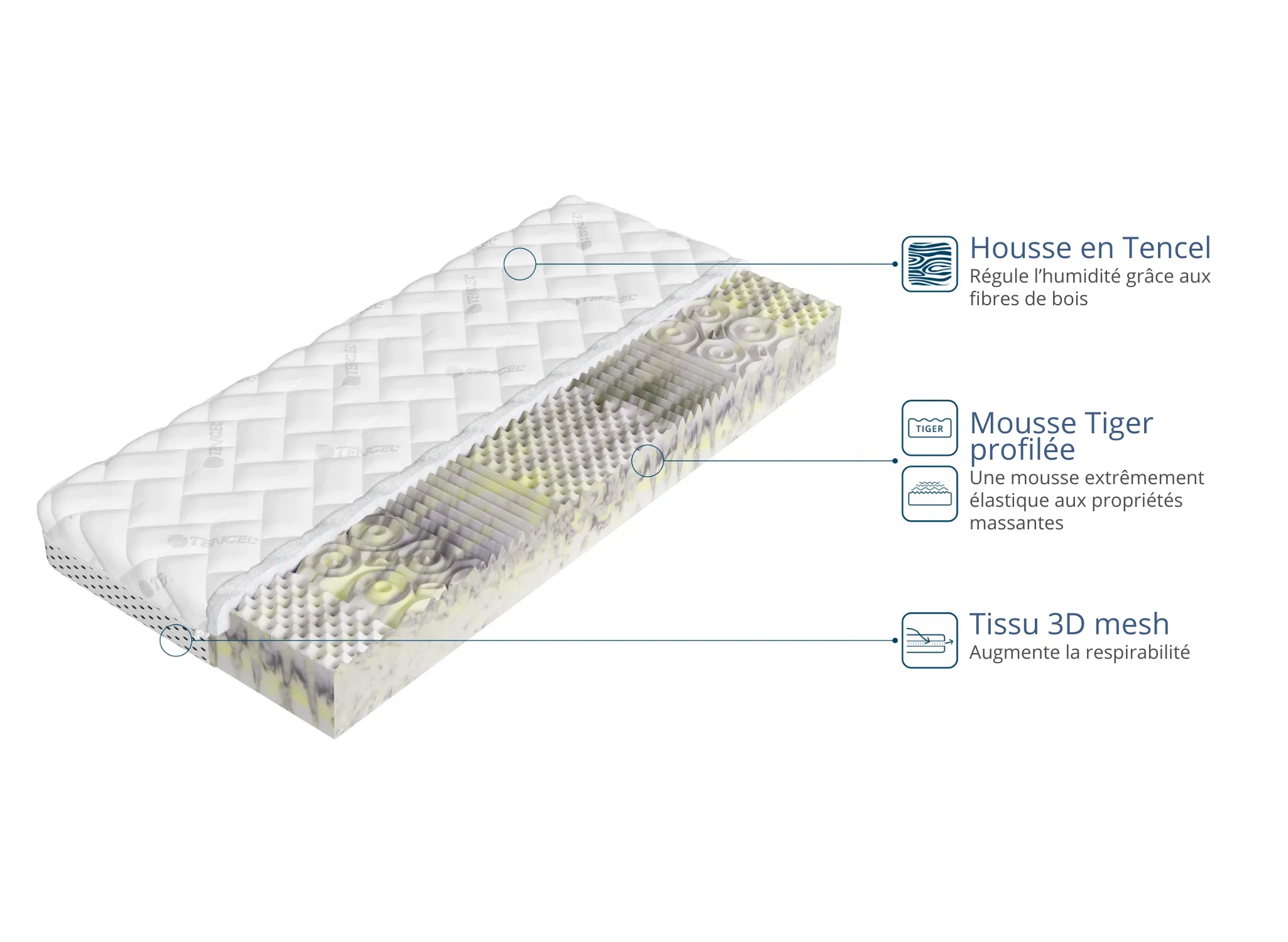 | Remplissage | Housse Tencel + maille 3D, Mousse HR tiger 12 cm, Mousse moletée - massante 1 cm |