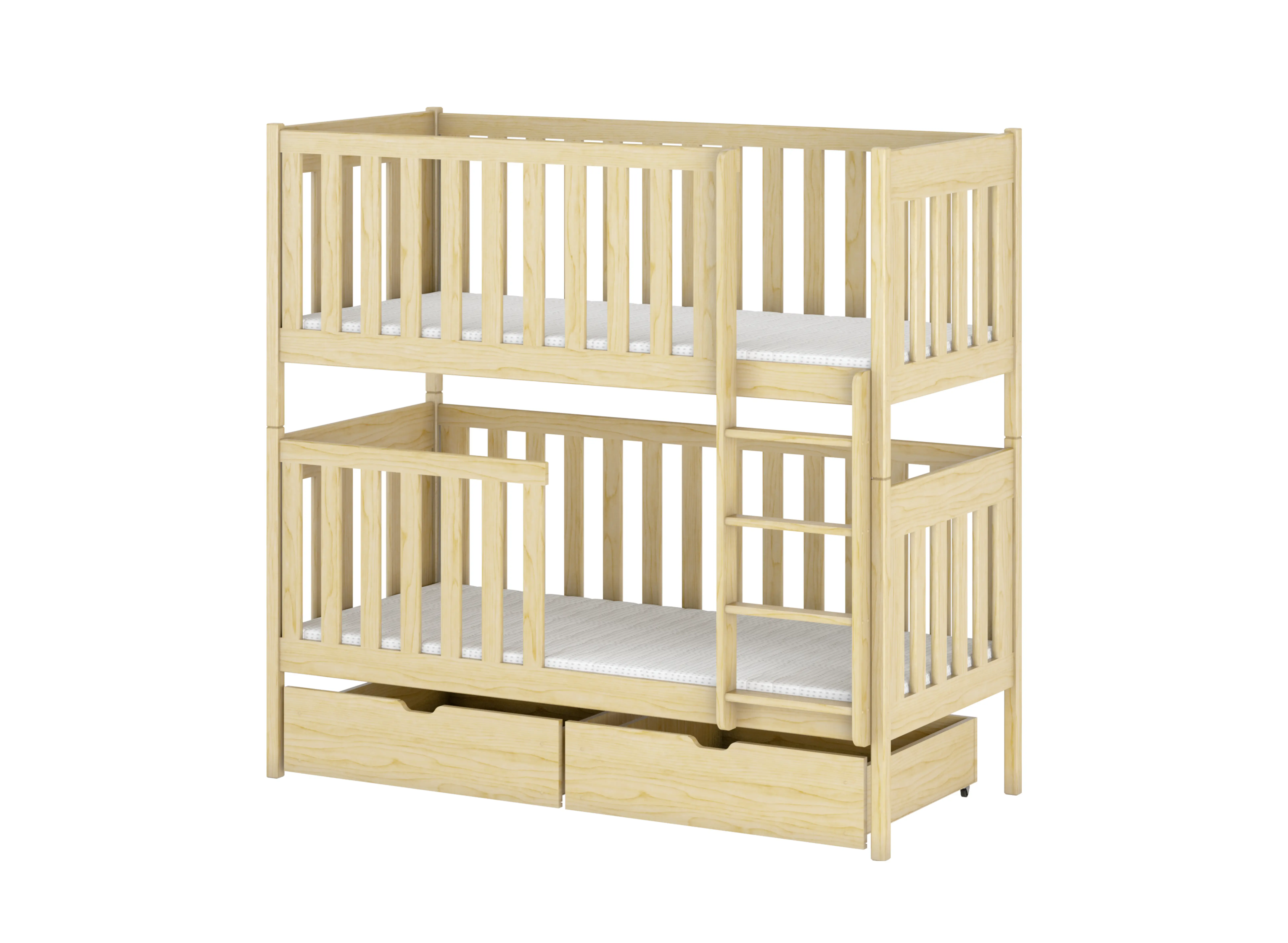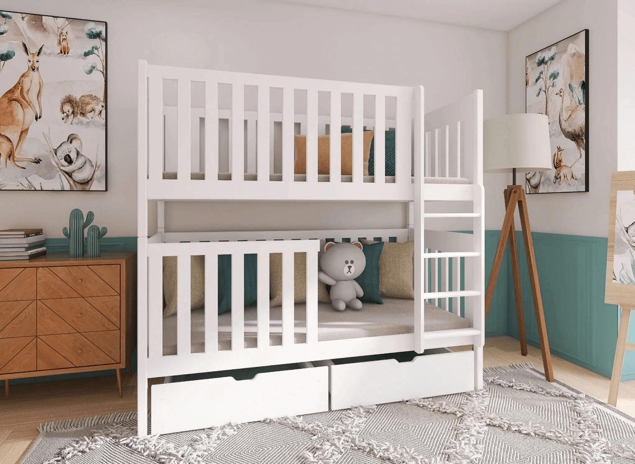 Trouver suffisamment d'espace pour les jouets et la literie est un défi dans chaque maison. Soyez malin et choisissez un lit pour enfants qui accueille les frères et sœurs tout en offrant de grands tiroirs pour les trésors. Notre lit superposé DAWID peut être configuré selon vos besoins, notamment en choisissant si des tiroirs seront placés sous le matelas inférieur. Sélectionnez les autres paramètres (barrière intégrée ou amovible et sa taille) et commandez dès aujourd'hui le lit pour enfants DAWID que vos enfants adoreront!