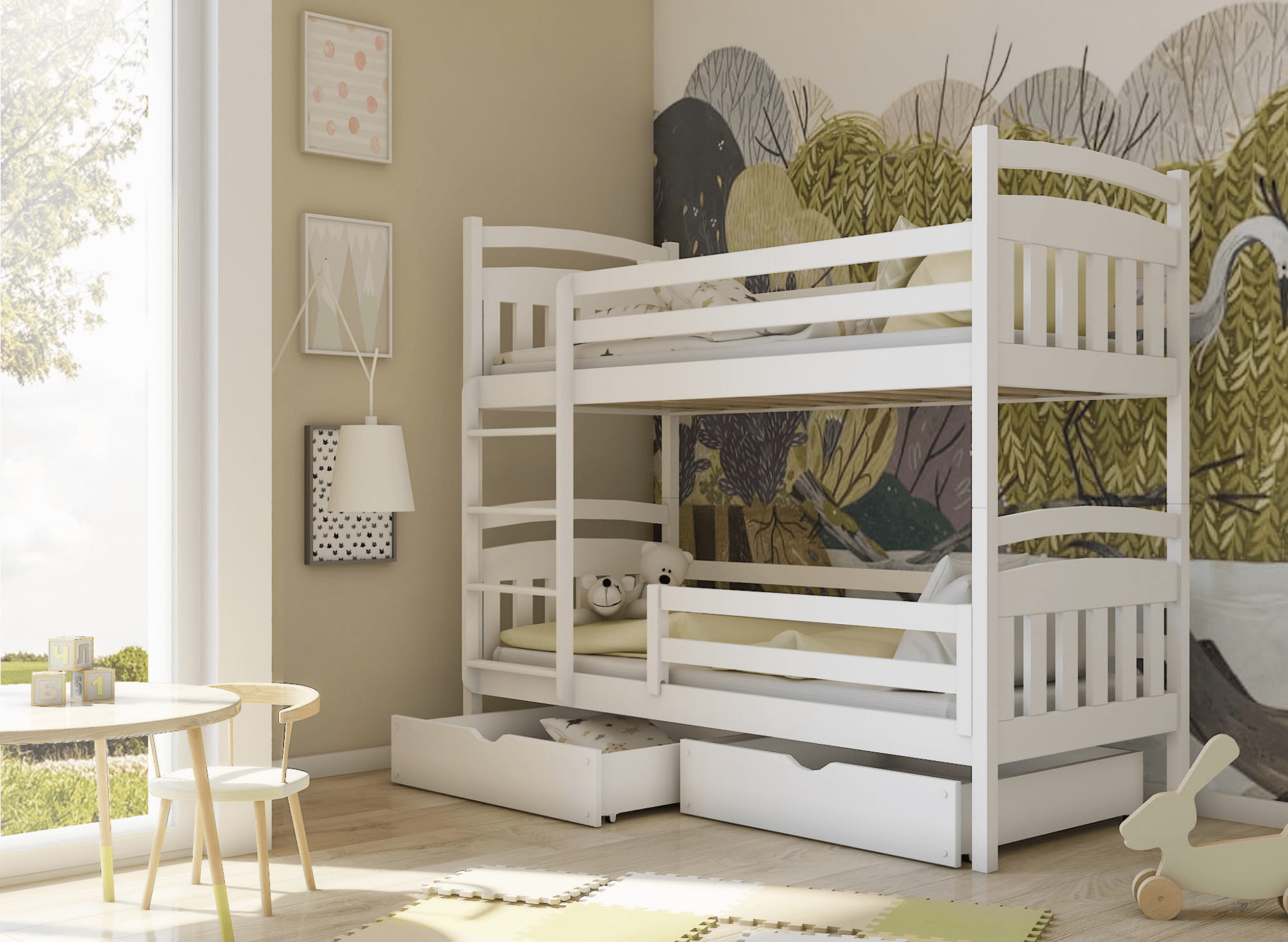 Nous offrons de nombreuses options de personnalisation pour le lit superposé GABI. Vous pouvez choisir l'option avec des tiroirs supplémentaires pour le linge de lit et les jouets, des barrières sécurisées et élégantes avec la possibilité de montage des deux côtés, ainsi qu'une échelle confortable. Notre lit pour enfants GABI peut également avoir un espace de rangement plus élevé de plus de 20 cm. Cependant, l'option la plus importante est de choisir le matelas supérieur et inférieur selon vos préférences - différents types et tailles sont disponibles. Le lit avec des tiroirs GABI transformera complètement la chambre d'enfant. C'est l'un des meilleurs meubles pour une chambre de deux petits!