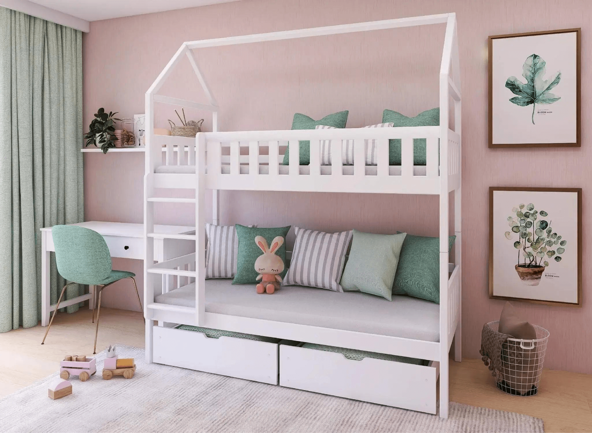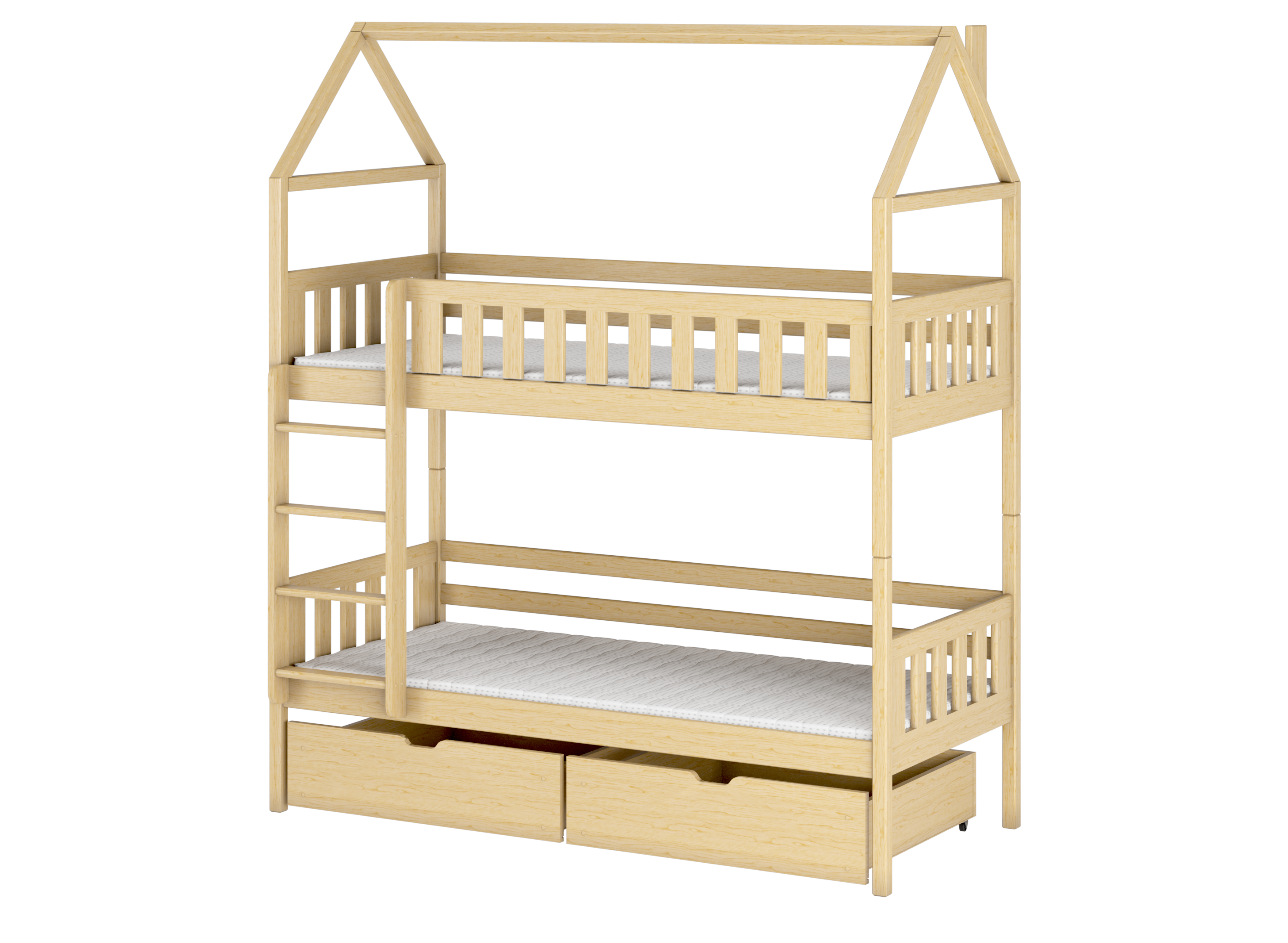 Confortable, douillet et sûr – lit superposé maison en pin GAJA avec tiroirs.