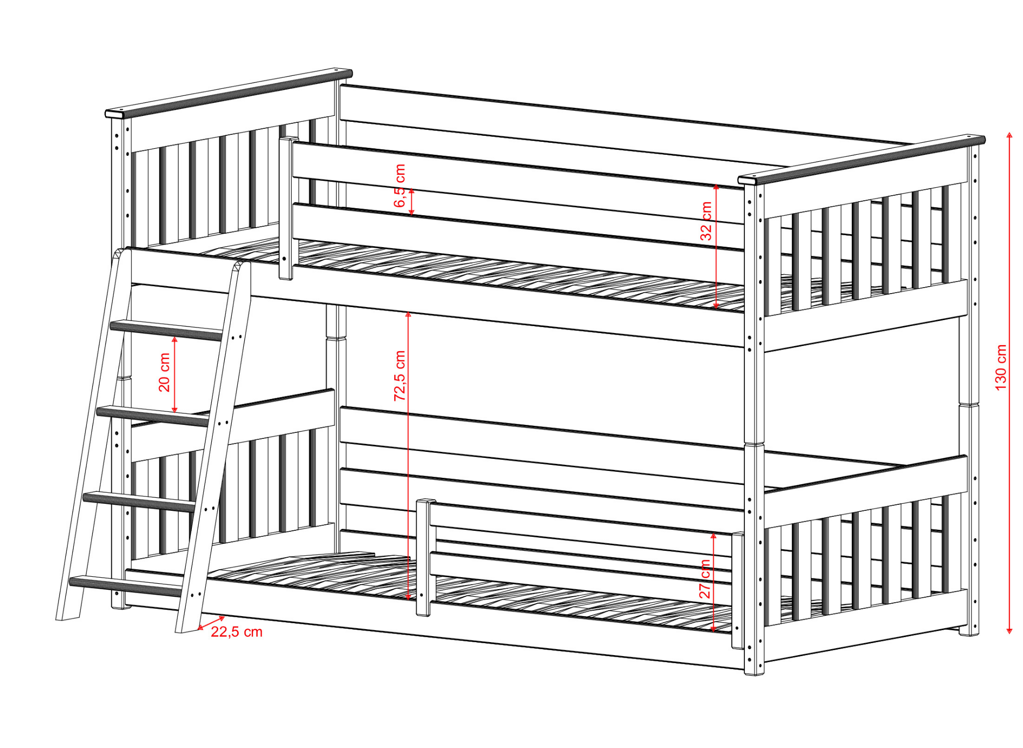Des méthodes éprouvées pour un bon et paisible sommeil des enfants ? Une histoire intéressante avant de dormir, un verre de lait et bien sûr le lit superposé KEVIN de Lano Meubles. Notre produit incite les enfants à s'endormir volontiers. De plus, le sommeil de l'enfant devient profond et le matin, votre petit se réveille reposé et prêt pour de nouvelles aventures. Ne tardez plus et découvrez pourquoi les enfants et les parents adorent notre lit superposé KEVIN. Nous avons mis l'accent sur la sécurité de haute qualité avec une barrière de sécurité. Grâce à cela, notre lit superposé KEVIN est parfait même si votre enfant est énergique et dynamique. Il est également important de mentionner que notre lit superposé KEVIN est universel. Cela signifie que, quelle que soit la configuration de la barrière et de l'échelle, il s'adaptera à chaque chambre d'enfant.