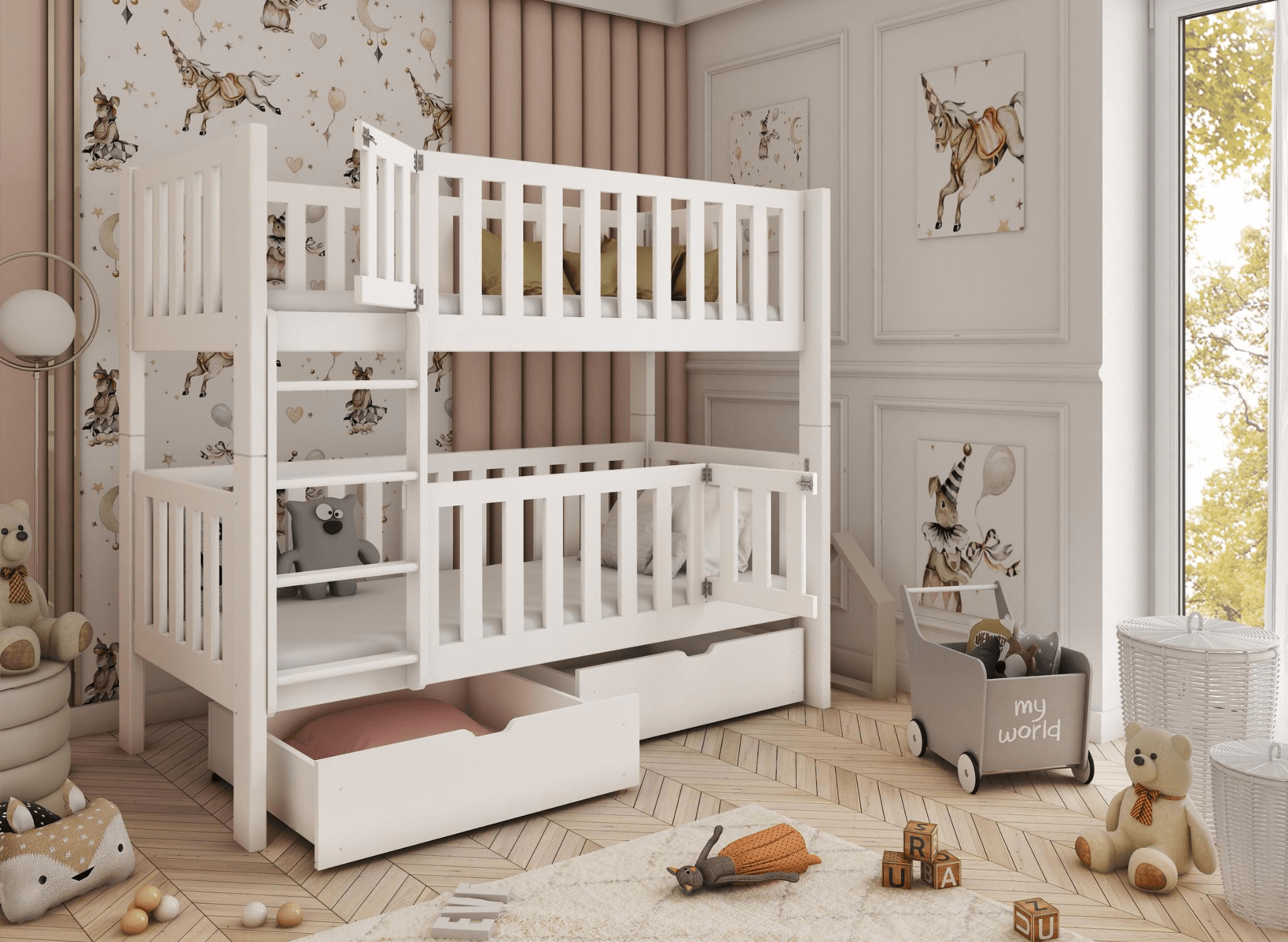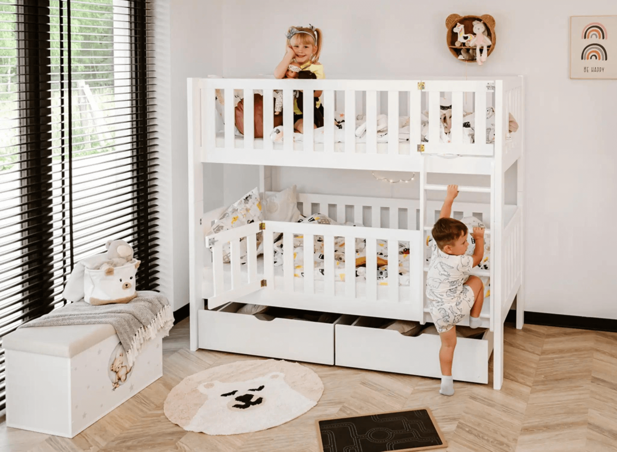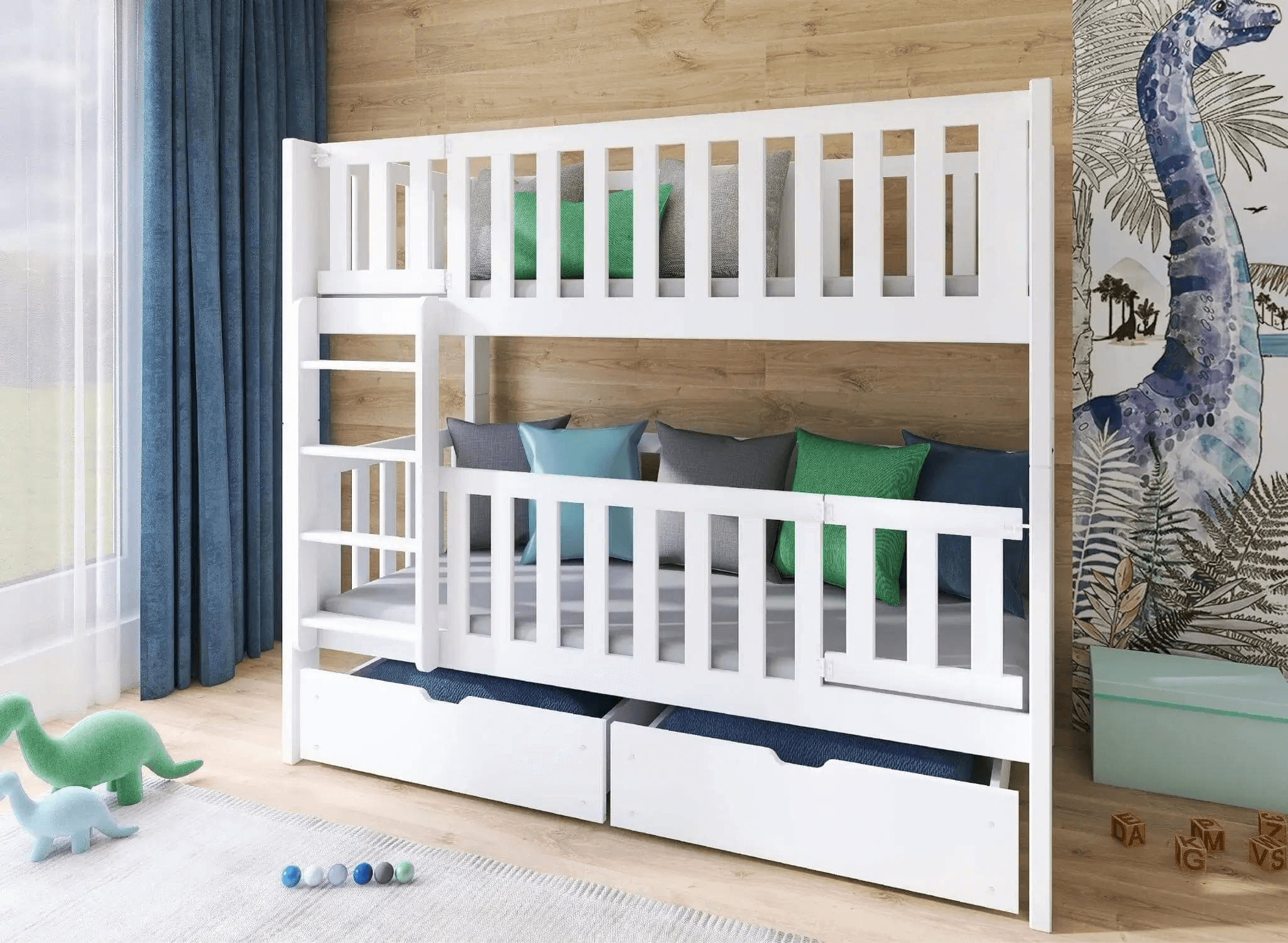 La chambre d'enfant est un espace unique, magique, parfois surréaliste, d'autres fois plus minimaliste. Le lit superposé KSAWERY de Lano Meubles a été conçu pour s'intégrer à tous les styles d'intérieur. Il présente un design épuré, sans ornements ni éléments décoratifs. Sa forme géométrique moderne est associée à une fabrication classique en bois de pin et à des solutions fonctionnelles. Notre priorité commune est la sécurité des enfants. Le lit superposé pour frères et sœurs KSAWERY est équipé de hautes barrières. Les barrières avant permettent de fermer complètement la zone de sommeil tout en ayant une fonction d'ouverture qui permet à l'enfant d'entrer et de sortir librement. La nuit, les barrières restent fermées. Grâce à cette fonctionnalité, le lit superposé KSAWERY devient un havre de sommeil sécurisé.
