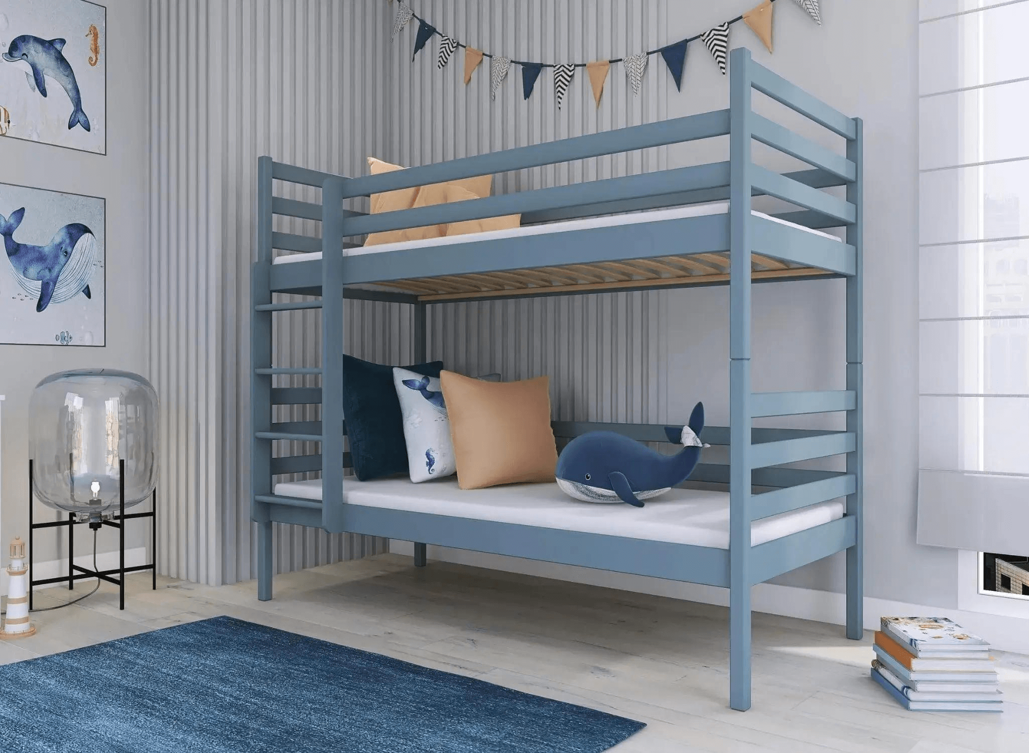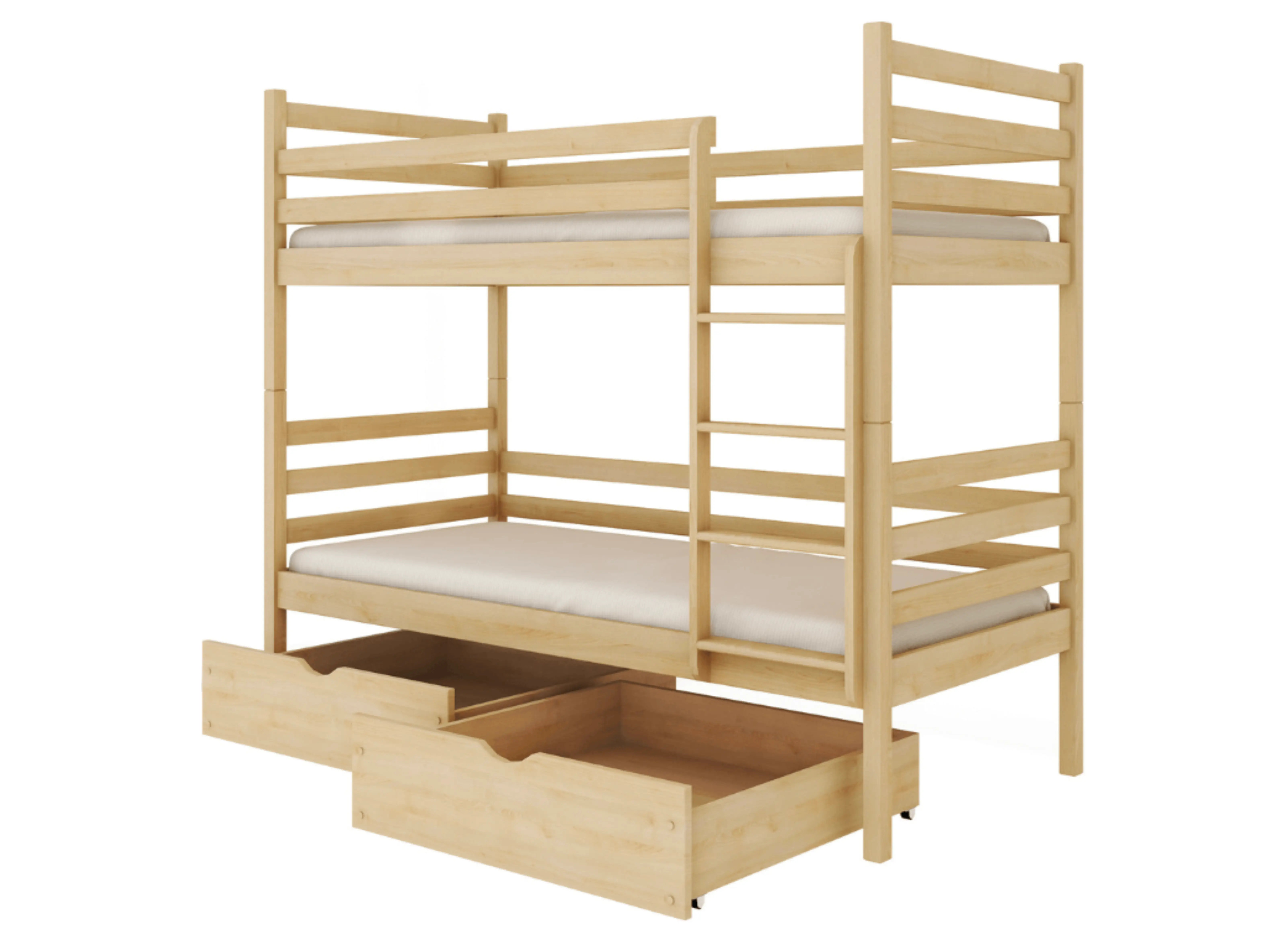 Le lit superposé NEMO est fabriqué à 100 % en bois de pin. En pratique, cela signifie que le lit est extrêmement solide et stable. Des protections supplémentaires sous forme de barrières en bois protègent l'enfant pendant son sommeil et assurent la tranquillité d'esprit des parents. Si nécessaire, il est possible de démonter la barrière inférieure. Les planches sont protégées par des vernis sûrs pour la santé des enfants. De plus, tous les angles du meuble sont arrondis, réduisant ainsi le risque d'éraflures à presque zéro.