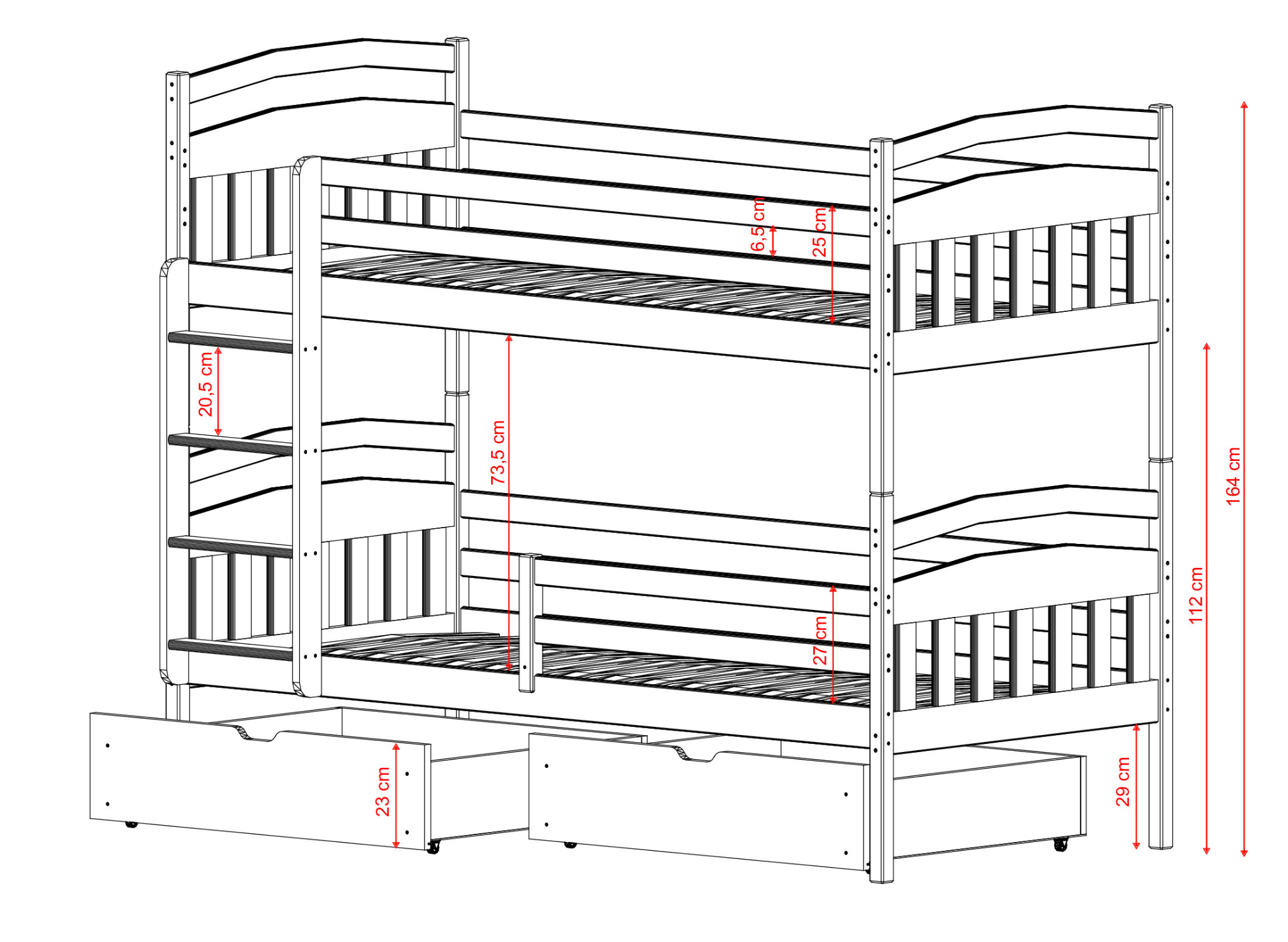Le lit pour enfants GABI est le choix idéal lorsque vous avez deux enfants. Nous avons veillé à un design unique et magique. La chambre d'enfant prendra une toute nouvelle ambiance. Le lit superposé GABI est solide et robuste. Nous avons utilisé des barrières de sécurité pour enfants spéciales et une échelle universelle. Pour notre lit pour enfants GABI, vous pouvez choisir vous-même les matelas de couchage - tout comme plusieurs autres paramètres et éléments du lit. Le lit superposé GABI est une proposition qui répondra même aux exigences les plus élevées. Cette proposition se distingue à bien des égards. Nous avons fabriqué le lit superposé GABI en bois de pin de haute qualité - cela garantit sa durabilité. Les barrières en bois et l'échelle universelle font partie des autres avantages importants. GABI est un lit avec des tiroirs, où vous pouvez ranger par exemple des jouets, des oreillers, une couette ou du linge de lit. Il convient également de noter que nous offrons dans ce cas une personnalisation. Le lit superposé GABI peut être adapté selon vos préférences.
