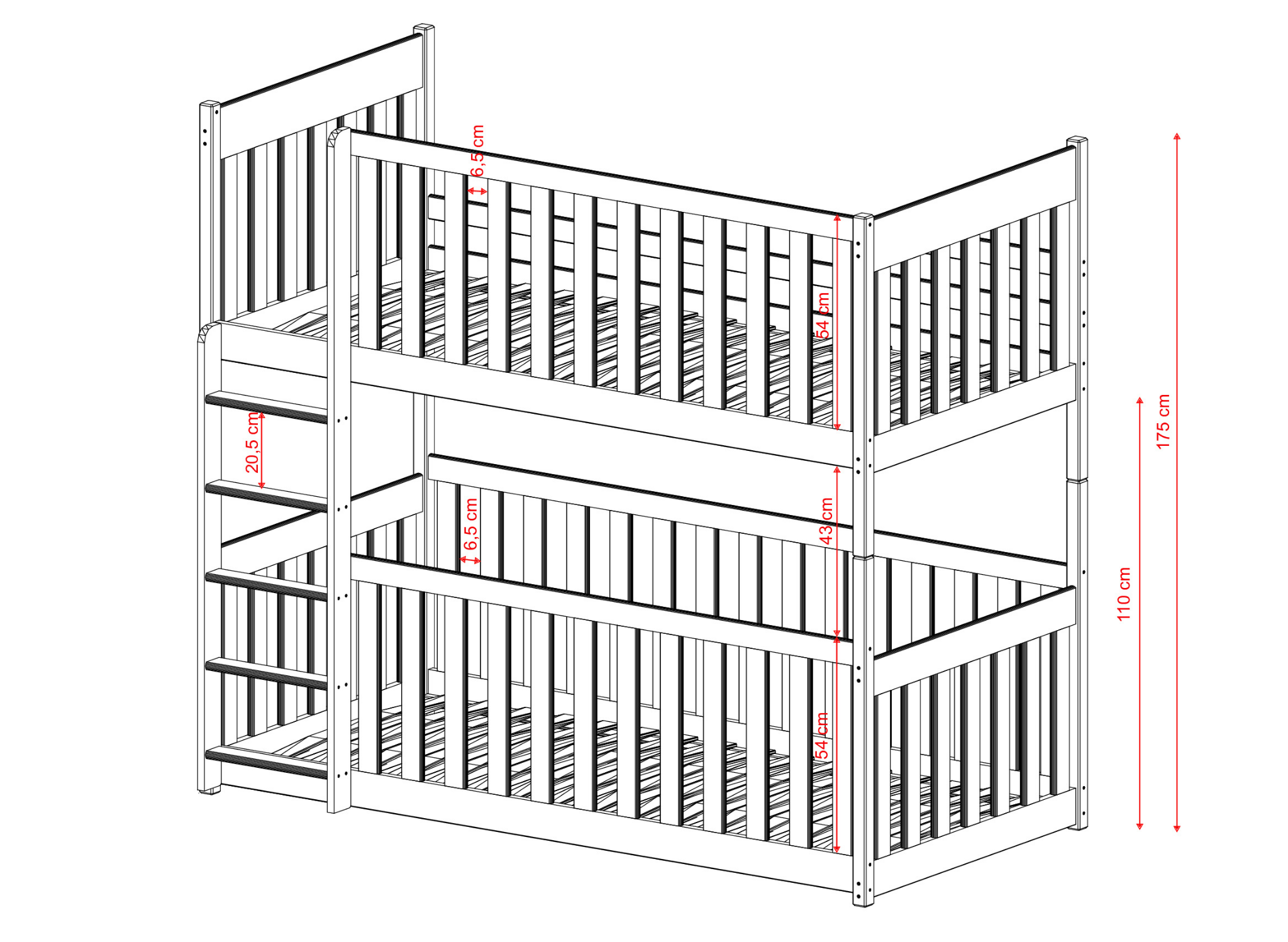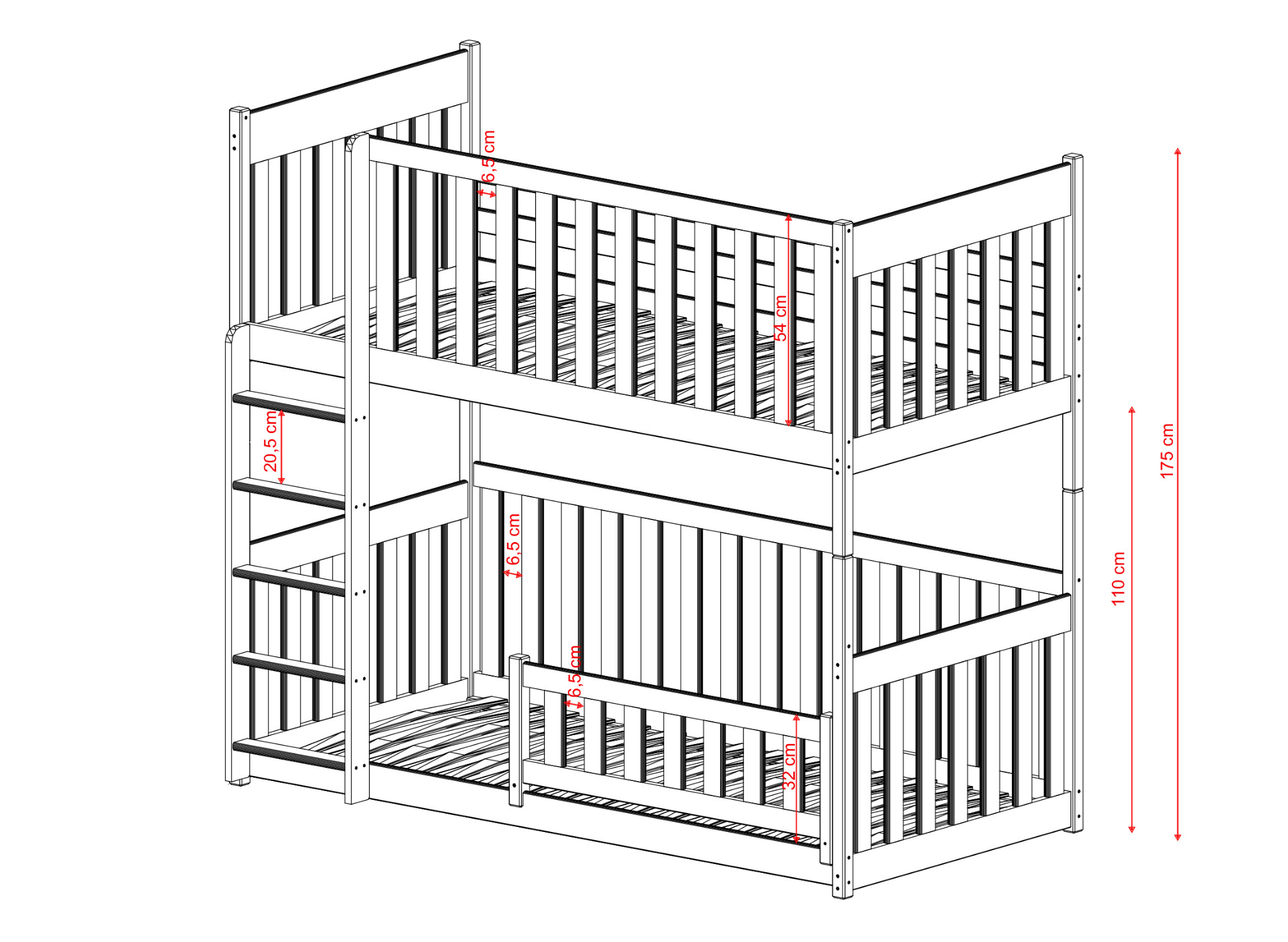 Le lit superposé KONRAD est unique et vous aidera à créer une ambiance exceptionnelle dans la chambre de votre enfant. Les hautes barrières offrent non seulement une sécurité pendant le sommeil, mais peuvent également servir d'excellentes surfaces décoratives. Vous pouvez décorer les barrières en bois du lit KONRAD avec des guirlandes lumineuses ou des découpages en papier réalisés par vos enfants. Dans une chambre d'enfant ainsi aménagée, vos enfants se sentiront à l'aise, tout cela grâce au lit superposé pour enfants KONRADL'une des caractéristiques clés du lit superposé KONRAD est la présence de hautes barrières de protection. Vous avez le choix entre plusieurs types : barrières complètes, amovibles, ¾ ou ½. Quelle que soit l'option que vous choisissez, elles assureront la sécurité de votre enfant pendant son sommeil. Pour les enfants un peu plus âgés, vous pouvez également opter pour le lit pour enfants KONRAD sans barrières. Le meuble est également livré avec une échelle pratique à larges échelons, facilitant ainsi l'accès des enfants au niveau supérieur. Lors de l'assemblage du lit superposé KONRAD, vous pouvez décider de l'emplacement de l'entrée, à gauche ou à droite.