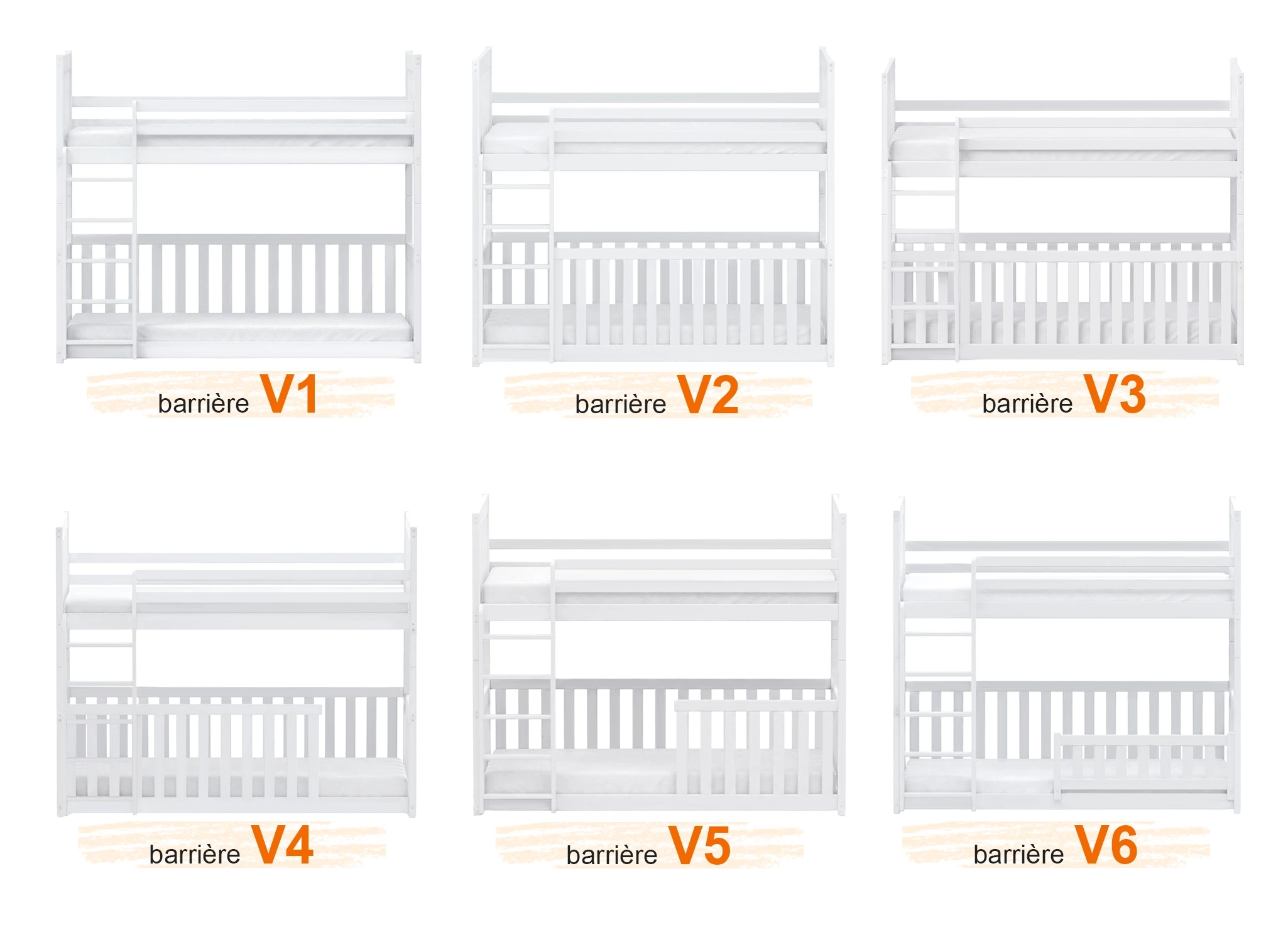 Le lit pour enfants CRIS peut être configuré de manière assez flexible. Nous offrons de nombreuses options qui peuvent être modifiées. De plus, vous pouvez choisir la version de la barrière en bois ou opter pour une augmentation de la hauteur libre de plus de 20 centimètres. Nous proposons également un large choix de matelas pour le niveau supérieur et inférieur. Le lit superposé CRIS peut être parfaitement adapté pour vos enfants !