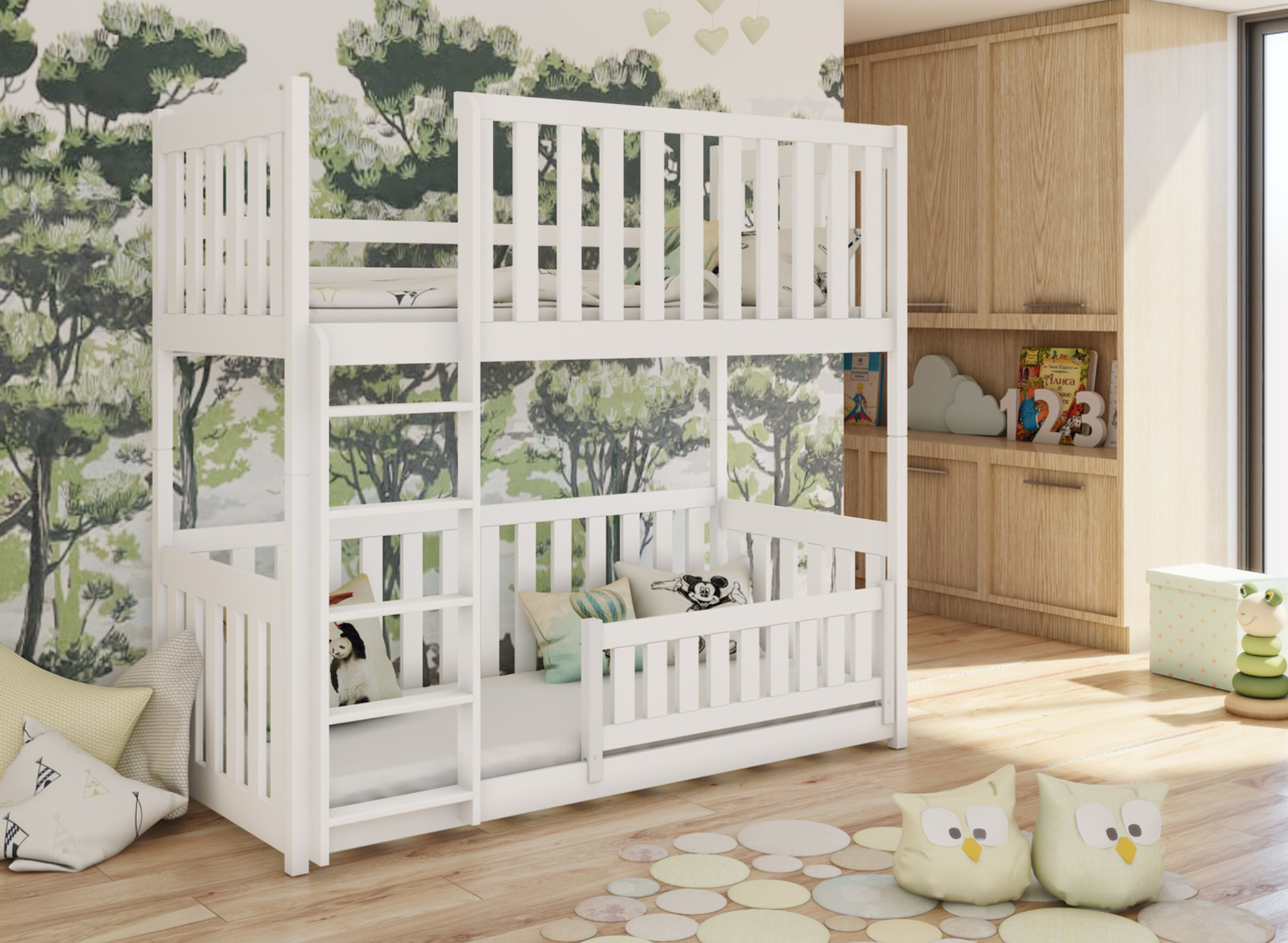 Le lit superposé KONRAD est unique et vous aidera à créer une ambiance exceptionnelle dans la chambre de votre enfant. Les hautes barrières offrent non seulement une sécurité pendant le sommeil, mais peuvent également servir d'excellentes surfaces décoratives. Vous pouvez décorer les barrières en bois du lit KONRAD avec des guirlandes lumineuses ou des découpages en papier réalisés par vos enfants. Dans une chambre d'enfant ainsi aménagée, vos enfants se sentiront à l'aise, tout cela grâce au lit superposé pour enfants KONRADL'une des caractéristiques clés du lit superposé KONRAD est la présence de hautes barrières de protection. Vous avez le choix entre plusieurs types : barrières complètes, amovibles, ¾ ou ½. Quelle que soit l'option que vous choisissez, elles assureront la sécurité de votre enfant pendant son sommeil. Pour les enfants un peu plus âgés, vous pouvez également opter pour le lit pour enfants KONRAD sans barrières. Le meuble est également livré avec une échelle pratique à larges échelons, facilitant ainsi l'accès des enfants au niveau supérieur. Lors de l'assemblage du lit superposé KONRAD, vous pouvez décider de l'emplacement de l'entrée, à gauche ou à droite.