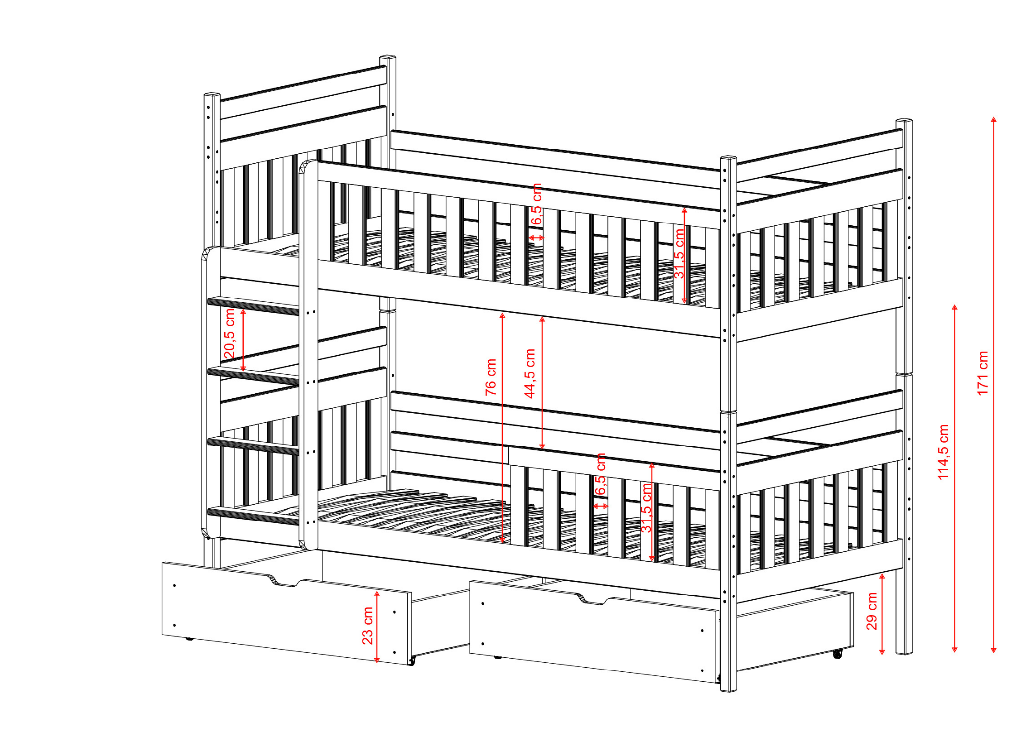 Le lit superposé MONIKA est une solution idéale non seulement pour les petits espaces, mais aussi pour toute chambre d'enfant partagée par des frères et sœurs. Pourquoi ? Un tel lit stimule l'imagination et favorise la créativité. Regardez également le côté pratique du lit pour frères et sœurs MONIKA. Les deux parties peuvent être séparées, créant ainsi deux zones de couchage indépendantes. En commandant notre lit superposé MONIKA, nous vous offrons une grande liberté. Vous pouvez personnaliser le meuble, afin de l'adapter aux besoins de vos enfants. C'est vous qui décidez si l'espace sous le lit doit être équipé de deux tiroirs. Lors de la commande, vous décidez également si les barrières du lit superposé MONIKA doivent être fixes ou amovibles.