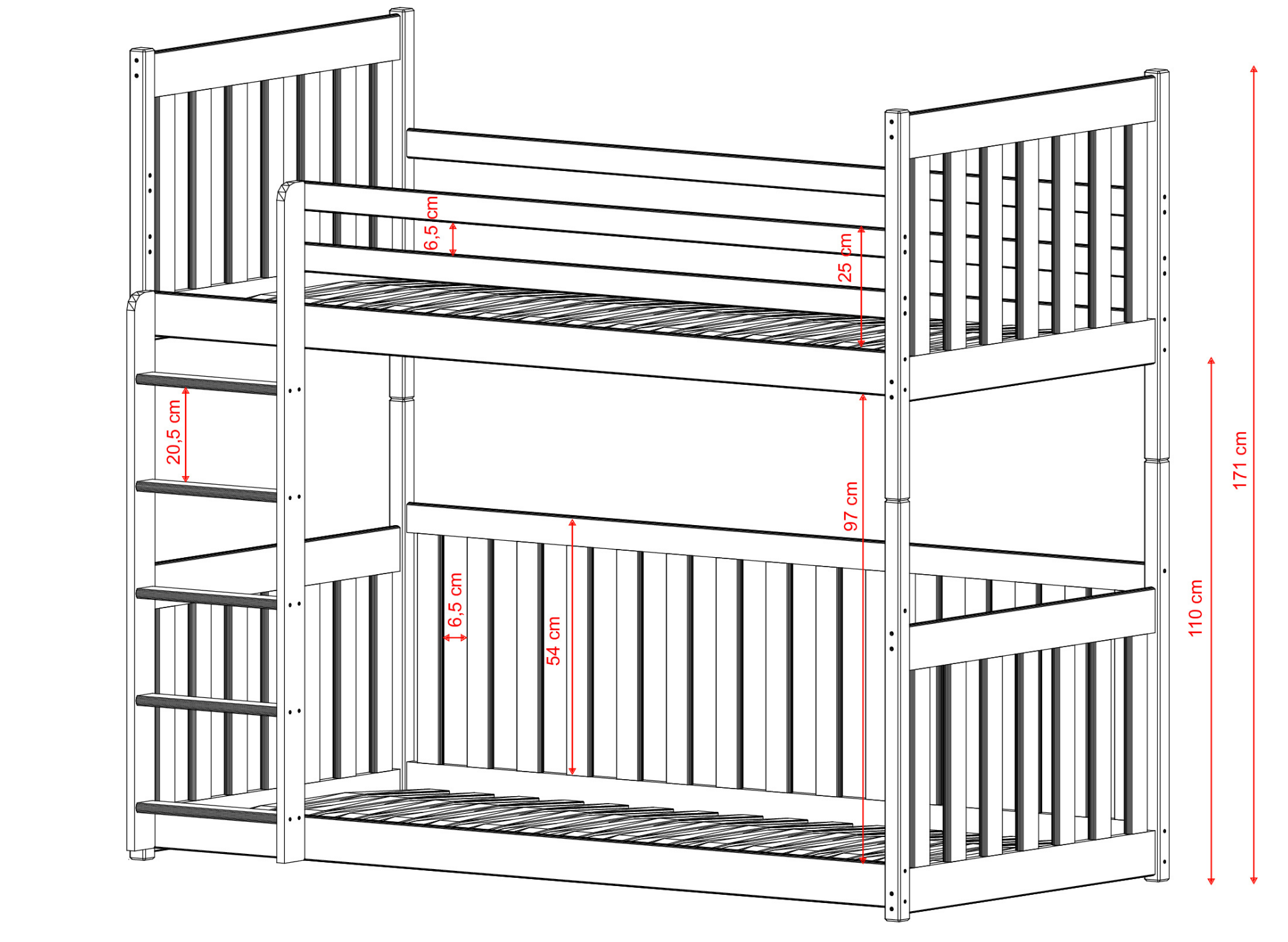 Le lit superposé CRIS est une proposition idéale pour deux enfants. Nous avons conçu ce meuble en bois de pin, garantissant une grande durabilité. Le lit pour enfants CRIS allie fonctionnalité et design attrayant. Nous avons utilisé des barrières en bois et ajouté une échelle – la chambre des enfants prendra vie avec ce meuble. Le lit superposé CRIS offre de nombreuses options de configuration. Vous pouvez choisir parmi une variété de matelas pour le lit du bas et du haut. Il est également possible de modifier la hauteur sous plafond et la barrière. Ce modèle présente vraiment de nombreux avantages. Tout d'abord, le lit superposé CRIS est solidement construit – il durera des années. De plus, nous l'avons équipé de barrières pratiques et d'une échelle universelle. La chambre des enfants prendra une atmosphère unique grâce au design de ce lit superposé. Notre CRIS est synonyme de confort et de fonctionnalité. Nous avons veillé à la solidité de la construction du meuble et ajouté de nombreux détails pour offrir un lit pour enfants exceptionnellement confortable et pratique pour vos enfants.