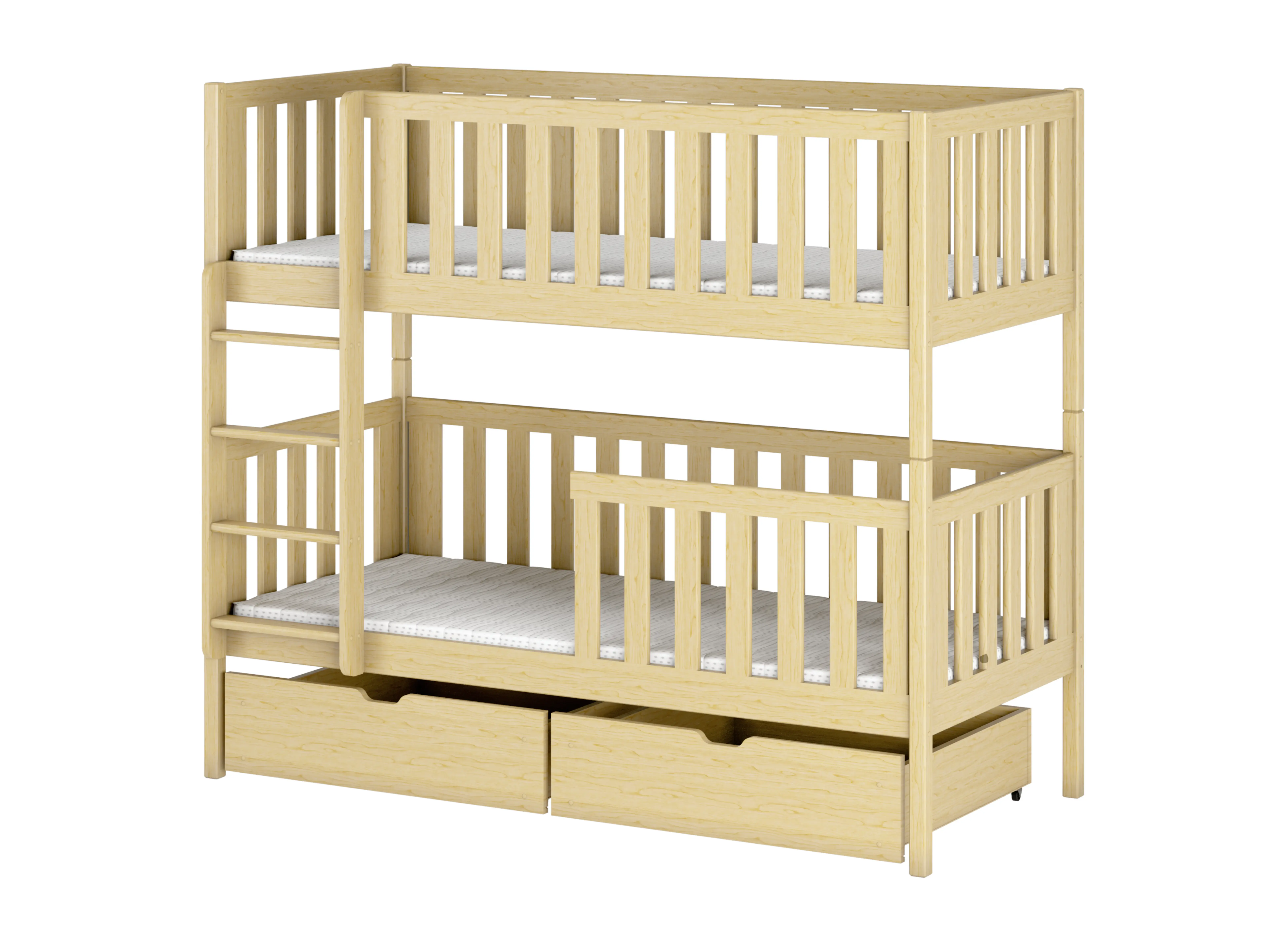 Tous les lits de Lano Meubles sont dépourvus de bords tranchants afin que vos enfants soient toujours en sécurité pendant leur sommeil. Le lit superposé MICHALINA est également équipé de hautes barrières de protection, de sorte que même les enfants les plus actifs ne risquent pas de tomber. Une échelle large et confortable facilite l'ascension vers le niveau supérieur. Le cadre du lit est entièrement fabriqué en bois de pin, réputé pour sa bonne élasticité et sa durabilité, et ne nécessitant pas d'entretien complexe. Chez Lano Meubles, nous veillons à la santé de vos enfants, c'est pourquoi, quelle que soit la couleur du lit que vous choisissez, le cadre sera recouvert d'une peinture à base d'eau antiallergique.Le lit superposé MICHALINA se distingue par son design classique. Il est facile à intégrer dans l'aménagement intérieur de la chambre d'enfant. Pour les plus jeunes enfants à partir de 2 ans, une option offrant un haut niveau de sécurité est le lit superposé MICHALINA avec une barrière fixe. Pour les enfants un peu plus âgés, une barrière amovible peut être une meilleure solution.