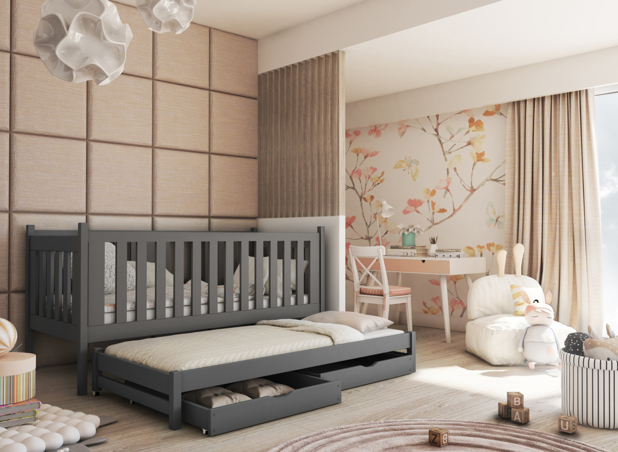Tiroirs optionnels pour le lit graphite pour frères et sœurs KAJA de Lano Meubles.