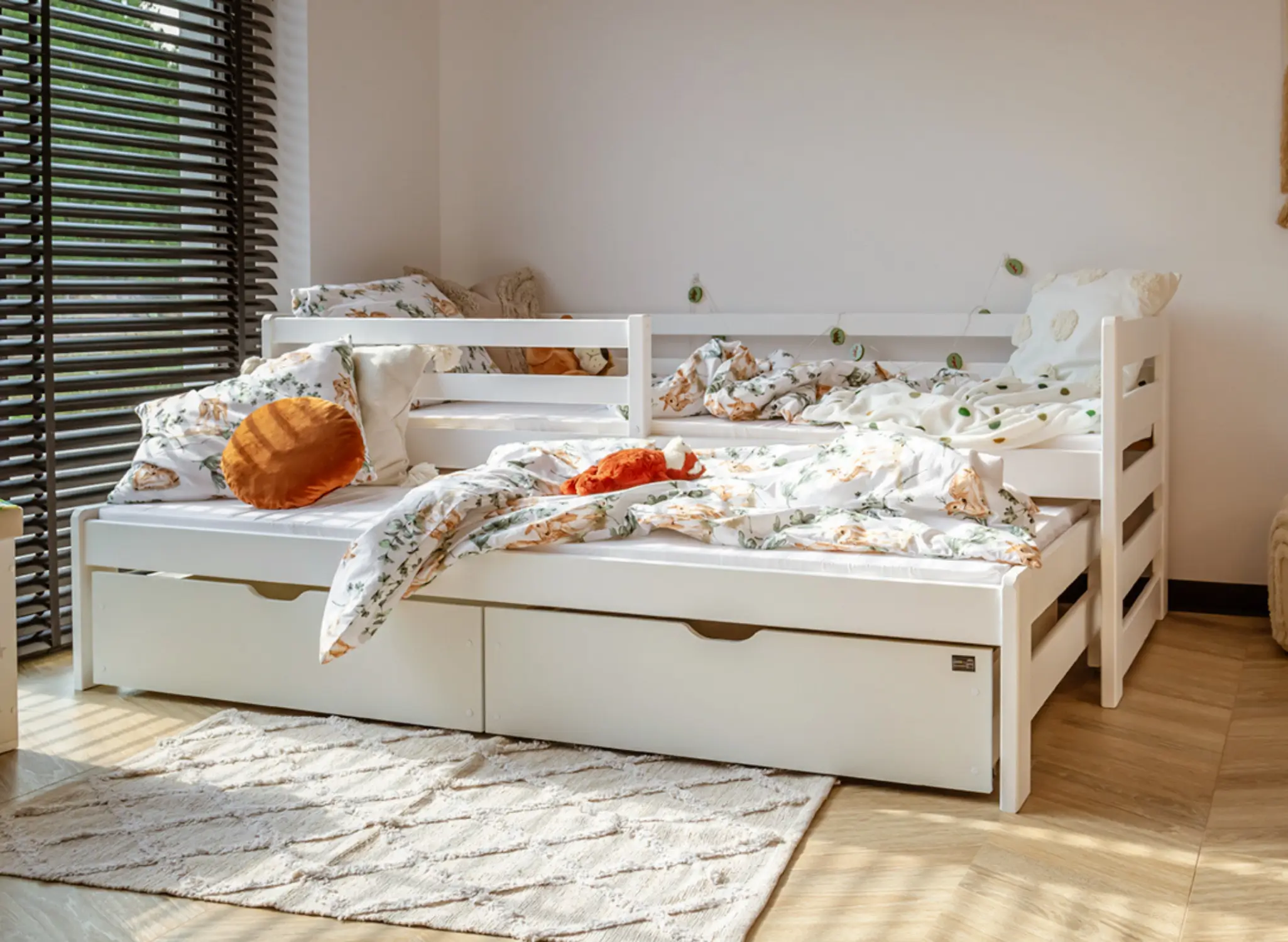 Fabriqué en bois de pin, le lit superposé SENSO est robuste et a une longue durée de vie. C'est donc un investissement à long terme, qui peut d'abord être un lit superposé pour enfants, puis un lit pour adolescents. Le cadre pour matelas est en lattes de bouleau FLEX, ce qui rend l'ensemble résistant aux charges. Le lit superposé extensible SENSO est une bonne alternative à deux lits séparés dans une chambre où l'espace manque. Il prend autant de place qu'un lit simple standard. En option, il peut être équipé de tiroirs spacieux pour le rangement, par exemple, de la literie, des jouets ou des vêtements.