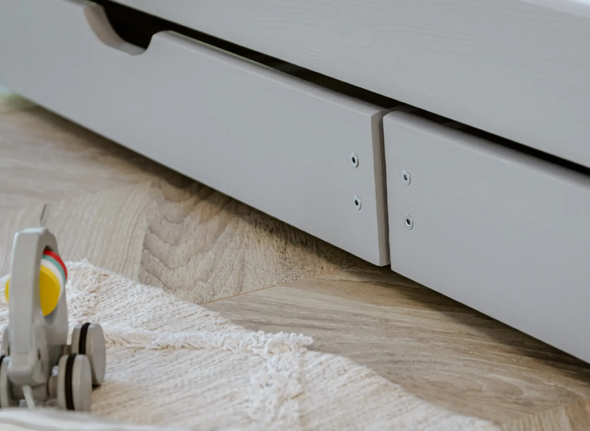 Pour rendre le lit superposé bas KAJA encore plus fonctionnel, optez pour des tiroirs coulissants. Ils offrent un espace de rangement supplémentaire pour les vêtements, les jouets et la literie. Les tiroirs sont spacieux et fonctionnent indépendamment, permettant à chaque enfant d'avoir le sien. Le lit superposé bas KAJA est fabriqué en bois de pin naturel, un matériau extrêmement solide et résistant. La construction du lit extensible KAJA est durable et supporte bien les petites et grandes charges, garantissant une utilisation prolongée par vos enfants pendant de nombreuses années.