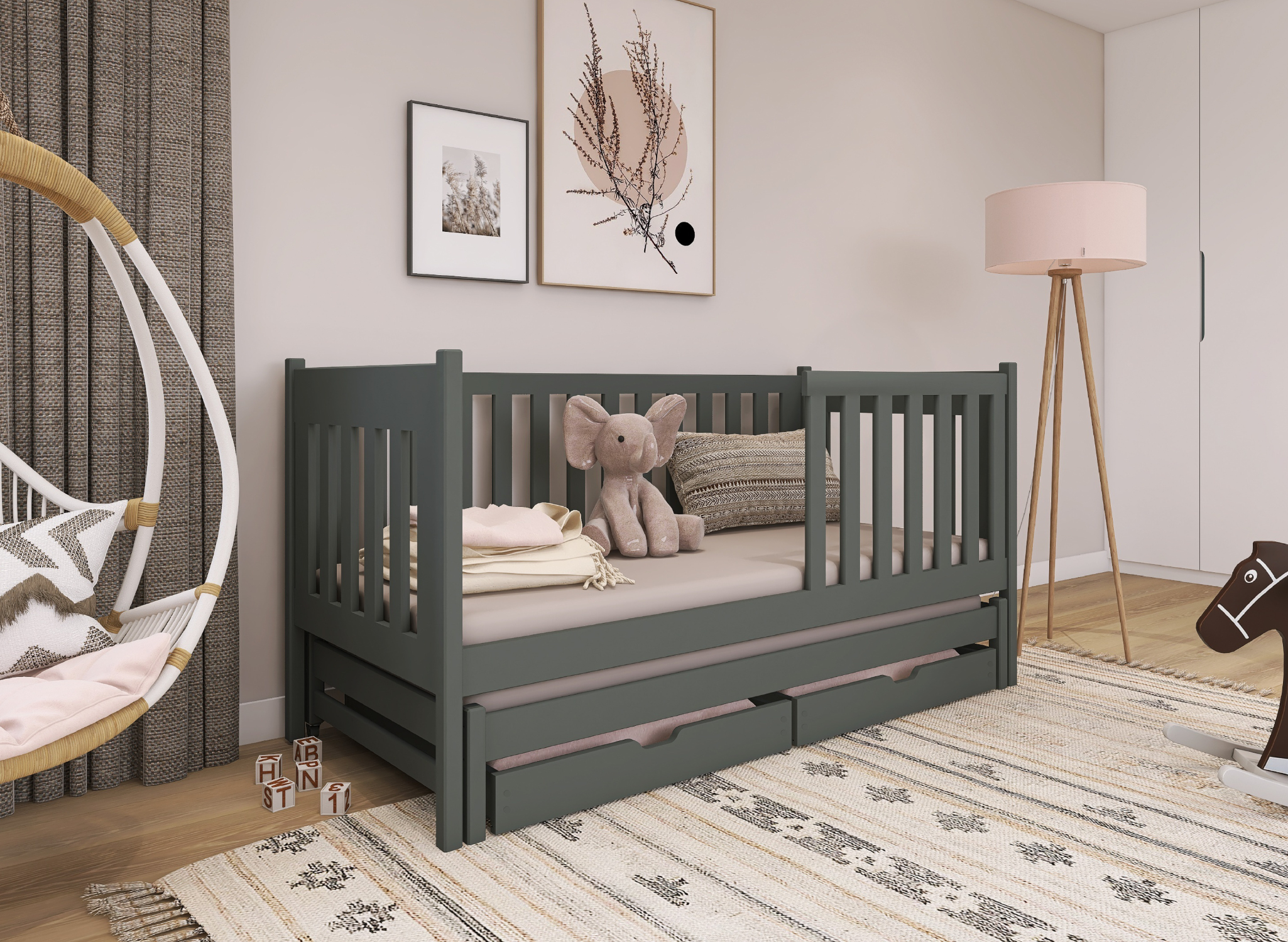 Marches sûres, haute barrière : lit d'enfant graphite KAJA avec tiroir 90x190