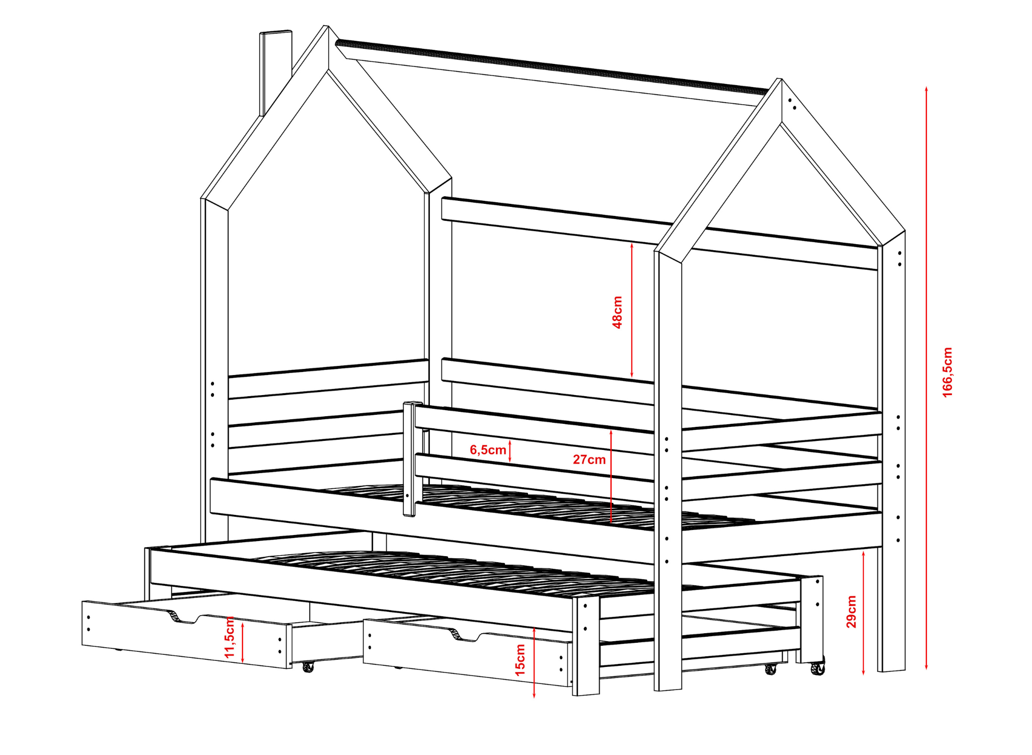 Lorsque vous planifiez des rénovations dans la chambre de votre enfant, vous souhaitez sûrement une métamorphose spectaculaire. Les meubles actuels sont non seulement usés, mais vous n'êtes plus sûr qu'ils soient vraiment sûrs pour votre enfant. Avec Lano Meubles, vous pouvez dormir sur vos deux oreilles ! Le lit cabane pour enfant DANEK transformera non seulement la chambre de votre garçon ou fille, mais garantit également la plus haute qualité et un sommeil en toute sécurité. Vous pouvez compter sur nous ! Quelle est la partie la plus importante du lit cabane pour enfant DANEK ? Sans aucun doute, il faut mentionner le cadre. Grâce à un soutien approprié, votre enfant pourra bien dormir et se réveiller reposé. Le cadre du lit pour enfant DANEK est fabriqué en lattes de bouleau FLEX, s'adaptant parfaitement à tout type de matelas. Il ne vaut pas la peine de faire des compromis sur des questions aussi cruciales !