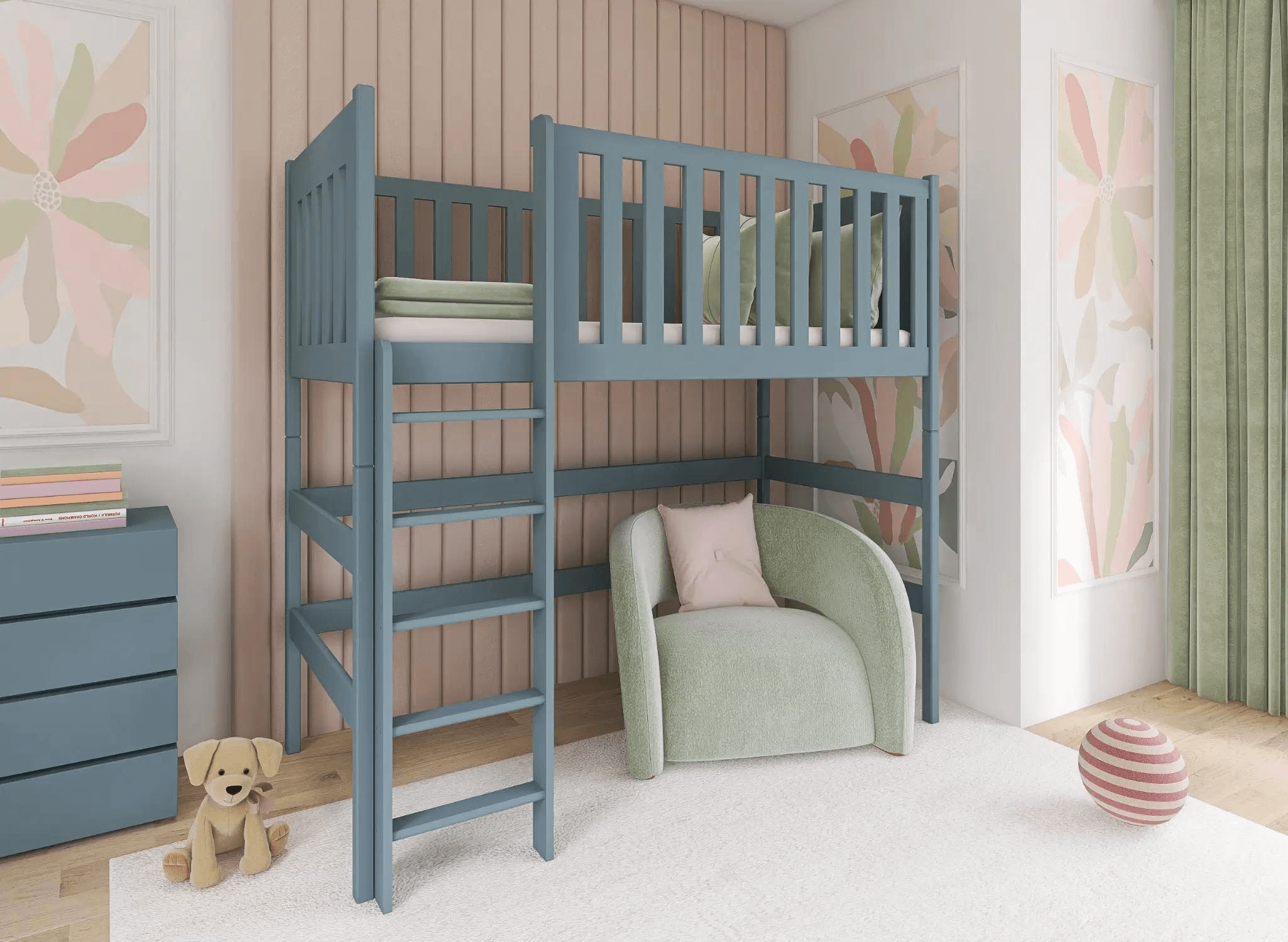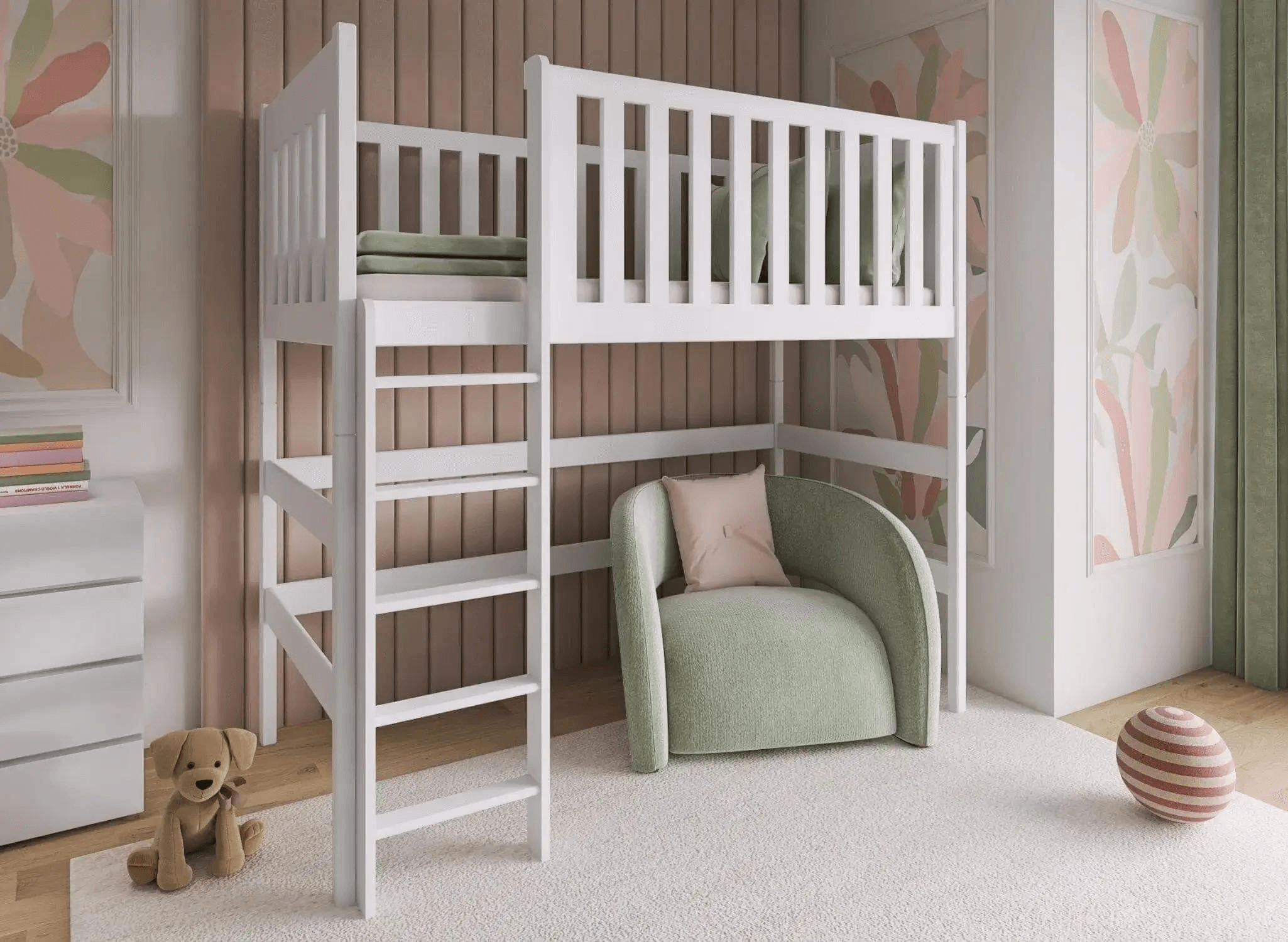 Le lit mezzanine une personne LAURA est une solution unique qui embellira la décoration de la chambre de votre enfant. Le design, adoré par les enfants, n'est qu'un des nombreux atouts de ce meuble. Découvrez-le en détail ! La mezzanine permet d'économiser beaucoup d'espace, ce qui en fait un choix idéal pour les chambres d'enfants de petite taille. La partie inférieure peut être aménagée selon vos envies : installer un bureau, placer un fauteuil confortable ou un canapé, voire créer un coin rangement pour tous les jouets qui traînent. Le bord du lit pour enfant est équipé d'une haute barrière à barreaux, empêchant toute chute. L'accès sécurisé est garanti par une échelle ergonomique dotée de marches stables et confortables.