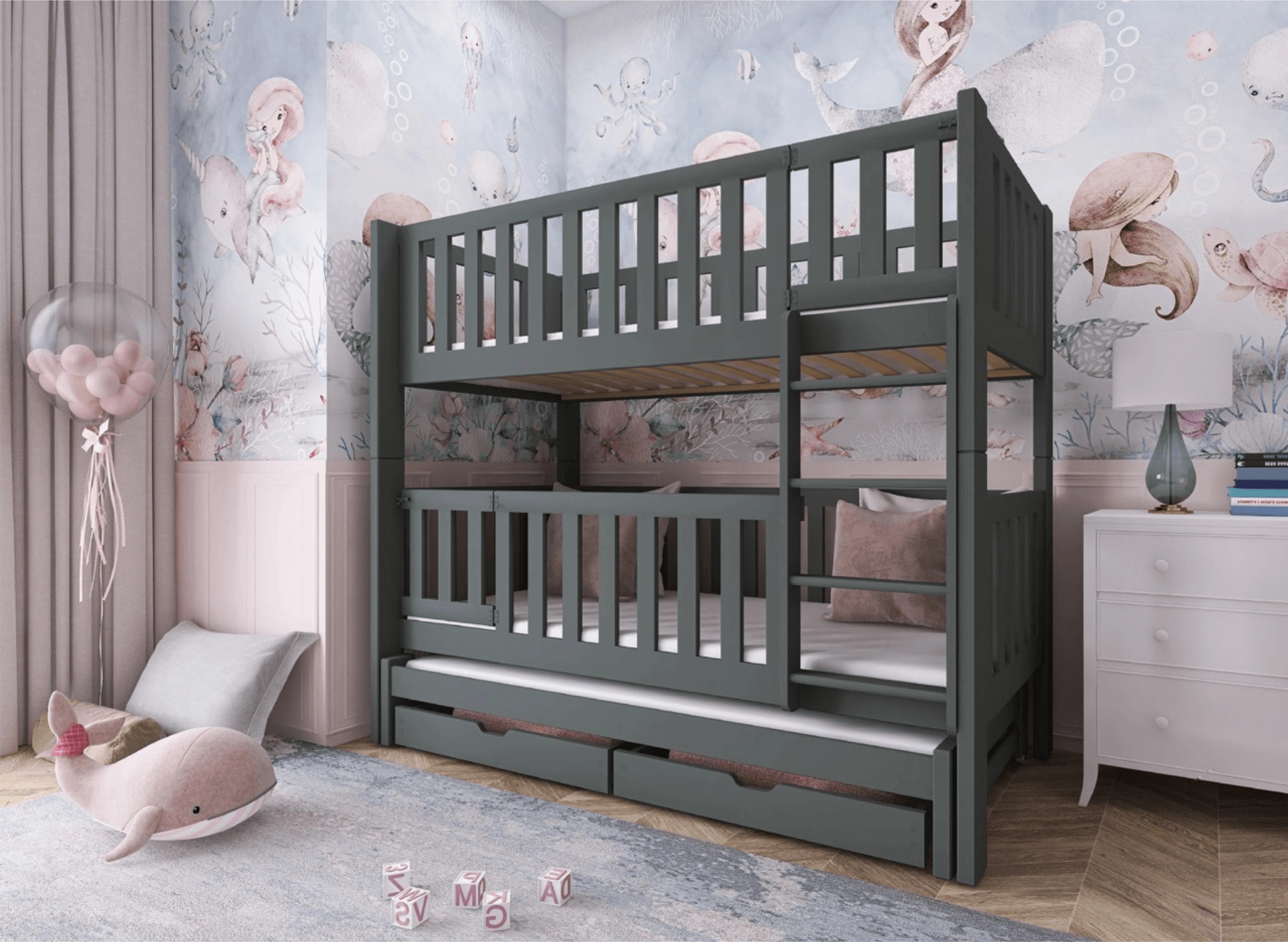 Le lit superposé AGATHA est un excellent choix pour les parents qui souhaitent optimiser l'espace dans la chambre de leur enfant. Grâce à son plateau escamotable et à ses tiroirs pratiques, le lit offre un espace de rangement supplémentaire tout en occupant un minimum de place. Désormais, l'organisation de la chambre de vos enfants sera plus simple que jamais. Nous nous soucions de la santé de votre enfant et de la protection de notre planète, c'est pourquoi nous choisissons uniquement du bois de pin soigneusement sélectionné et des matériaux répondant aux normes de sécurité les plus strictes. Toutes les matières premières utilisées pour la finition du lit superposé AGATHA sont non toxiques et sans danger pour les enfants. Le vernis certifié qui recouvre le lit respecte toutes les normes de sécurité, ce qui vous assure qu'il ne nuira pas à la santé de vos petits.