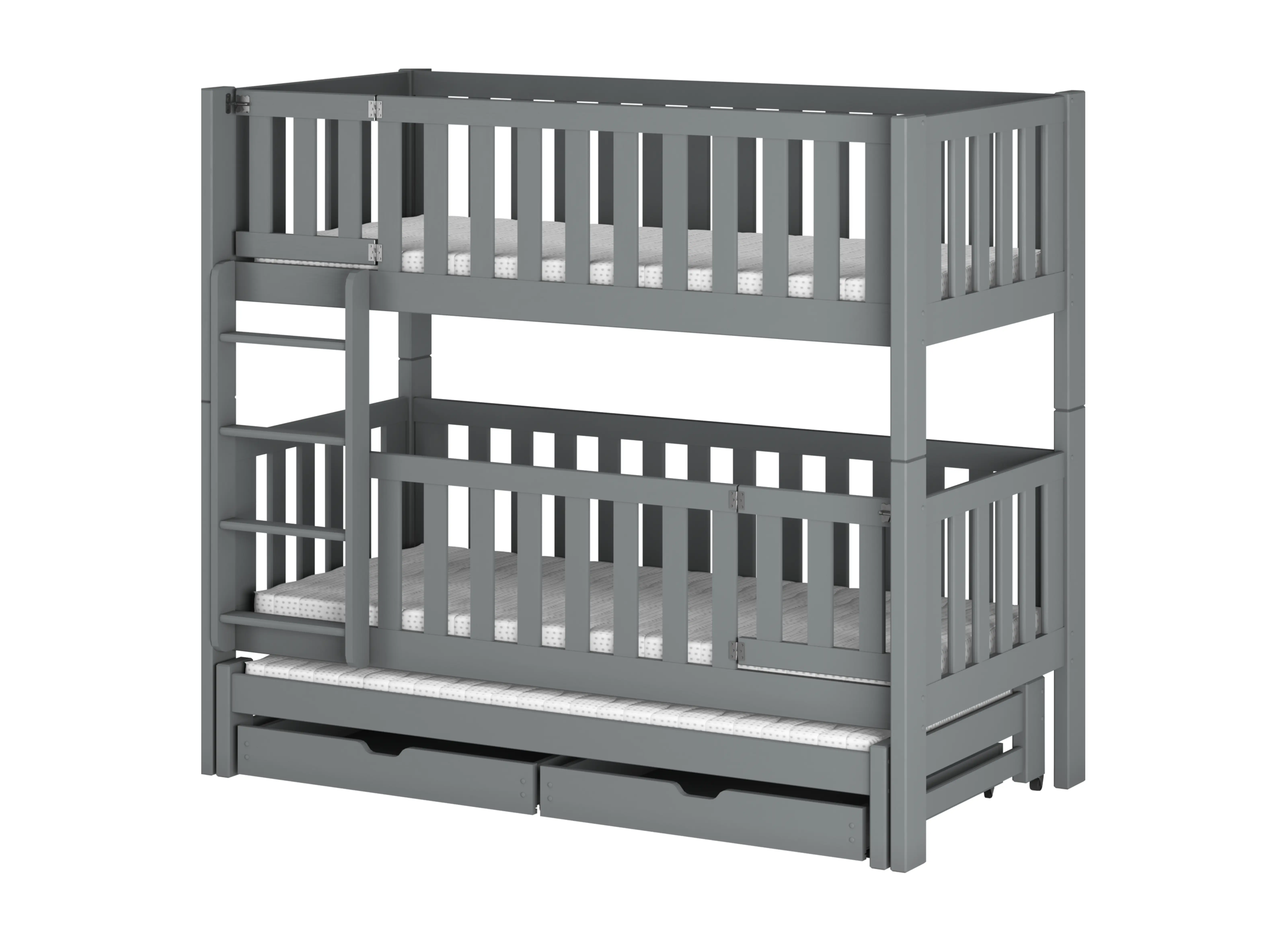 Le lit superposé AGATHA est la solution idéale pour les jeunes enfants. Les hautes barrières de sécurité garantissent leur sécurité, tandis que l'espace de couchage escamotable et les tiroirs spacieux facilitent le rangement de la literie et d'autres objets. Ce magnifique lit d'enfant AGATHA est extrêmement spacieux tout en ne prenant pas beaucoup de place dans la chambre d'enfant. La durabilité de ce modèle est assurée par des pieds solides qui rendent la structure stable et résistante. Ainsi, il n'y a aucun risque de balancement ou de déplacement du lit. Vous pouvez être tranquille, tant pendant le sommeil que pendant les jeux des enfants, quant à leur sécurité. Les portails à fermeture éclair caractéristiques ne sont pas seulement un élément stylé, mais aussi une solution fonctionnelle. Ils permettent un ouverture et fermeture faciles, facilitant ainsi l'accès à l'enfant en cas de besoin. Le lit superposé AGATHA a été conçu pour assurer à votre enfant un sommeil confortable et sain. Les dimensions ergonomiques de 80x180 cm et les matelas de haute qualité de Lano Meubles permettront à votre petit de profiter d'un repos sain et confortable tout au long de la nuit.
