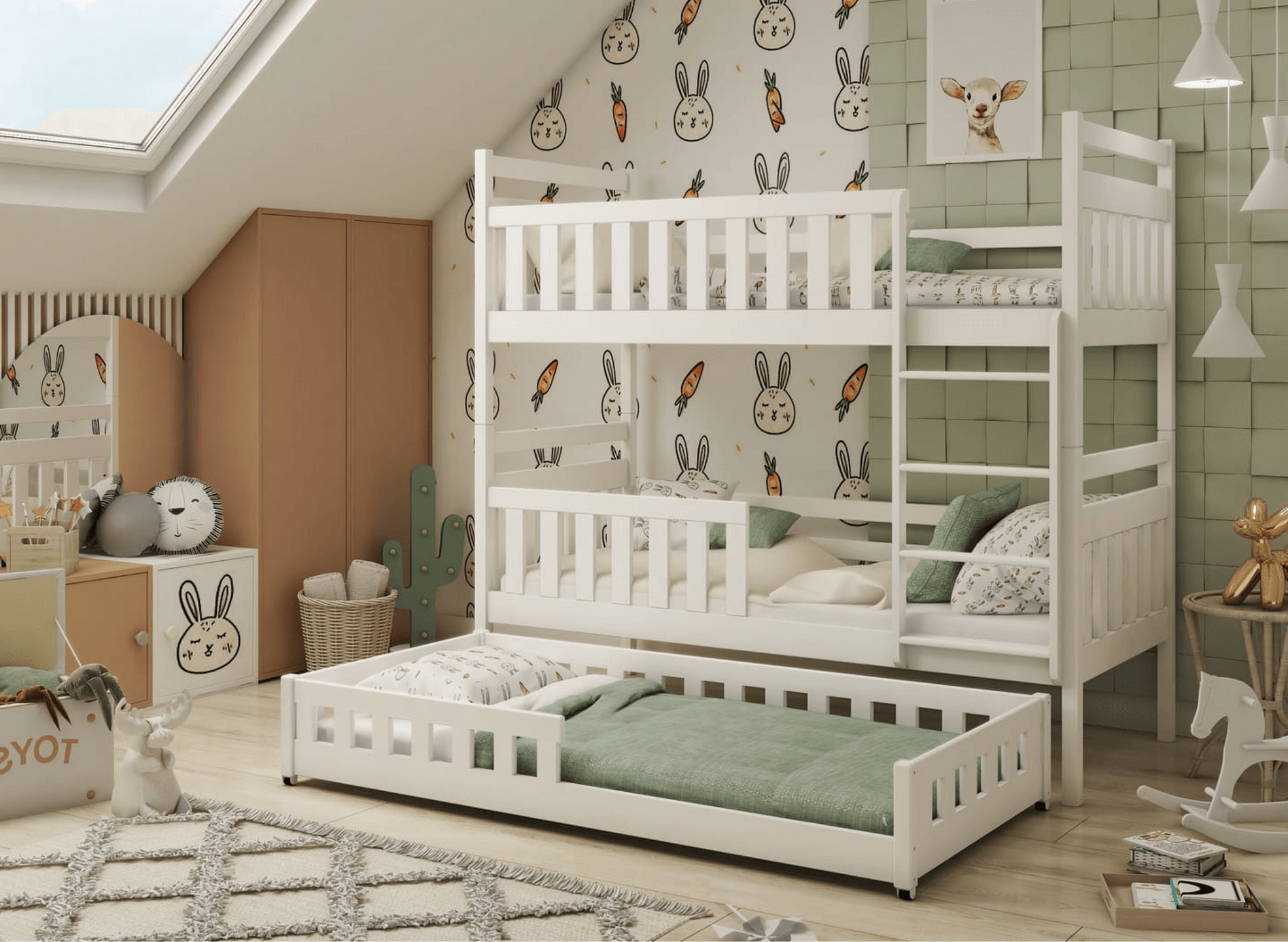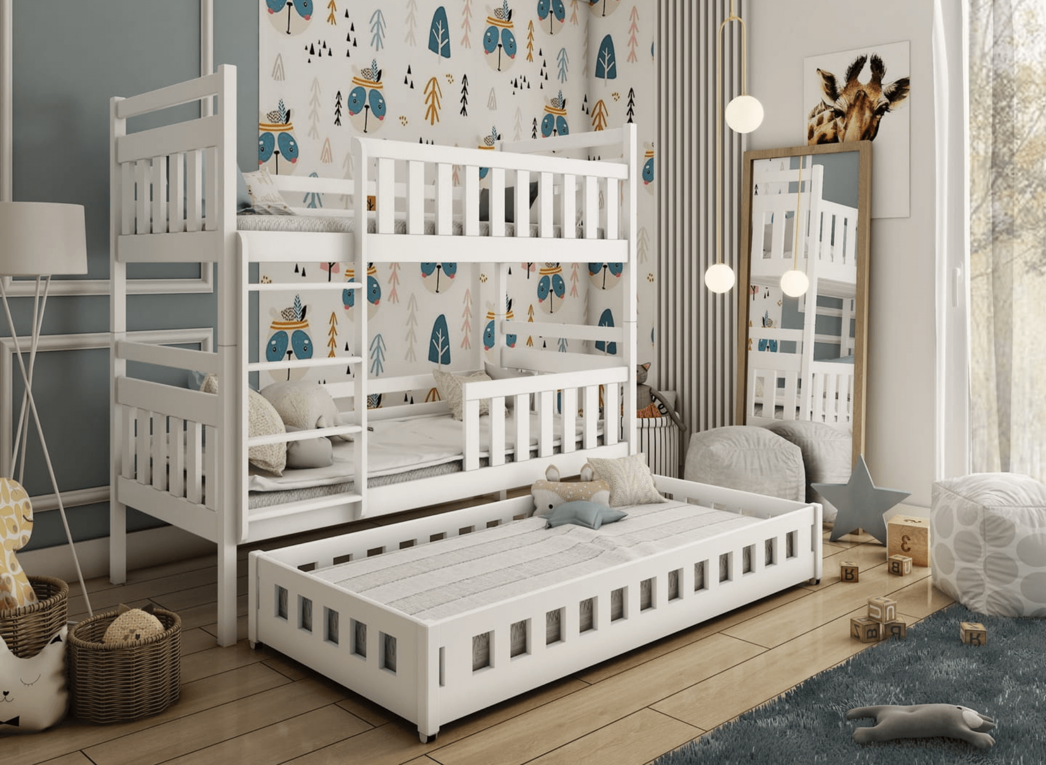 Dans les chambres d'enfants partagées par des frères et sœurs, chaque centimètre compte. Placer trois lits indépendants peut considérablement réduire l'espace nécessaire pour jouer ou étudier. Le lit pour frères et sœurs OLIWIA est un meuble à la fois design et pratique, occupant la même surface qu'un lit simple, tout en offrant un espace de couchage pour trois enfants. C'est à vous et à vos enfants de décider comment sera configuré notre lit pour frères et sœurs OLIWIA. Selon les besoins, la partie inférieure coulissante peut être rangée sous le lit superposé ou être placée de manière indépendante dans une autre partie de la chambre d'enfant. De plus, en optant pour des barrières amovibles, le lit superposé OLIWIA pourra servir à vos enfants même lorsqu'ils seront adolescents.