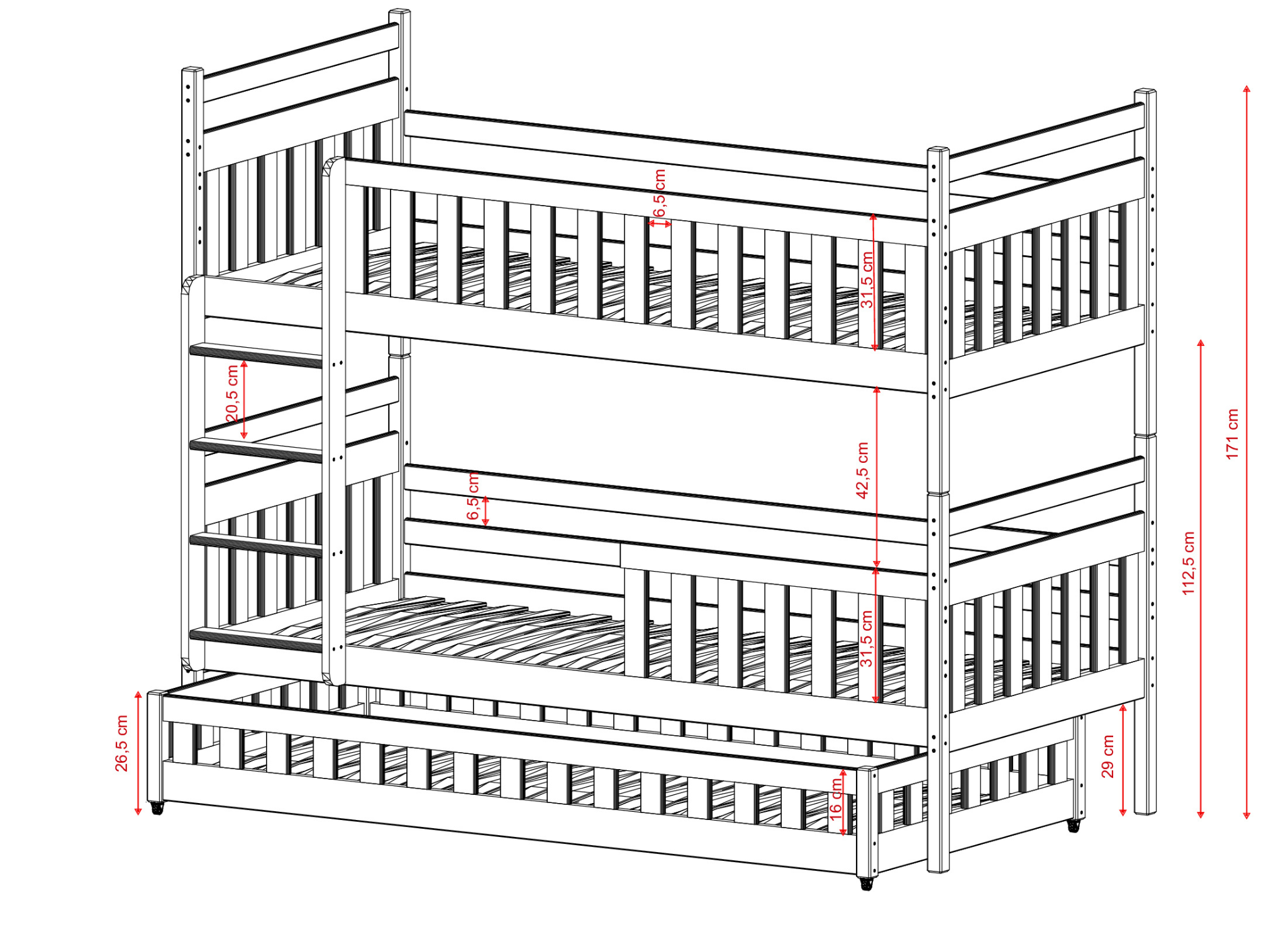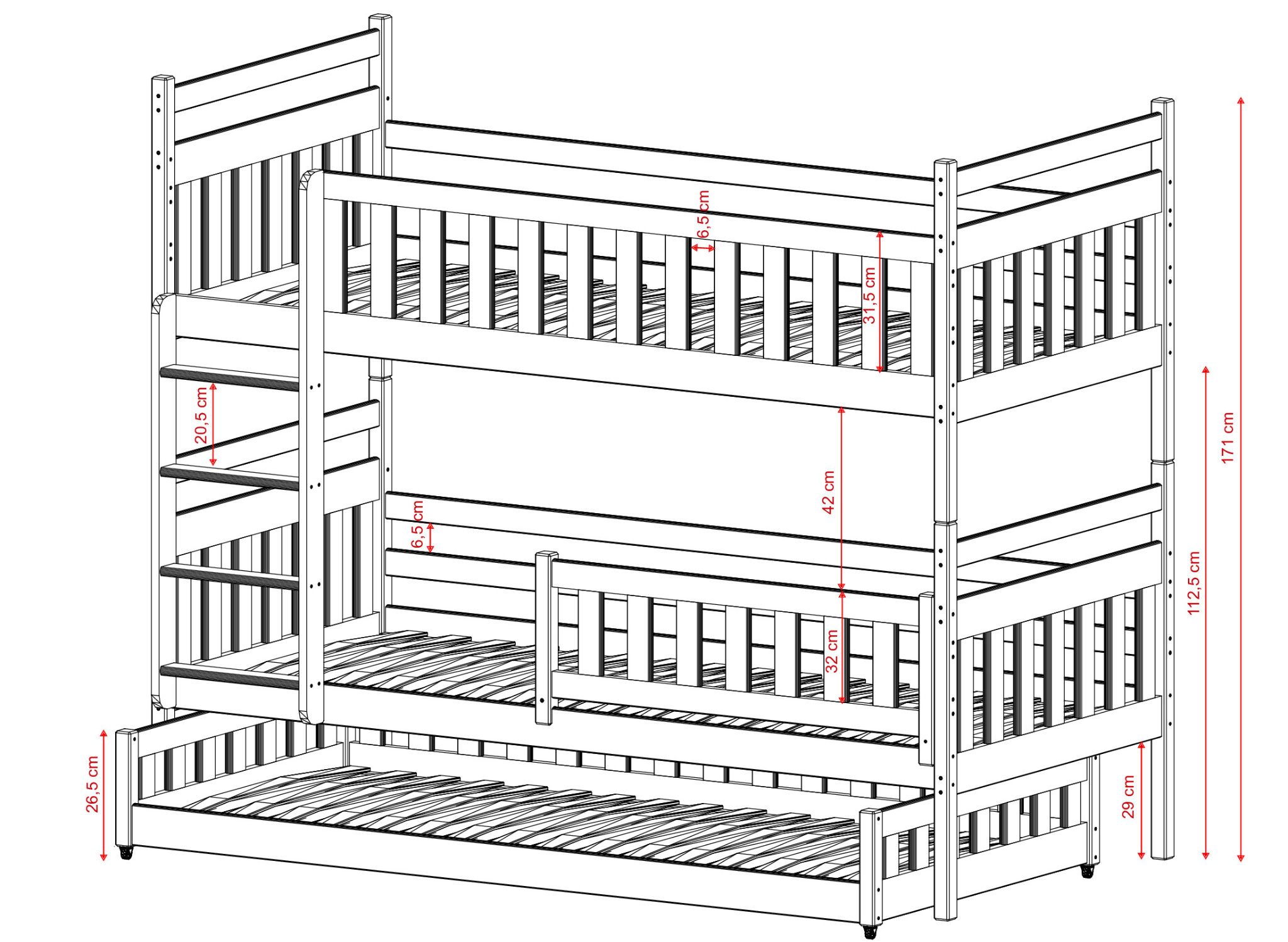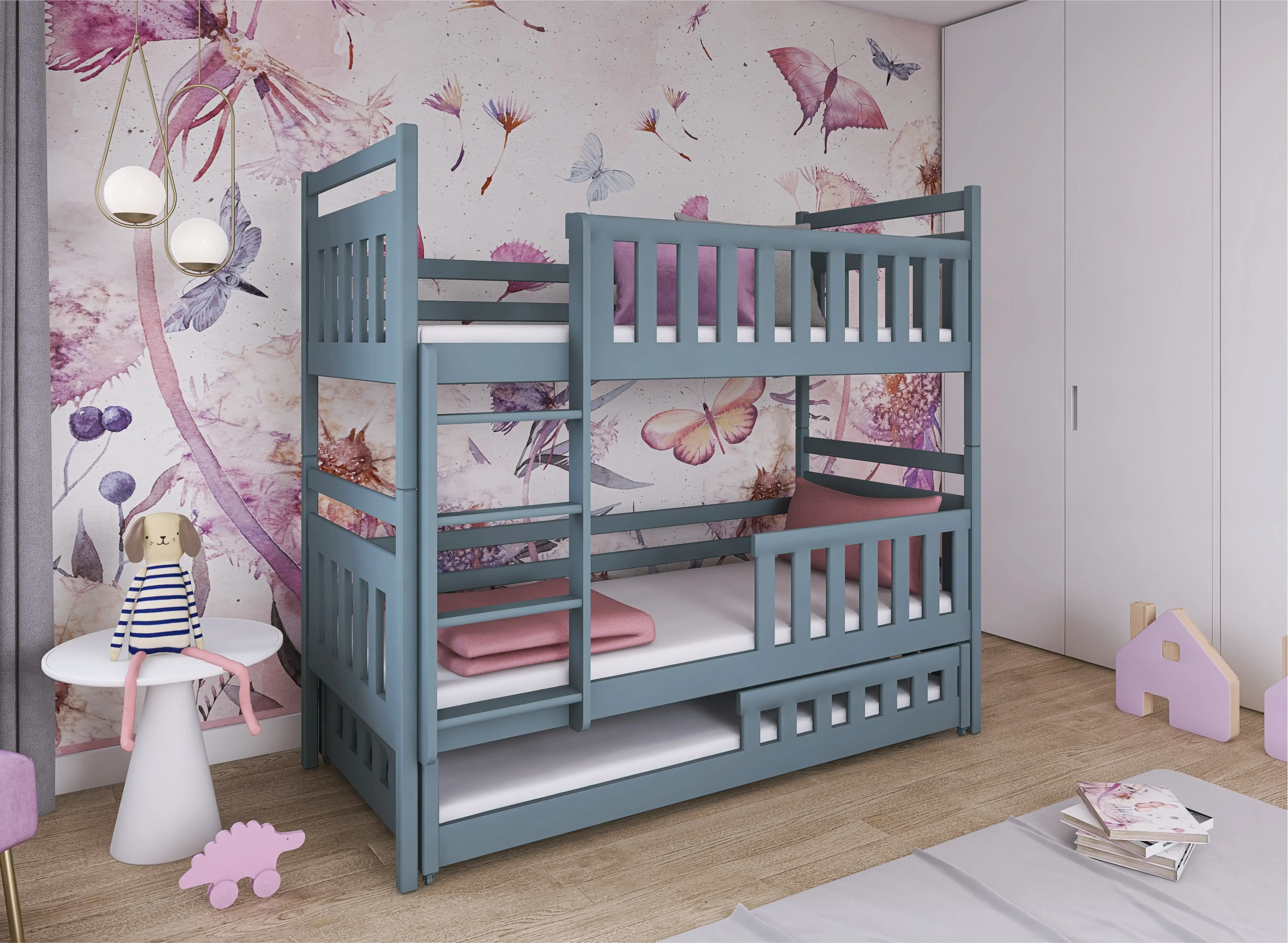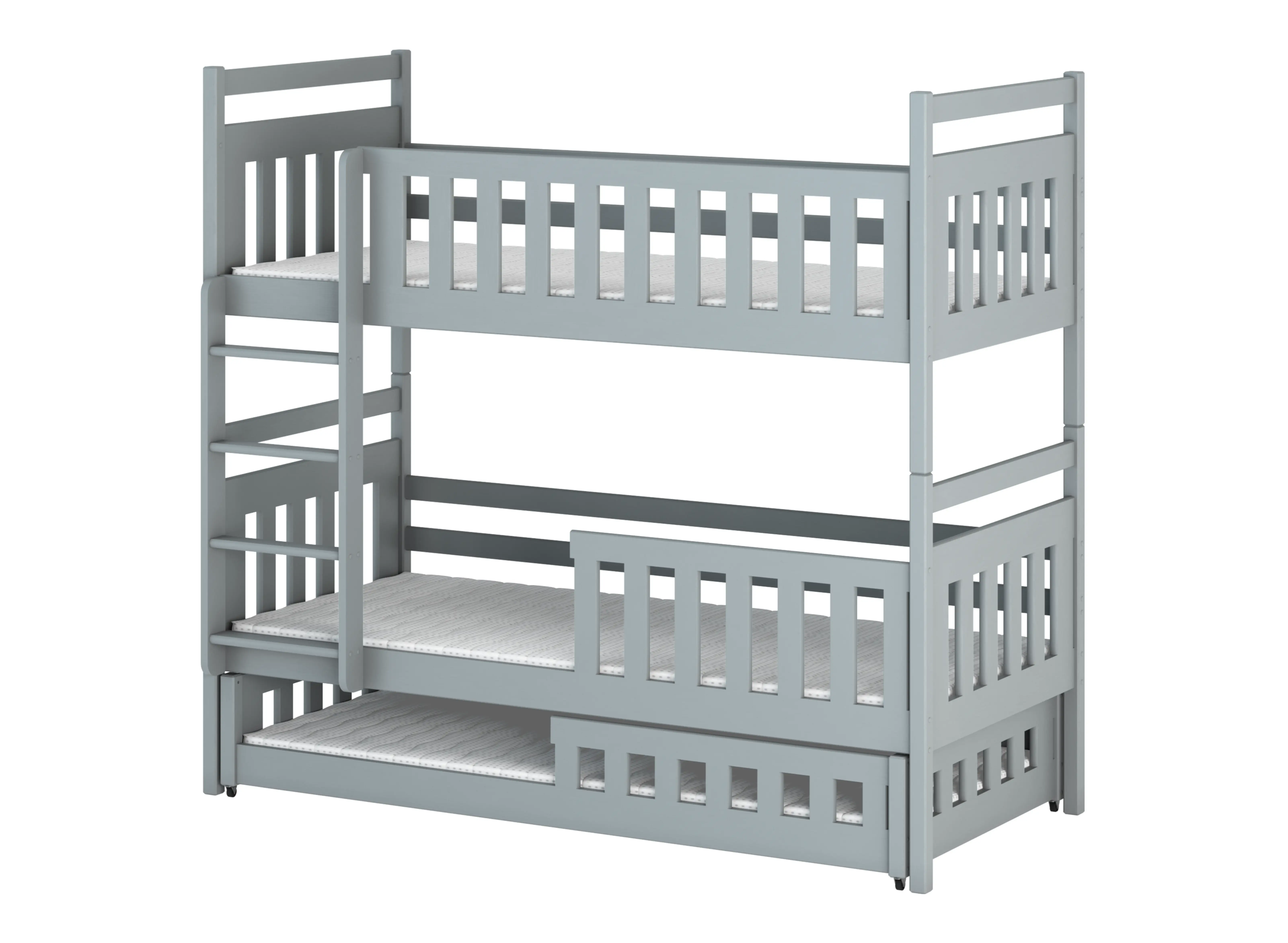 Vous avez trois enfants partageant une seule chambre d'enfant ? Vous recherchez des solutions pratiques ? Si oui, nous avons ce qu'il vous faut. Notre lit superposé OLIWIA combine deux solutions, permettant ainsi d'accueillir trois enfants. Le lit pour frères et sœurs OLIWIA est un lit superposé qui cache, dans sa partie inférieure, un troisième lit indépendant et coulissant. En choisissant notre lit superposé OLIWIA, vous pouvez décider de la manière dont vous souhaitez installer les barrières de sécurité, ainsi que le type de matelas. Grâce à cette personnalisation, vous pouvez facilement adapter le lit superposé OLIWIA non seulement à l'âge, mais aussi aux besoins et aux caractéristiques physiques de vos enfants.