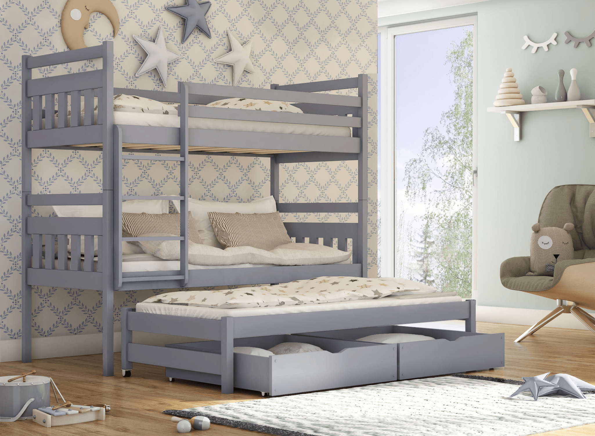 Lano Meubles a créé un lit superposé universel SEWERYN 80x180 en couleur cendre pour la chambre des petits.