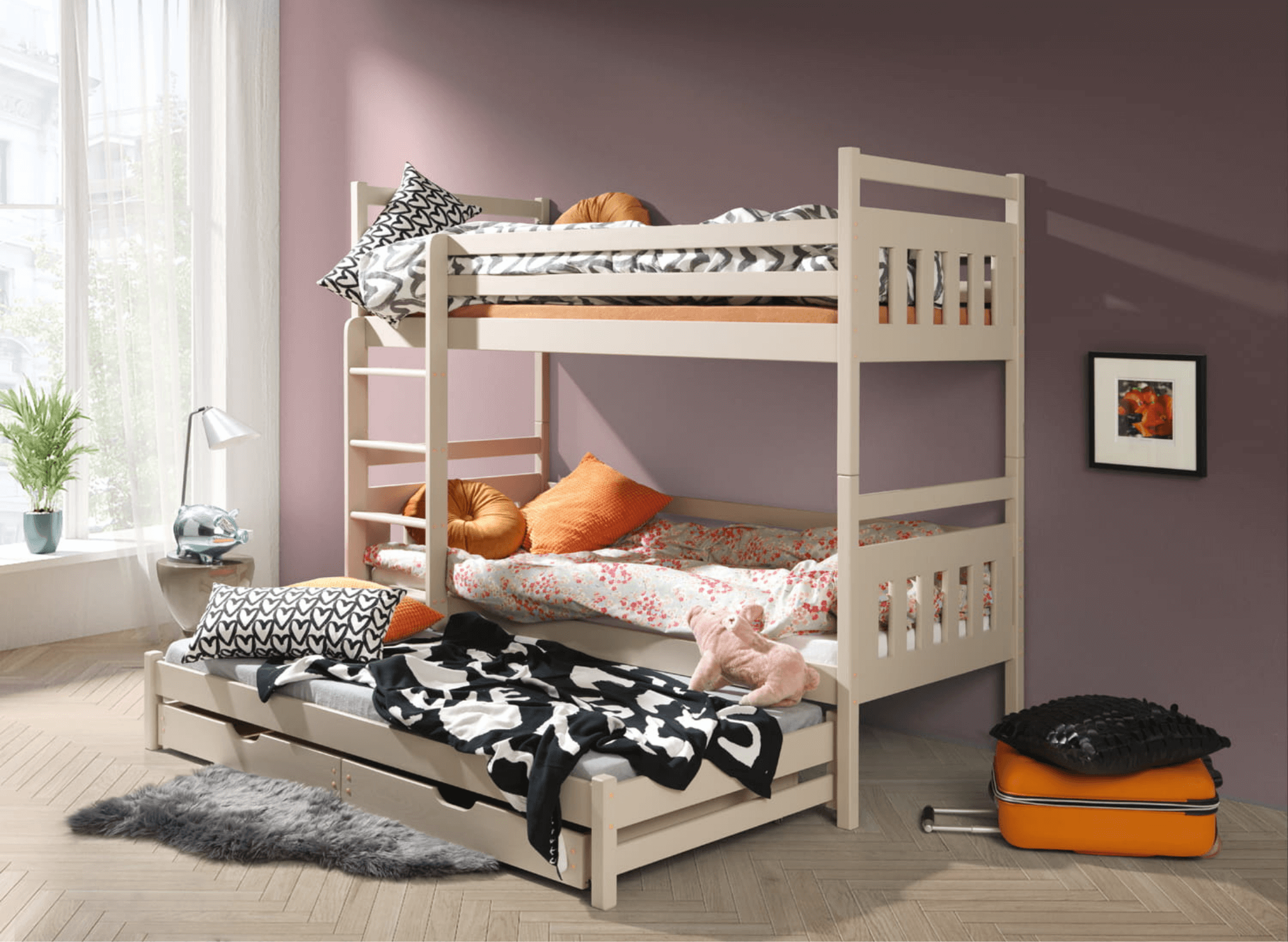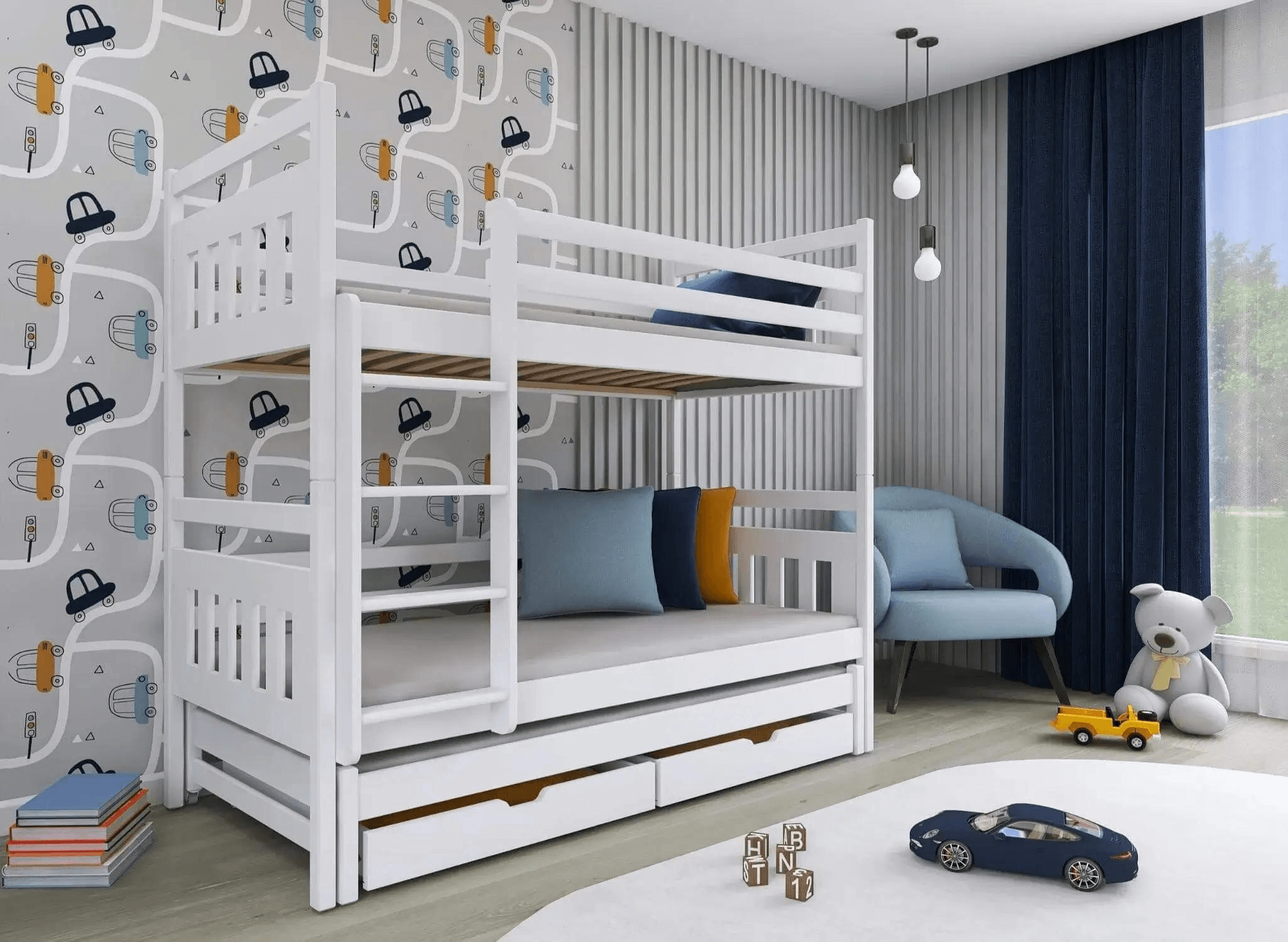Aménager une chambre d'enfant est vraiment un défi de taille. Et si, en plus, vous devez organiser l'espace pour deux enfants vifs et éveillés ? Avec l'aide de Lano Meubles, cela se fera rapidement et facilement. Notre lit superposé SEWERYN est parfait pour les petites pièces où chaque centimètre compte. Qu'est-ce que SEWERYN a de plus que les autres lits pour enfants ? Un couchage caché pour les invités inattendus ou les amis invités de vos enfants. Vous pouvez oublier les situations gênantes où vous devez refuser à un ami de votre enfant de passer la nuit. Il suffit de tirer la partie inférieure du lit superposé SEWERYN, de faire le lit et c'est prêt.