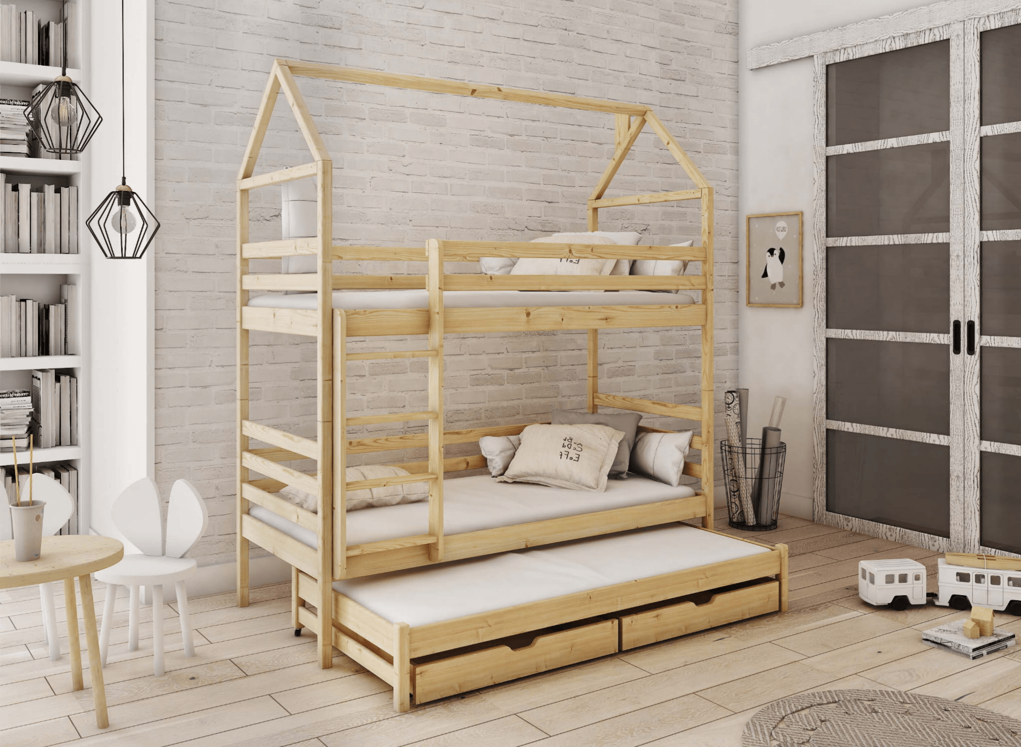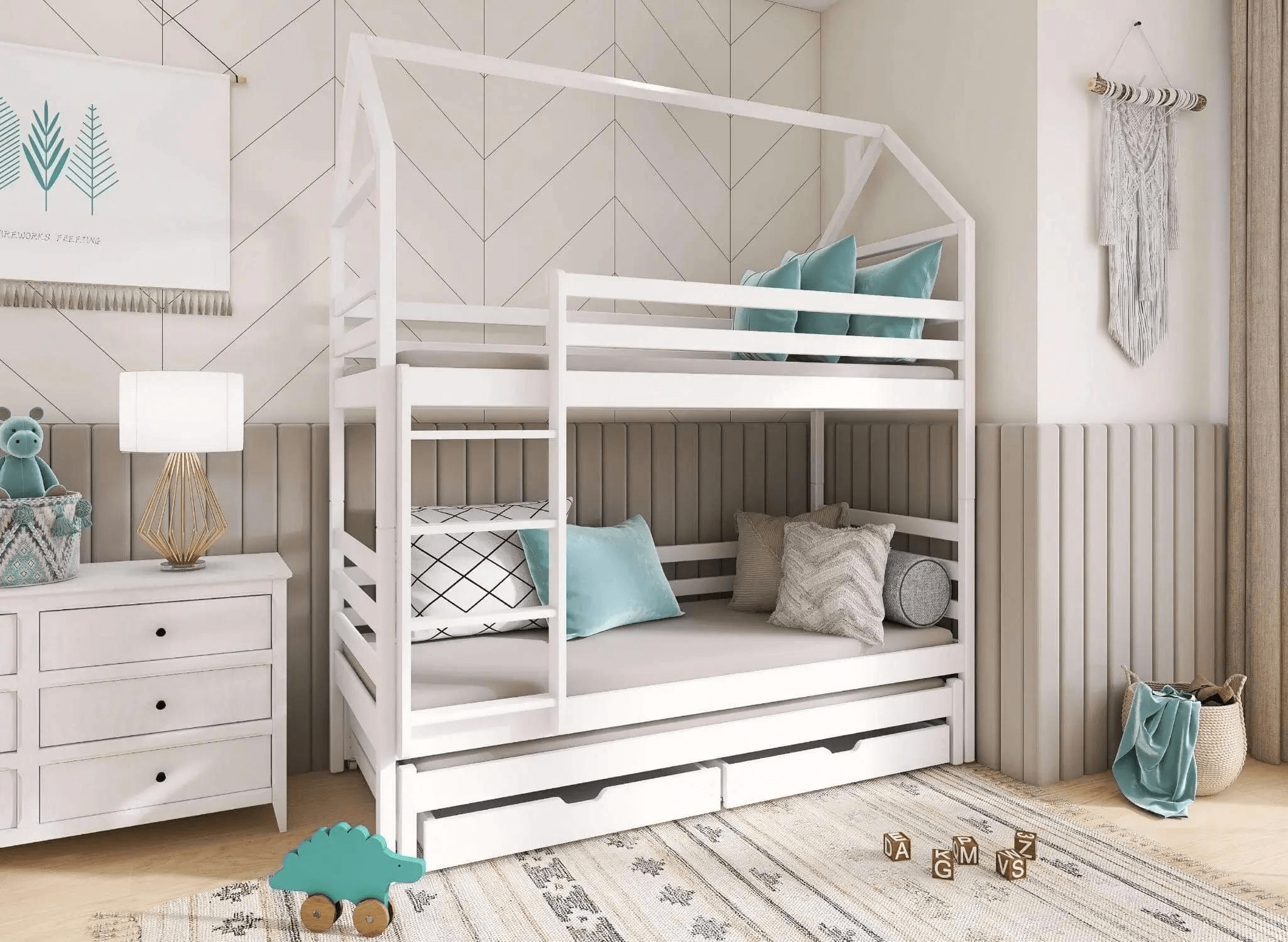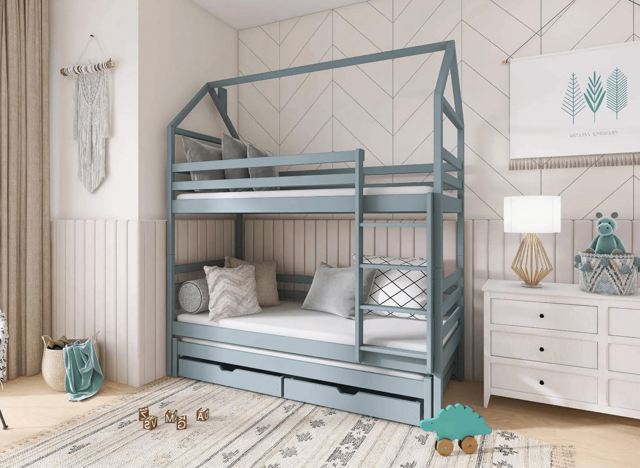 Les lits superposés en forme de maison DALIA ne sont pas seulement une excellente idée pour aménager une petite chambre d'enfant, mais aussi un lieu de jeu créatif. À propos de jeux, si vous manquez de place pour les jouets ou autres objets d'enfants, alors le lit superposé en forme de maison DALIA a une solution pour vous. Le meuble dispose de deux tiroirs de rangement spacieux qui aideront à maintenir l'ordre dans la pièce.