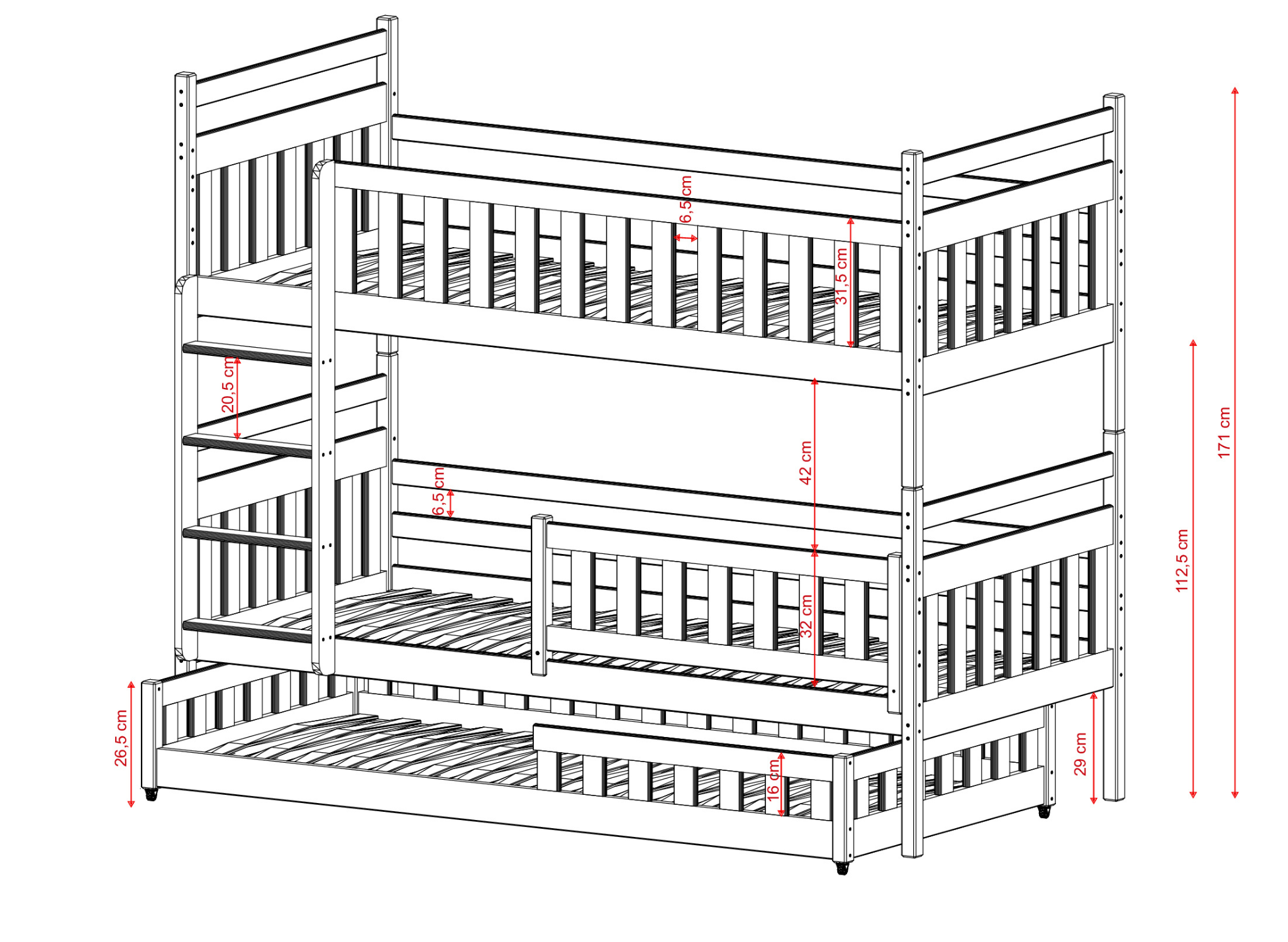 Vous avez trois enfants partageant une seule chambre d'enfant ? Vous recherchez des solutions pratiques ? Si oui, nous avons ce qu'il vous faut. Notre lit superposé OLIWIA combine deux solutions, permettant ainsi d'accueillir trois enfants. Le lit pour frères et sœurs OLIWIA est un lit superposé qui cache, dans sa partie inférieure, un troisième lit indépendant et coulissant. En choisissant notre lit superposé OLIWIA, vous pouvez décider de la manière dont vous souhaitez installer les barrières de sécurité, ainsi que le type de matelas. Grâce à cette personnalisation, vous pouvez facilement adapter le lit superposé OLIWIA non seulement à l'âge, mais aussi aux besoins et aux caractéristiques physiques de vos enfants.
