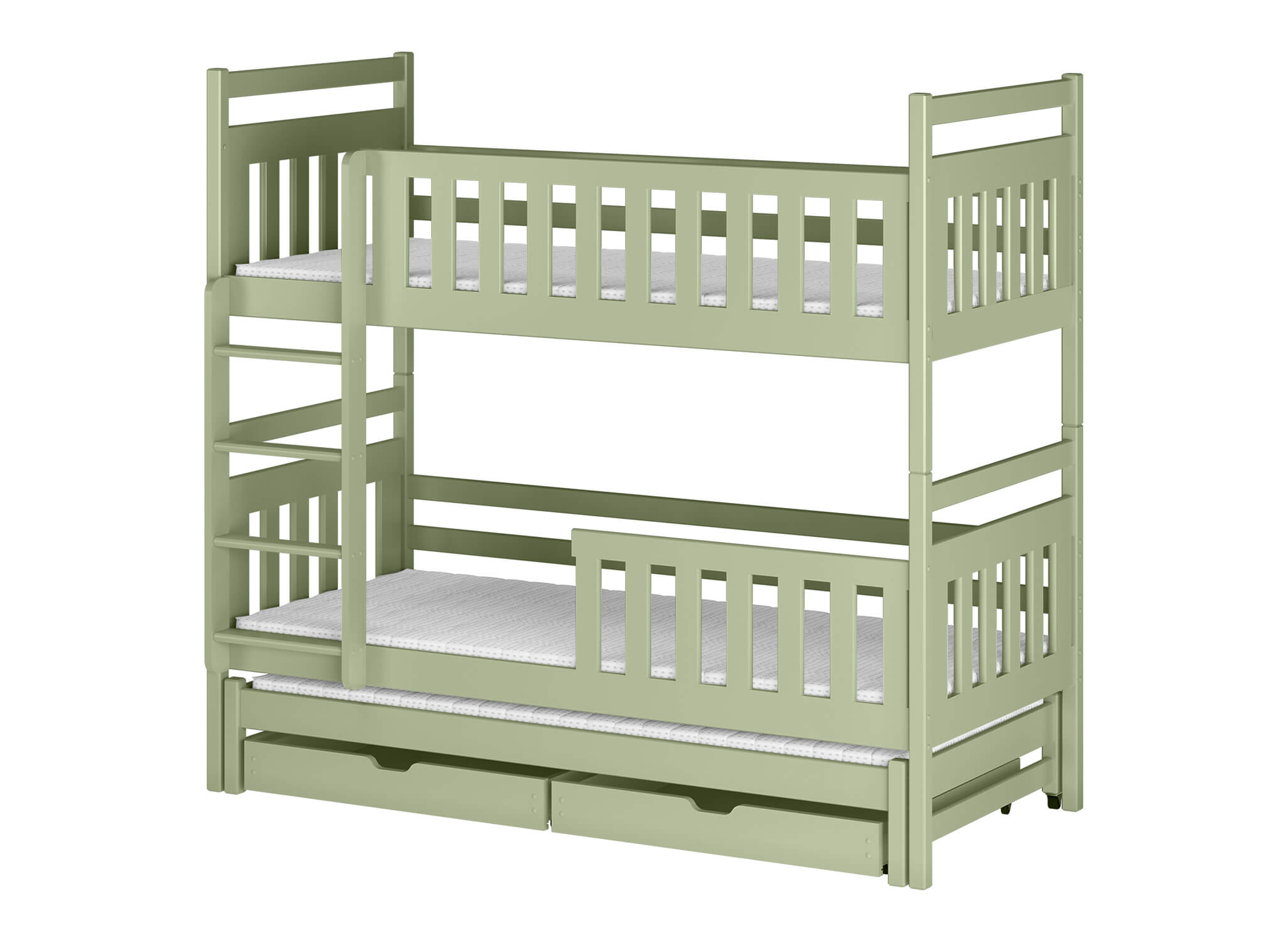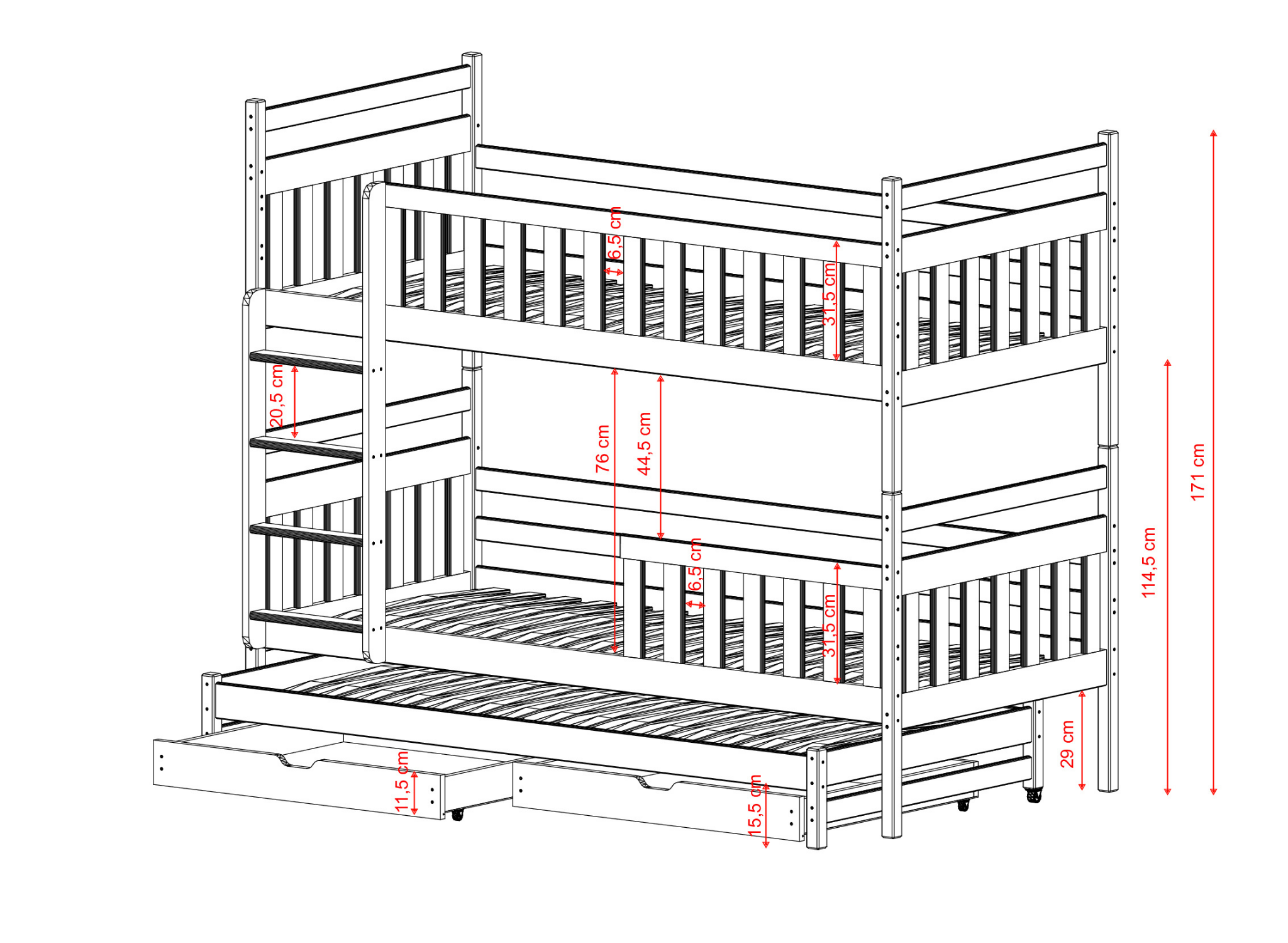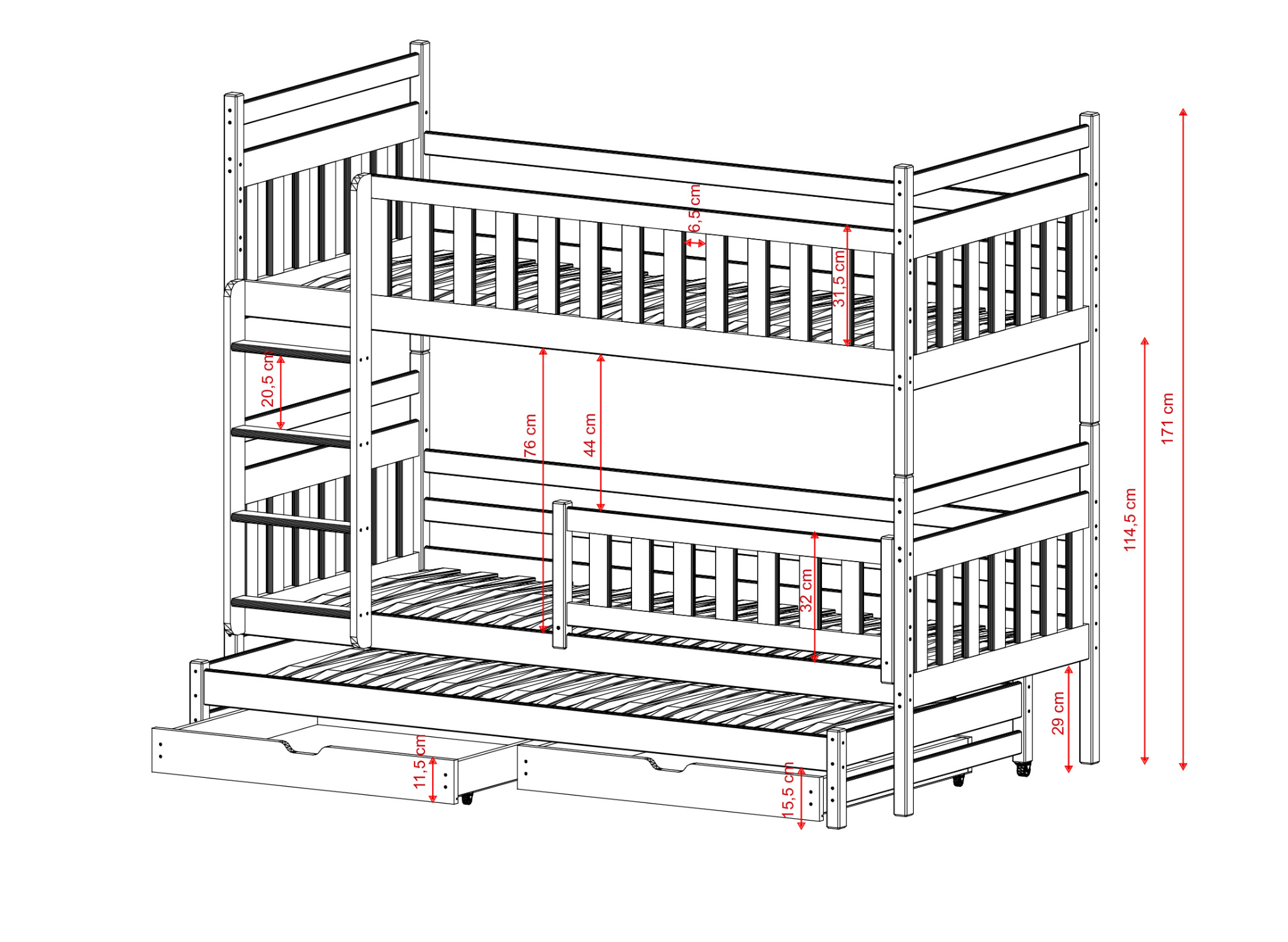 Le lit superposé KLARA de Lano Meubles est fabriqué avec le plus grand soin pour chaque détail, même le plus petit. Les matériaux que nous utilisons sont de la plus haute qualité, car nous voulons garantir à votre enfant un sommeil sain et paisible. Le lit superposé KLARA est une proposition intéressante pour une chambre d'enfant aménagée dans un style classique. Le cadre classique du lit superposé KLARA constituera un accent intéressant dans le royaume de vos enfants. Le bois de pin protégé par une peinture antiallergique assurera la durabilité du lit superposé KLARA pendant de nombreuses années. KLARA est un lit superposé trois places qui répondra aux besoins des enfants les plus exigeants. Les barrières de protection sont disponibles en deux versions – fixes ou amovibles. Cette dernière option vous permettra de démonter la barrière pendant la journée, lorsque les enfants veulent simplement jouer. Vous pouvez la remettre en place la nuit pour assurer la sécurité de votre enfant pendant son sommeil. Le lit superposé KLARA dispose également d'un espace pour un matelas confortable sur le niveau coulissant. C'est une proposition intéressante lorsque vous avez des enfants d'âges similaires ou lorsque vous recevez fréquemment des invités.