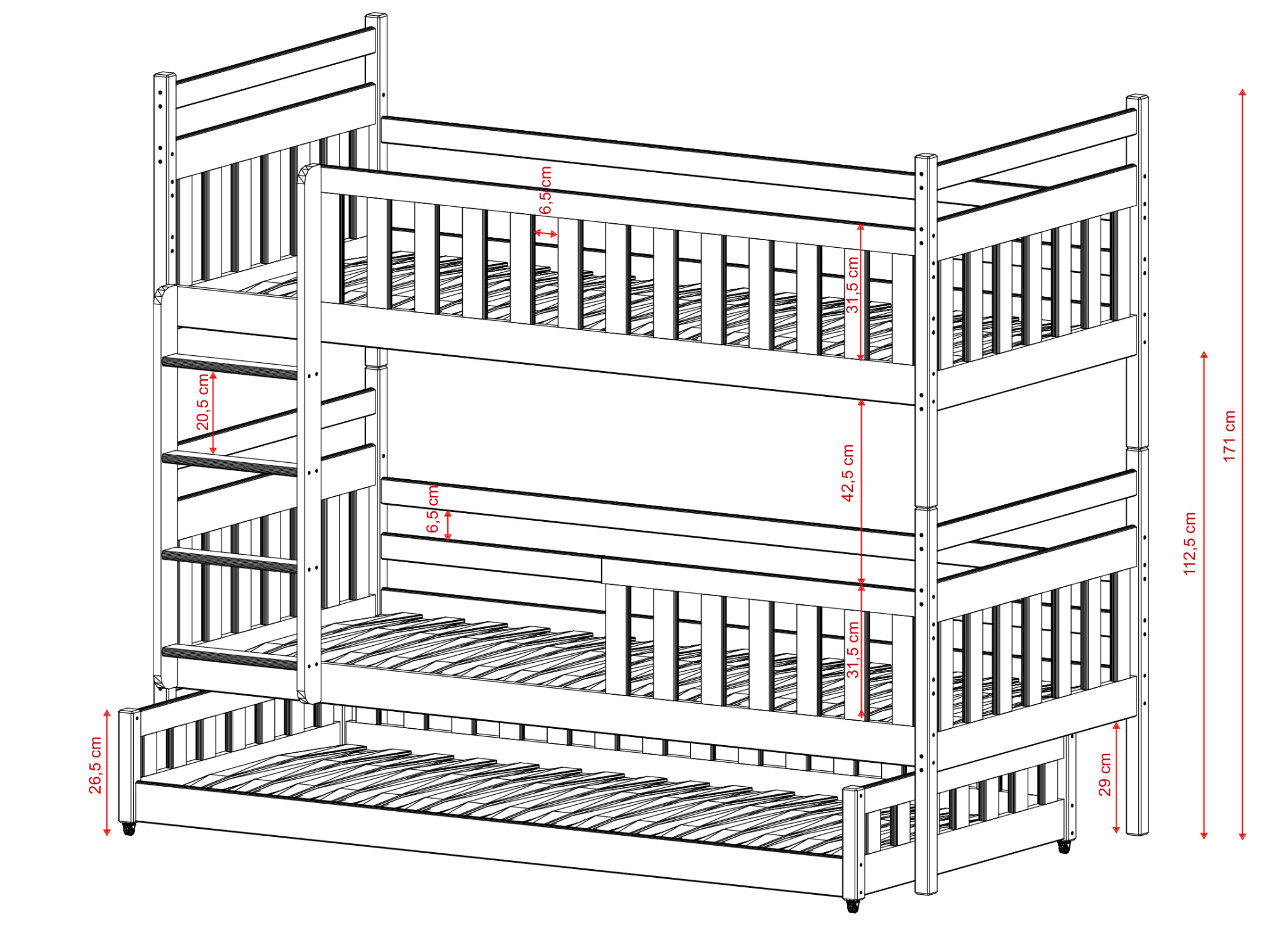 Vous avez trois enfants partageant une seule chambre d'enfant ? Vous recherchez des solutions pratiques ? Si oui, nous avons ce qu'il vous faut. Notre lit superposé OLIWIA combine deux solutions, permettant ainsi d'accueillir trois enfants. Le lit pour frères et sœurs OLIWIA est un lit superposé qui cache, dans sa partie inférieure, un troisième lit indépendant et coulissant. En choisissant notre lit superposé OLIWIA, vous pouvez décider de la manière dont vous souhaitez installer les barrières de sécurité, ainsi que le type de matelas. Grâce à cette personnalisation, vous pouvez facilement adapter le lit superposé OLIWIA non seulement à l'âge, mais aussi aux besoins et aux caractéristiques physiques de vos enfants.