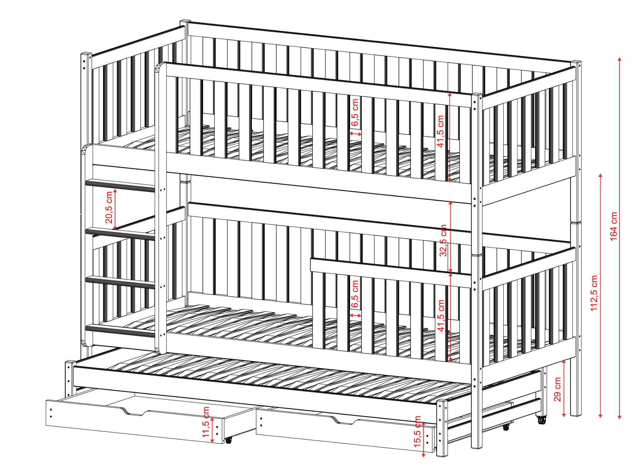 Vos enfants partagent une seule chambre ? Ils sont deux ou trois ? Le lit superposé LEA a été conçu pour les frères et sœurs qui veulent ou doivent dormir ensemble en raison d'un espace réduit. Il se compose de deux lits – un en bas et un en haut, accessible par une échelle pratique. De plus, vous pouvez tirer une plateforme avec un matelas de sous le lit inférieur, formant ainsi un troisième lit. Le lit superposé LEA répondra certainement aux besoins d'une grande famille.