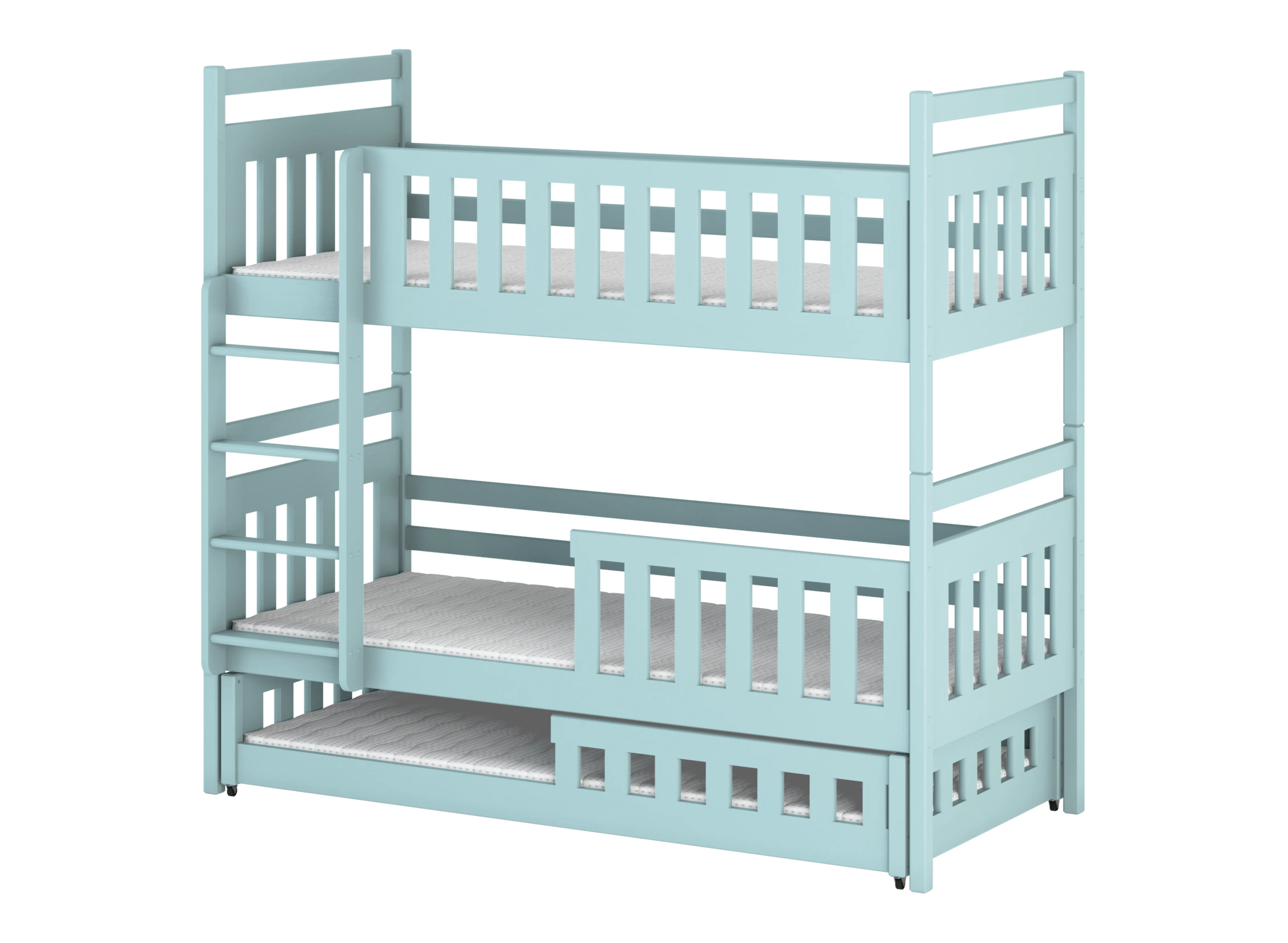 Vous avez trois enfants partageant une seule chambre d'enfant ? Vous recherchez des solutions pratiques ? Si oui, nous avons ce qu'il vous faut. Notre lit superposé OLIWIA combine deux solutions, permettant ainsi d'accueillir trois enfants. Le lit pour frères et sœurs OLIWIA est un lit superposé qui cache, dans sa partie inférieure, un troisième lit indépendant et coulissant. En choisissant notre lit superposé OLIWIA, vous pouvez décider de la manière dont vous souhaitez installer les barrières de sécurité, ainsi que le type de matelas. Grâce à cette personnalisation, vous pouvez facilement adapter le lit superposé OLIWIA non seulement à l'âge, mais aussi aux besoins et aux caractéristiques physiques de vos enfants.