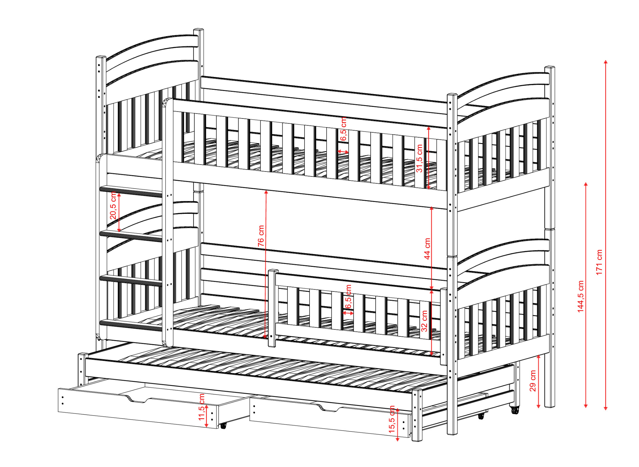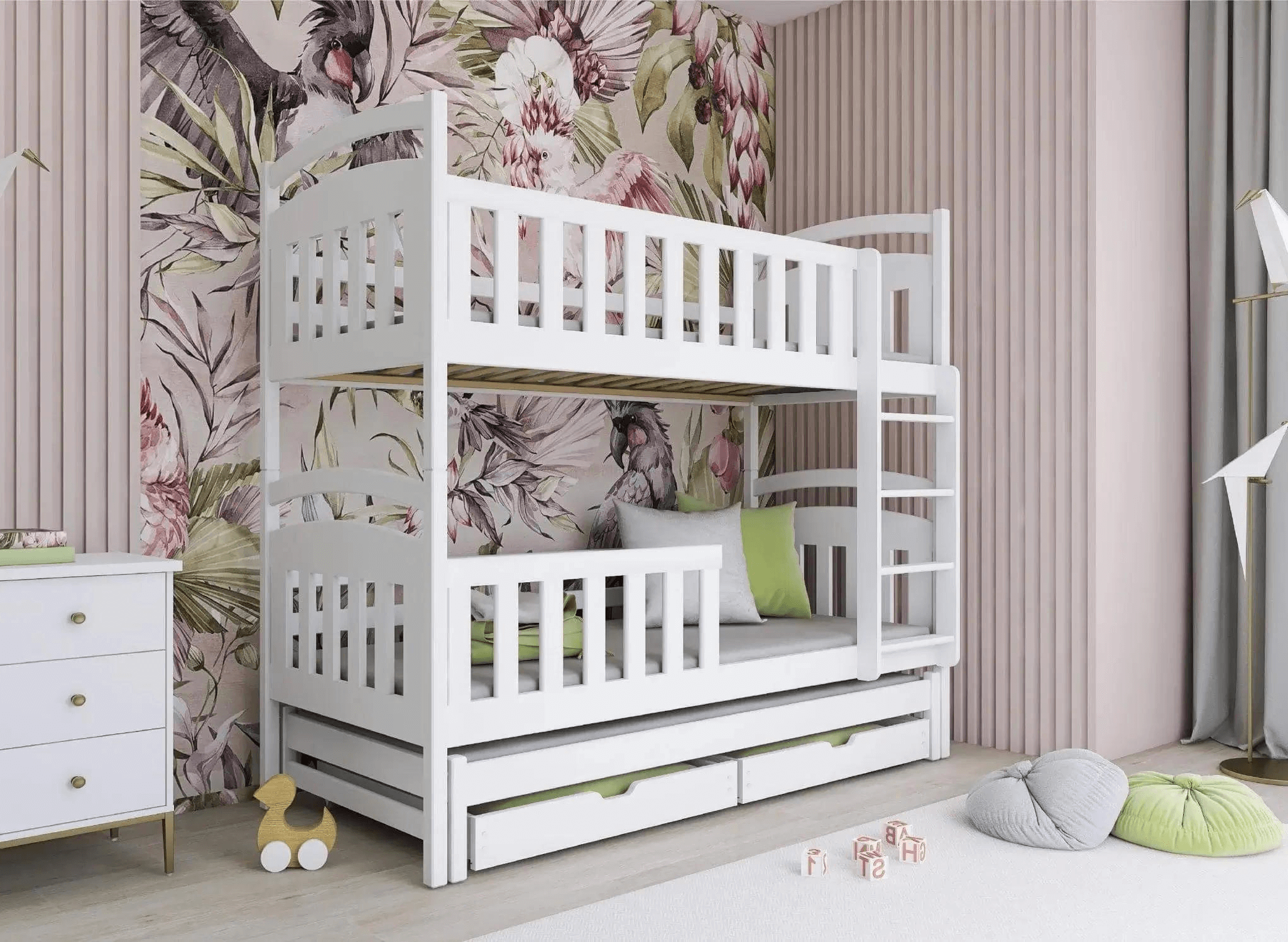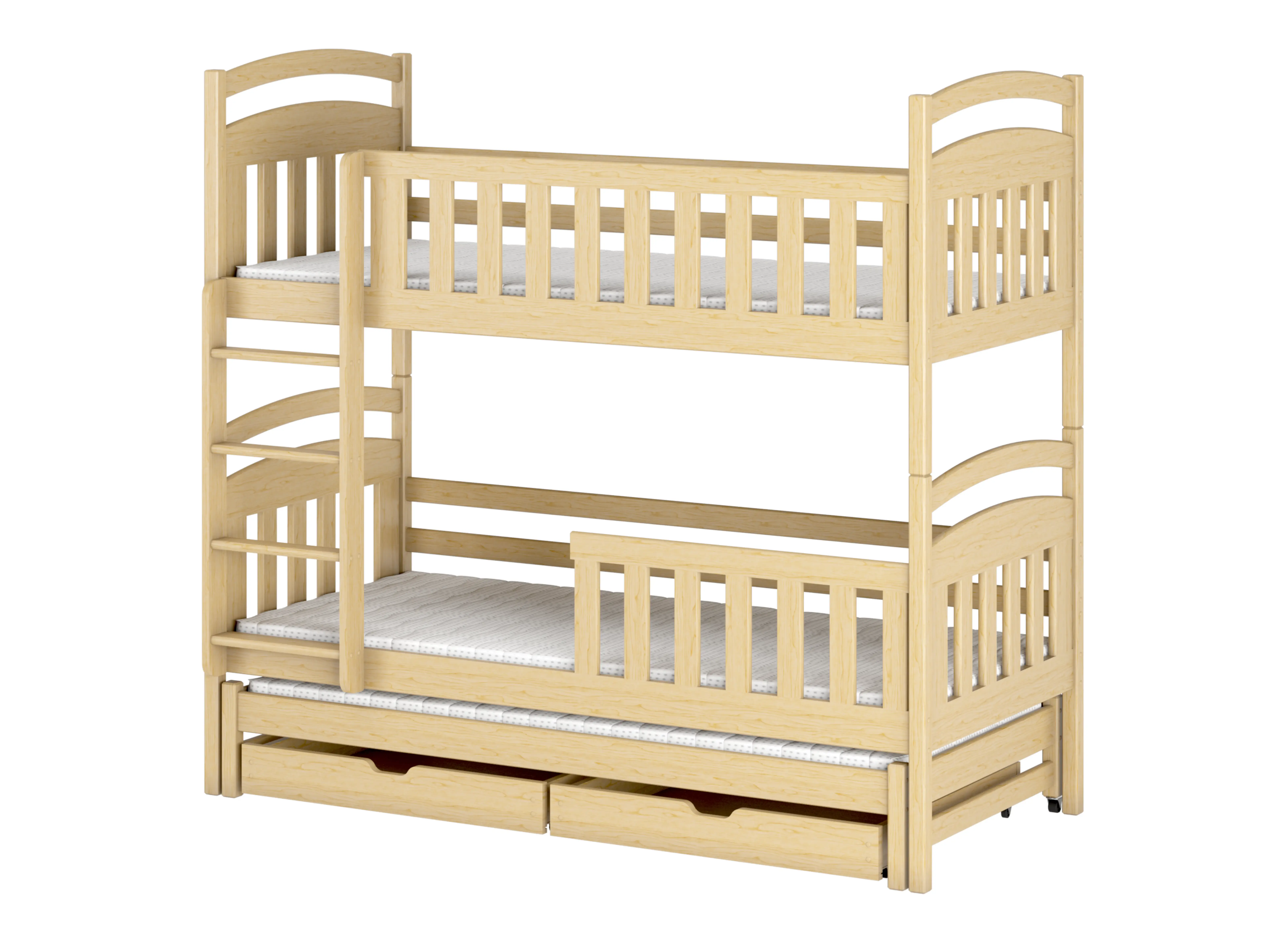 Le lit superposé VIKI est fabriqué en bois de pin. Ce matériau est durable, résistant aux dommages mécaniques et capable de supporter de lourdes charges. La construction du lit pour frères et sœurs VIKI est donc extrêmement solide. De plus, il s'agit d'un lit avec tiroirs, offrant un espace de rangement supplémentaire pour les draps ou les jouets.