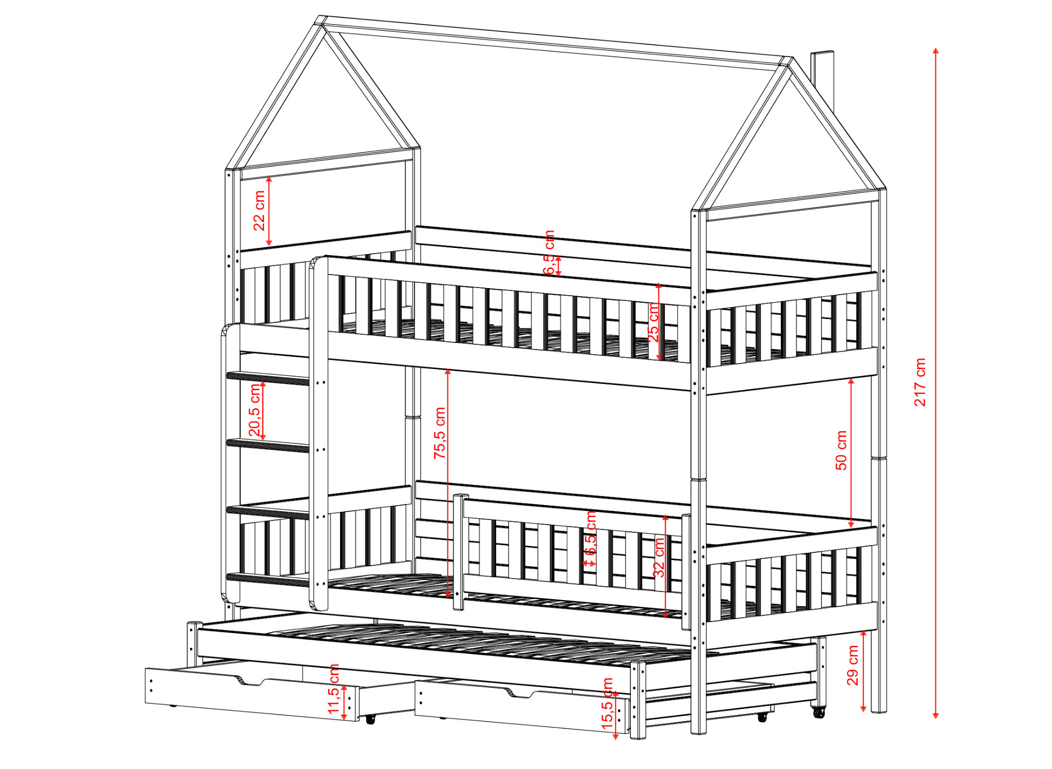 Le lit superposé cabane IGA est équipé de deux tiroirs spacieux pour ranger la literie, les vêtements, les jouets ou autres objets pour enfants. Grâce à cette solution, vous économiserez beaucoup d'espace et maintiendrez la chambre des enfants propre et bien organisée. N'oubliez pas qu'en choisissant le lit superposé cabane IGA, les tiroirs seront fabriqués en combinaison avec du panneau de particules.