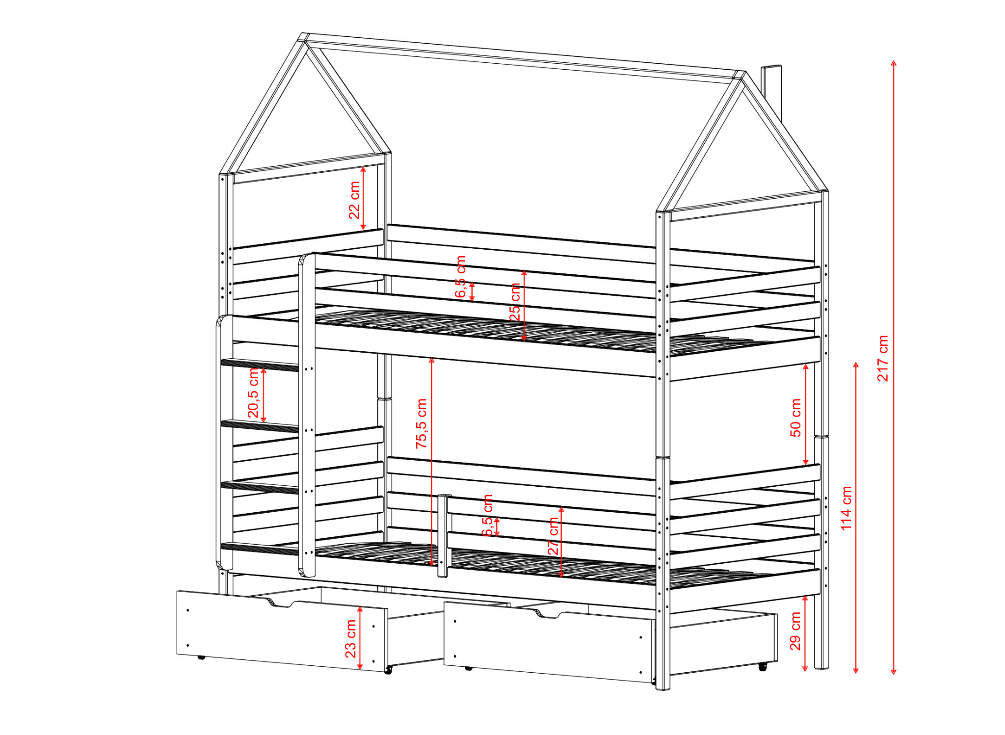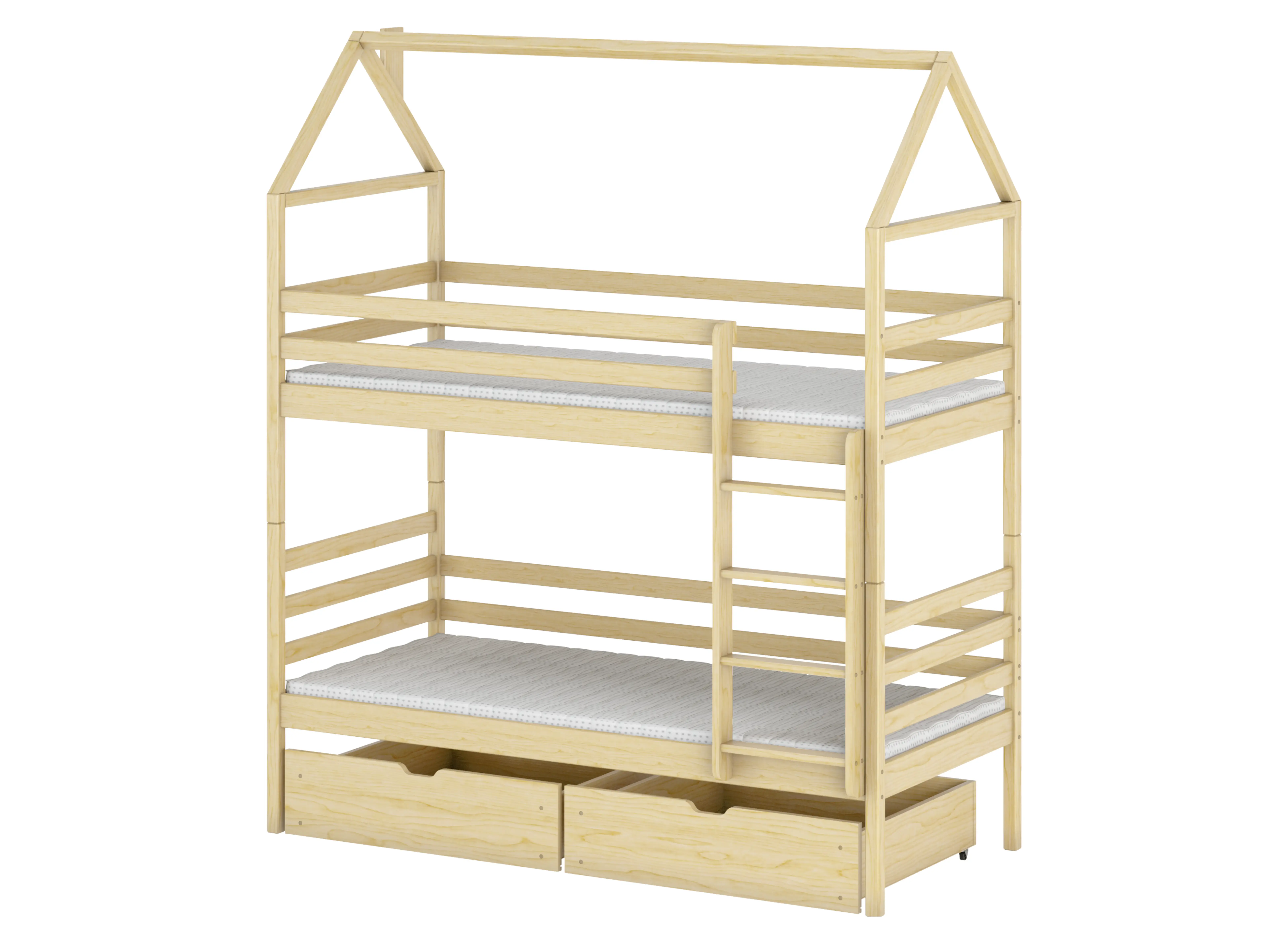 Le lit superposé cabane ALEX est une excellente base pour les enfants et un refuge après une journée épuisante à l'école. Nous devons mentionner la protection complète qu'offre cette construction. L'échelle du lit enfant ALEX dispose de barreaux profilés de manière appropriée, assurant une montée et une descente sécurisées du lit. Toutes les planches montées dans le cadre empêchent les chutes et garantissent une tranquillité d'esprit totale, même pour les petits très actifs. Le lit enfant cabane ALEX est un style qui ne passera pas inaperçu. Tout comme pour les petits. Grâce à lui, vous créerez un espace féerique qui favorisera le développement, le bien-être et la créativité de chaque enfant. Chaque moment passé sur le lit enfant ALEX avec toit sera inoubliable. Ne vous laissez pas tromper par le caractère charmant du lit superposé ALEX. C'est un lit entièrement fonctionnel et sûr pour deux frères et sœurs. De plus, la structure en forme de toit au-dessus du lit peut être utilisée comme partie de la protection.
