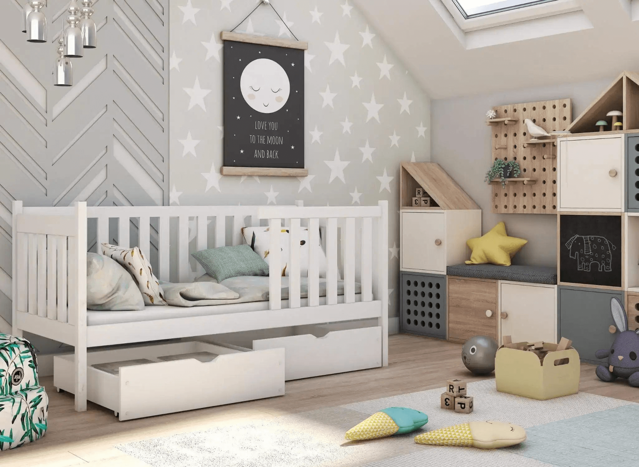 Les enfants aiment être autonomes dès leur plus jeune âge, alors laissez votre enfant découvrir le monde selon ses propres règles. Notre lit enfant ALICJA soutient le développement de votre petit. La hauteur du cadre permet à votre enfant de monter et descendre du lit de manière autonome, ce qui augmentera certainement sa confiance en lui. Depuis les premiers instants, vous vous souciez et prenez soin de votre enfant. Permettez-nous de vous enlever un peu de ce souci. Notre lit enfant ALICJA, fabriqué en bois de pin, est résistant aux dommages mécaniques. Nous n'oublions pas non plus les peintures. Nous savons que les enfants découvrent le monde en mettant divers objets à la bouche à un stade précoce. C'est pourquoi notre lit enfant ALICJA est peint avec des peintures qui ne menacent pas la santé de votre enfant.