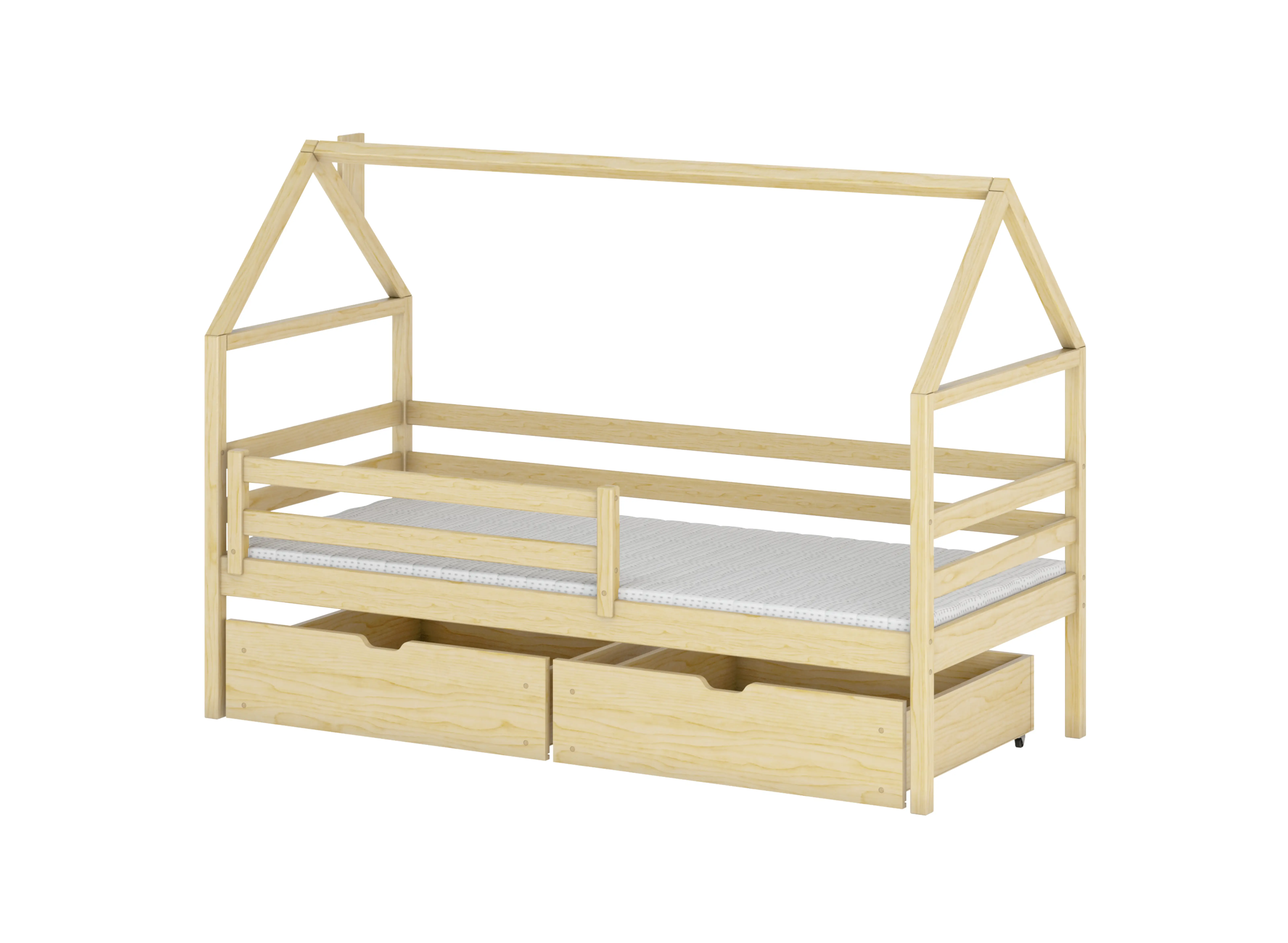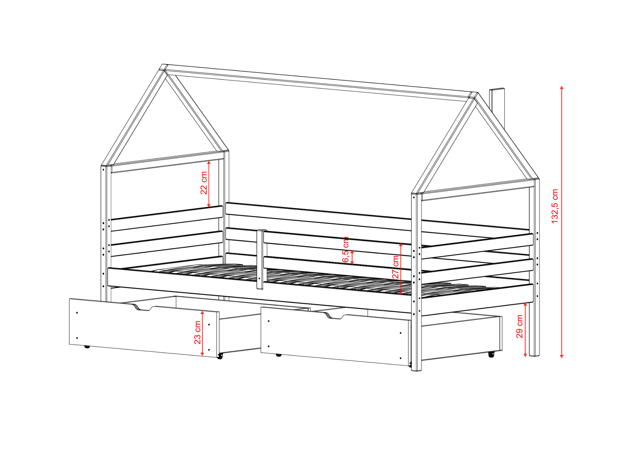Le lit enfant type cabane ARON de Lano Meubles est le rêve de chaque enfant devenu réalité. C'est un meuble conçu dans une forme qui stimule la créativité de chaque petit. Sa construction réfléchie, sa grande robustesse et sa stabilité garantissent des années d'utilisation sans problème et le sourire de votre enfant chaque jour. Chez Lano Meubles, nous accordons beaucoup d'attention non seulement à l'aspect visuel, mais aussi à la fonctionnalité. Le lit enfant ARON n'est pas seulement un meuble confortable pour dormir, mais aussi une solution de rangement pour divers accessoires pour enfants. Sous le lit, il y a suffisamment de place pour ajouter 2 tiroirs spacieux. Vous pouvez les acheter en option lors de la configuration du produit. Bonne humeur et repos confortable garantis.