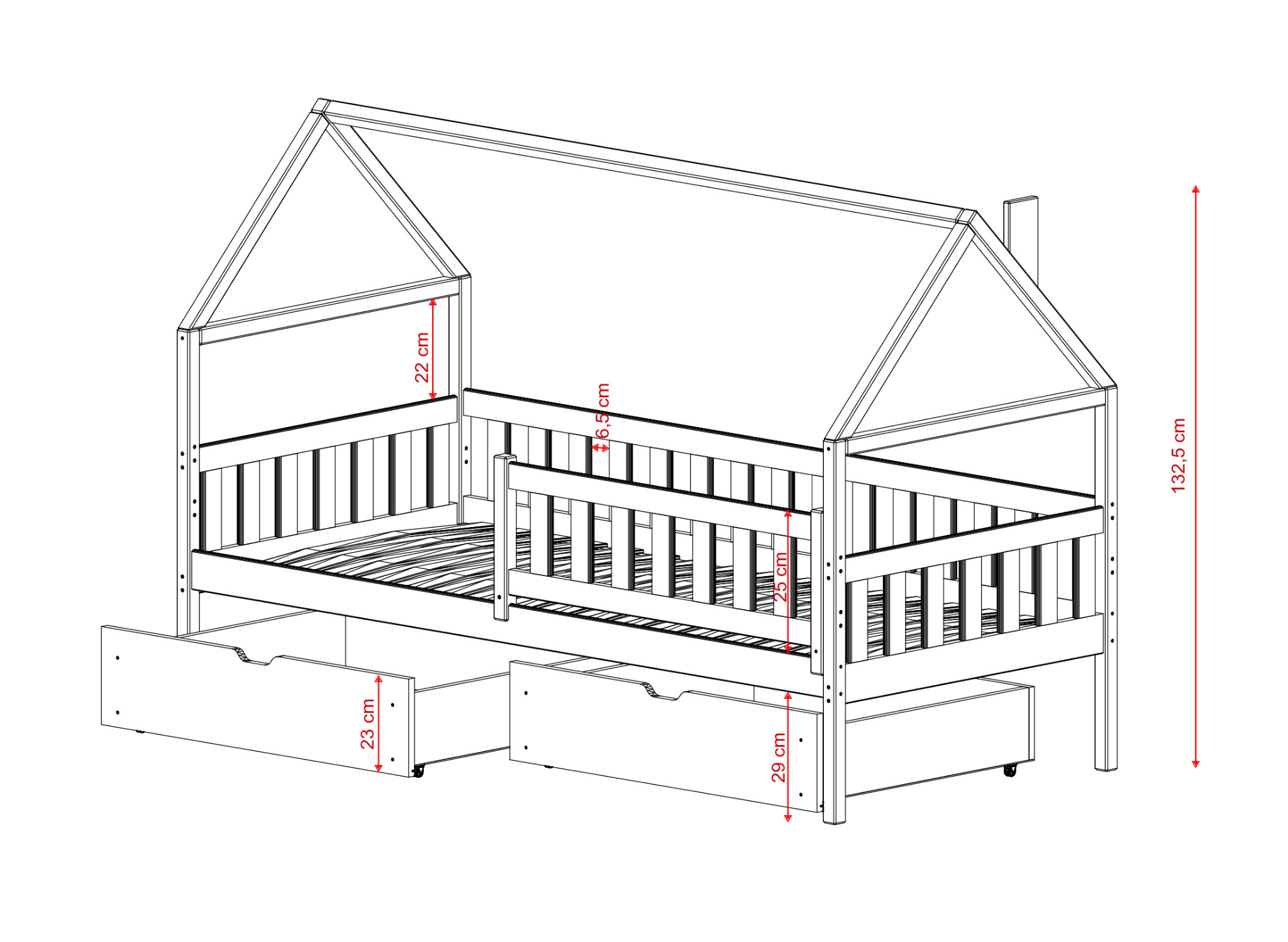 Tous nos produits répondent aux normes de sécurité les plus strictes pour les meubles pour enfants. Pour fabriquer ce modèle, nous avons utilisé du bois de pin, non seulement durable, mais également issu de la gestion forestière responsable. Ainsi, le lit cabane DOMI est respectueux de l'environnement. Nous pouvons le peindre de la couleur de rêve de votre enfant, et nous le ferons avec des laques non toxiques. Dans une chambre d'enfant, il manque toujours de l'espace de rangement, que ce soit pour les jouets, les vêtements d'hiver ou les jeux de rechange. Ce modèle de meuble pour enfant est équipé de deux tiroirs coulissants de grande capacité, qui seront sûrement très utiles.