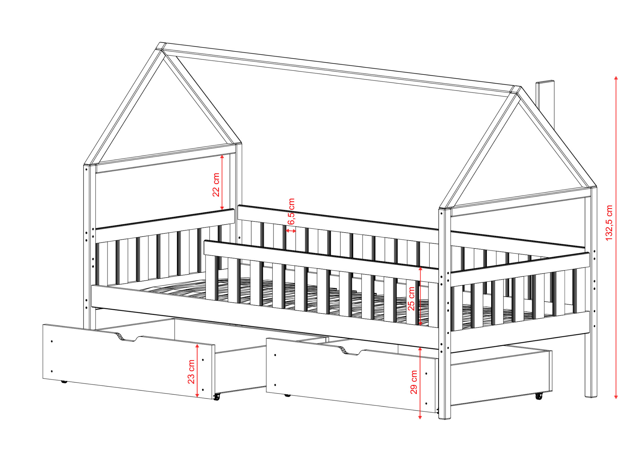 Tous nos produits répondent aux normes de sécurité les plus strictes pour les meubles pour enfants. Pour fabriquer ce modèle, nous avons utilisé du bois de pin, non seulement durable, mais également issu de la gestion forestière responsable. Ainsi, le lit cabane DOMI est respectueux de l'environnement. Nous pouvons le peindre de la couleur de rêve de votre enfant, et nous le ferons avec des laques non toxiques. Dans une chambre d'enfant, il manque toujours de l'espace de rangement, que ce soit pour les jouets, les vêtements d'hiver ou les jeux de rechange. Ce modèle de meuble pour enfant est équipé de deux tiroirs coulissants de grande capacité, qui seront sûrement très utiles.