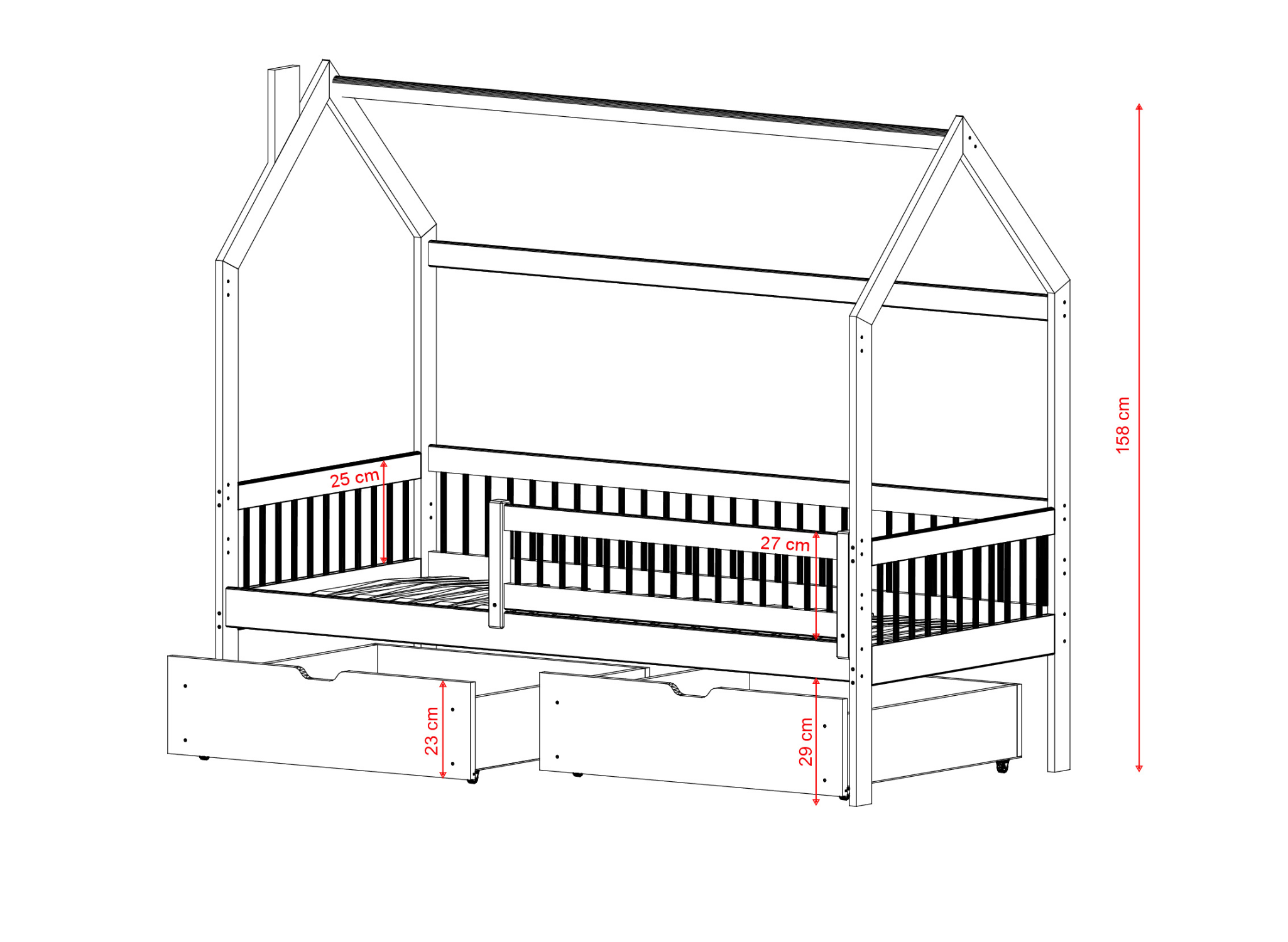 Le lit cabane pour enfant OSKAR est un meuble qui animera la décoration de la chambre de votre enfant et garantira un sommeil paisible à votre petit. Son design universel s'intègre parfaitement dans tous les styles de décoration, et son apparence charmante plaira autant aux filles qu'aux garçons. Le lit cabane pour enfant OSKAR est un véritable rêve devenu réalité et évoque le style des meilleures contes de fées de Disney. Chaque enfant rêve de dormir confortablement pour se régénérer après une journée de jeux et d'apprentissage. Cela est possible grâce à un sommier confortable et à un matelas bien choisi.Le lit cabane pour enfant OSKAR assure un sommeil sûr et paisible, mais ce n'est pas tout. Il fait sourire chaque fois qu'on le regarde ! De plus, le lit cabane pour enfant OSKAR offre encore plus de fonctionnalités. Il dispose de deux tiroirs spacieux en dessous, qui vous aideront à mieux organiser l'espace.