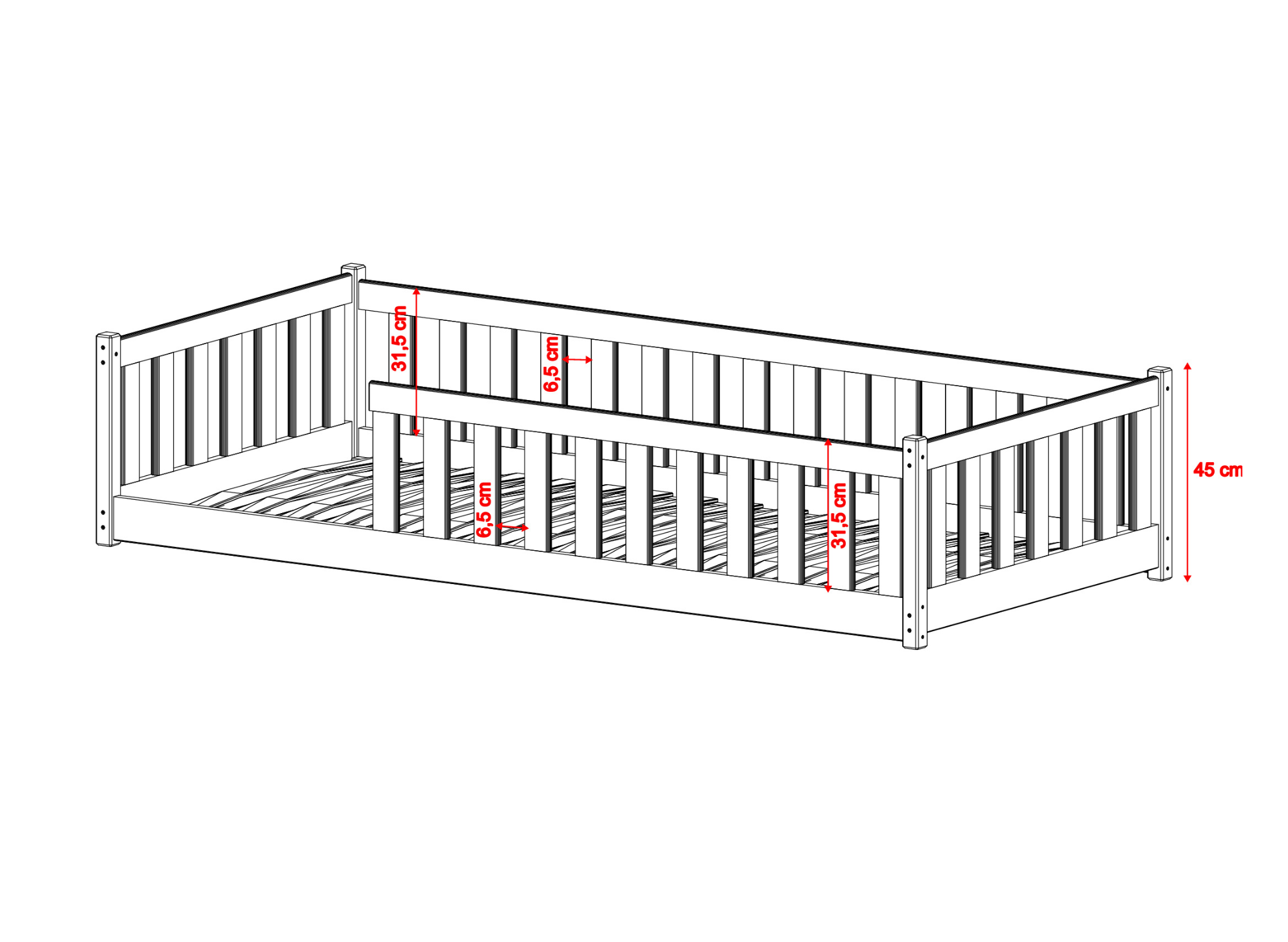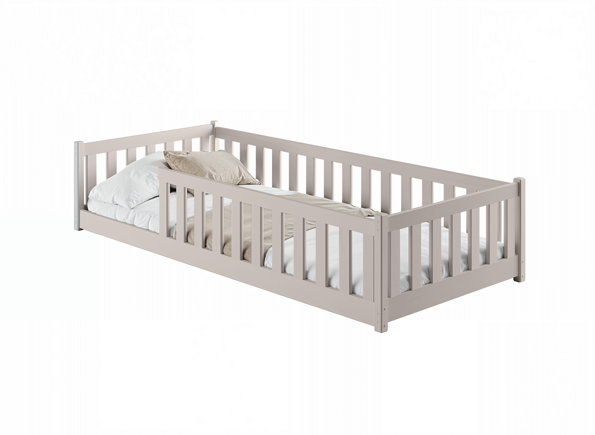 Lit-parc BELLA, un lit d'enfant bas conçu pour les tout-petits. Sa barrière de protection réduit le risque que l'enfant tombe accidentellement du lit pendant son sommeil. L'entrée du lit peut être placée soit sur le côté gauche, soit sur le côté droit – vous décidez lors du montage. Le lit BELLA est fabriqué en pin solide et sûr. Disponible en plusieurs couleurs – du ton bois classique, cachemire et gris jusqu'au rose et au bleu. Grâce à cette variété, vous pouvez l'adapter facilement à la décoration de la chambre d'enfant. Il convient tant aux garçons qu'aux filles. Disponible en 6 tailles, ce qui le rend également idéal pour les chambres d'enfants plus âgés. Chez Lano Meubles, nous savons combien le confort est important pour votre tout-petit. C'est pourquoi vous pouvez choisir parmi différents types de matelas pour le lit – disponibles en plusieurs tailles et fabriqués à partir de divers matériaux. Tous les matériaux utilisés pour fabriquer les lits sont certifiés.