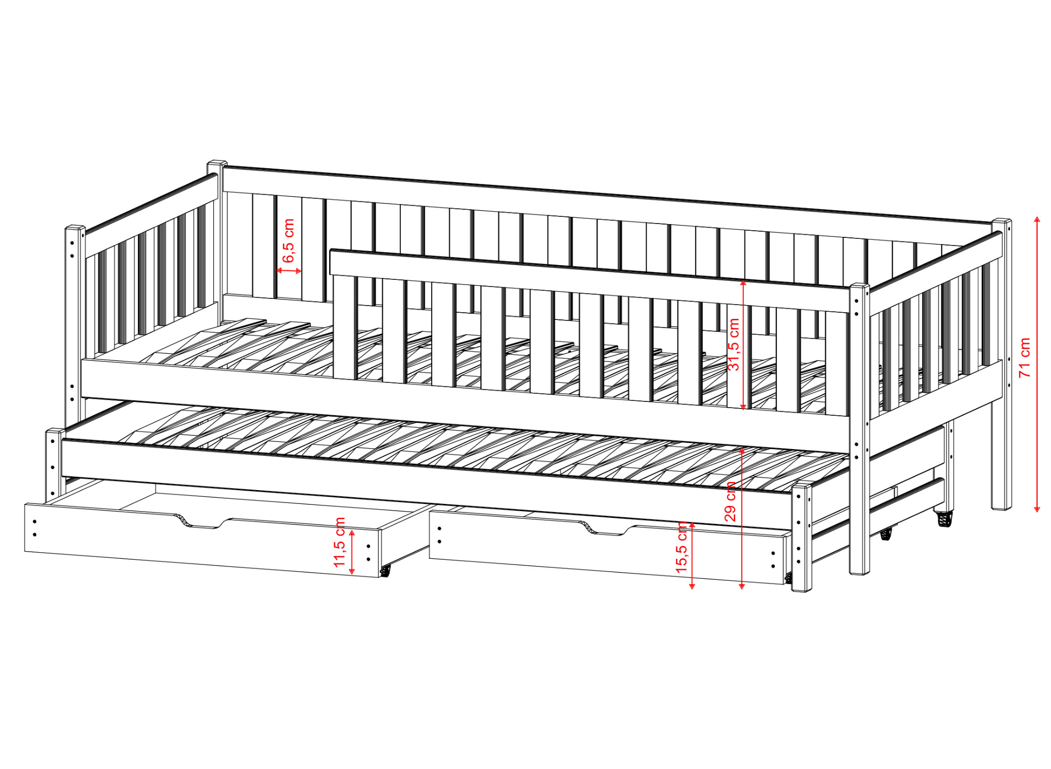 Le lit pour enfant COLA est équipé de deux tiroirs profonds, discrètement intégrés sous le niveau inférieur. C’est l’endroit parfait pour le linge de lit de rechange, les vêtements de saison, les jouets préférés ou tout ce qui finit habituellement « quelque part sous le lit ». Grâce à eux, il est plus facile de garder la chambre en ordre, sans ajouter de meubles supplémentaires. Les tiroirs sous le lit sont simples à utiliser, même pour les enfants – un seul geste suffit pour ranger ou sortir quelque chose. Le lit pour enfant COLA enseigne l’ordre tout en restant esthétique.