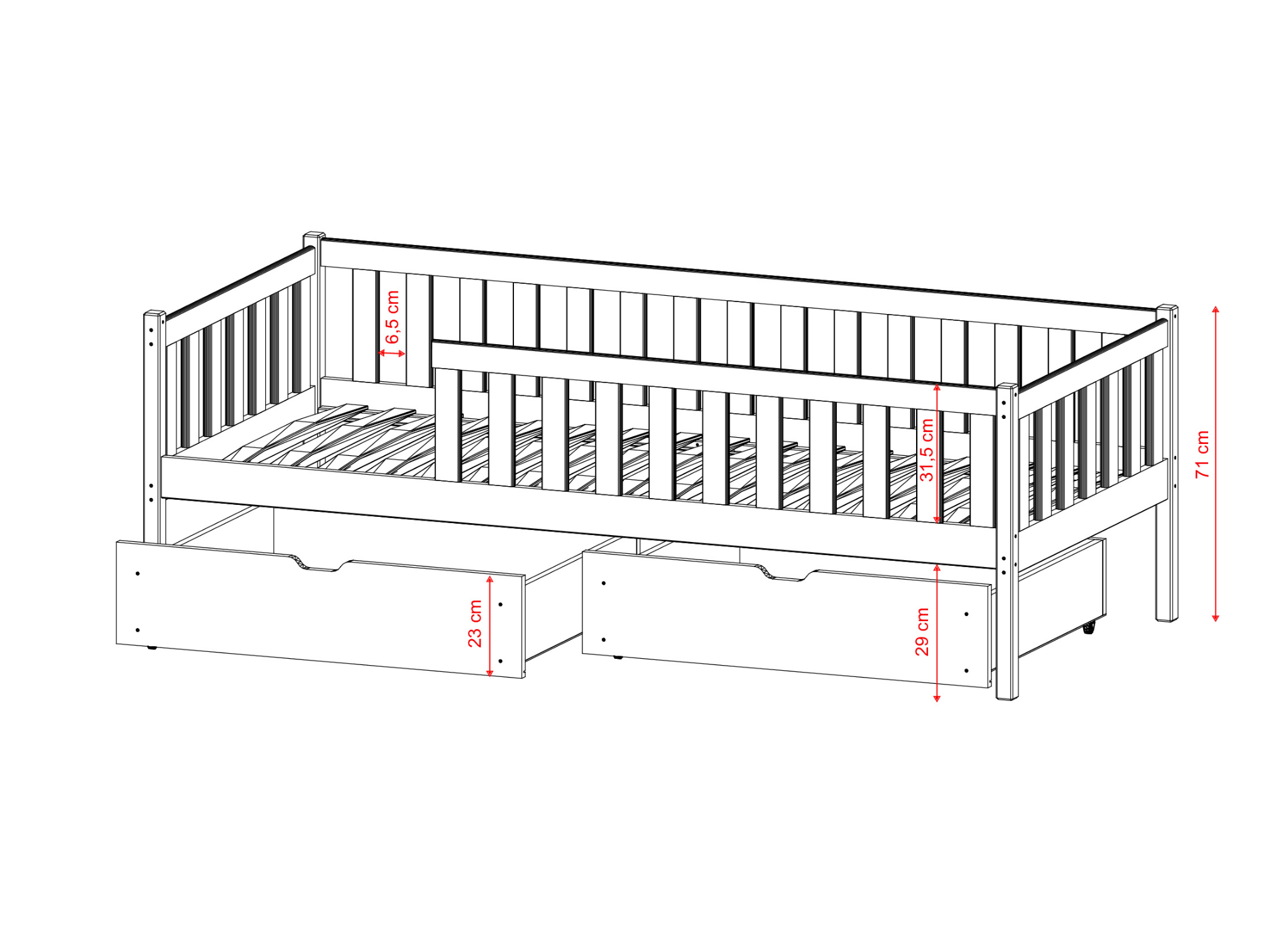 Le lit pour enfant ANTONIO est équipé de deux tiroirs spacieux – une solution de rangement pratique qui facilite le quotidien, tant pour l’enfant que pour les parents. Grâce à eux, tous les trésors de l’enfant – des peluches aux livres, en passant par les blocs de construction et le linge de lit de rechange – restent à portée de main, mais hors de vue. Les tiroirs situés sous le lit permettent de ranger rapidement la chambre sans avoir besoin de paniers, boîtes ou commodes supplémentaires. L’enfant peut y ranger et reprendre ses affaires de manière autonome, ce qui l’aide à développer des habitudes quotidiennes et un sens des responsabilités. Les tiroirs ont été conçus pour ne pas gêner le jeu et ne pas limiter la liberté de mouvement. La structure élancée du lit ANTONIO sur de hauts pieds renforce cette impression de légèreté et n’encombre pas la pièce – même la plus petite. ANTONIO, c’est une alliance harmonieuse entre esthétique, ergonomie et fonctionnalité.