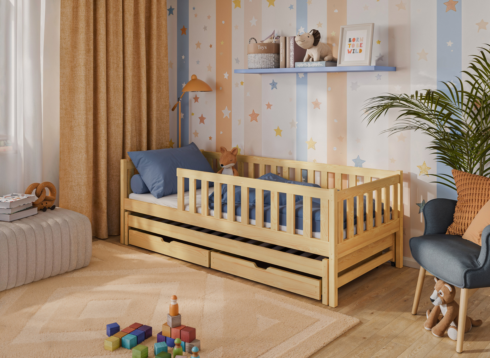 Le lit pour enfant COLA est équipé de deux tiroirs profonds, discrètement intégrés sous le niveau inférieur. C’est l’endroit parfait pour le linge de lit de rechange, les vêtements de saison, les jouets préférés ou tout ce qui finit habituellement « quelque part sous le lit ». Grâce à eux, il est plus facile de garder la chambre en ordre, sans ajouter de meubles supplémentaires. Les tiroirs sous le lit sont simples à utiliser, même pour les enfants – un seul geste suffit pour ranger ou sortir quelque chose. Le lit pour enfant COLA enseigne l’ordre tout en restant esthétique.